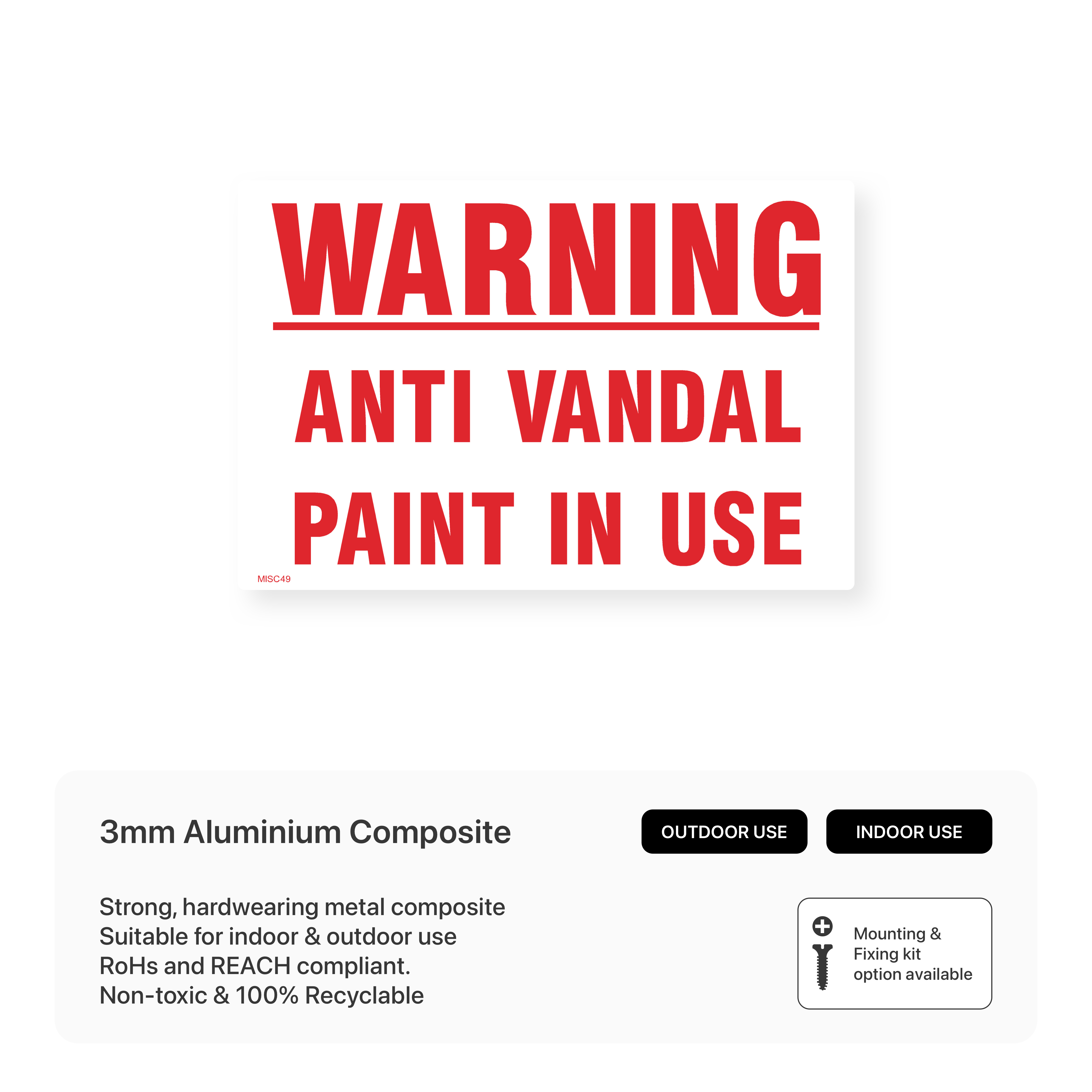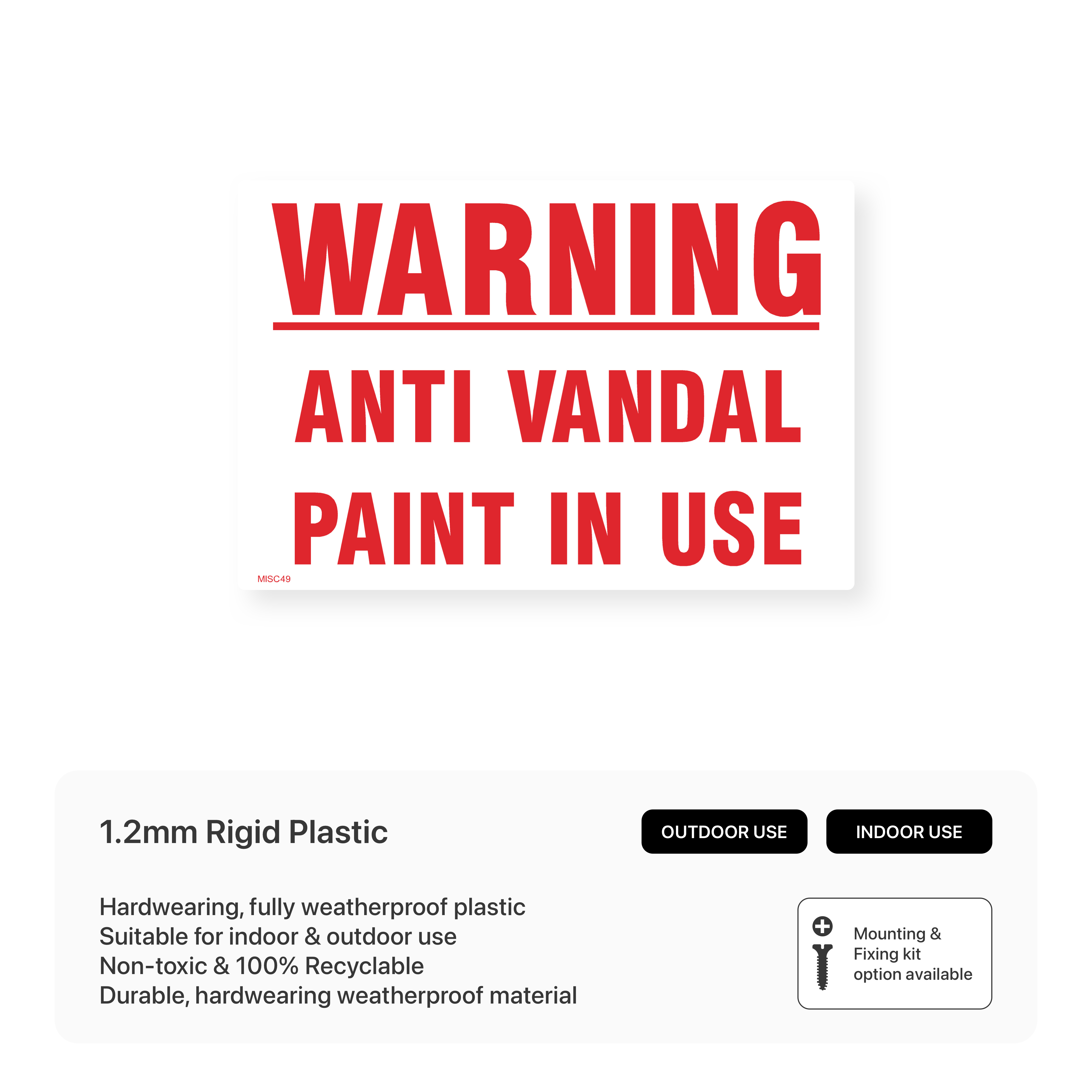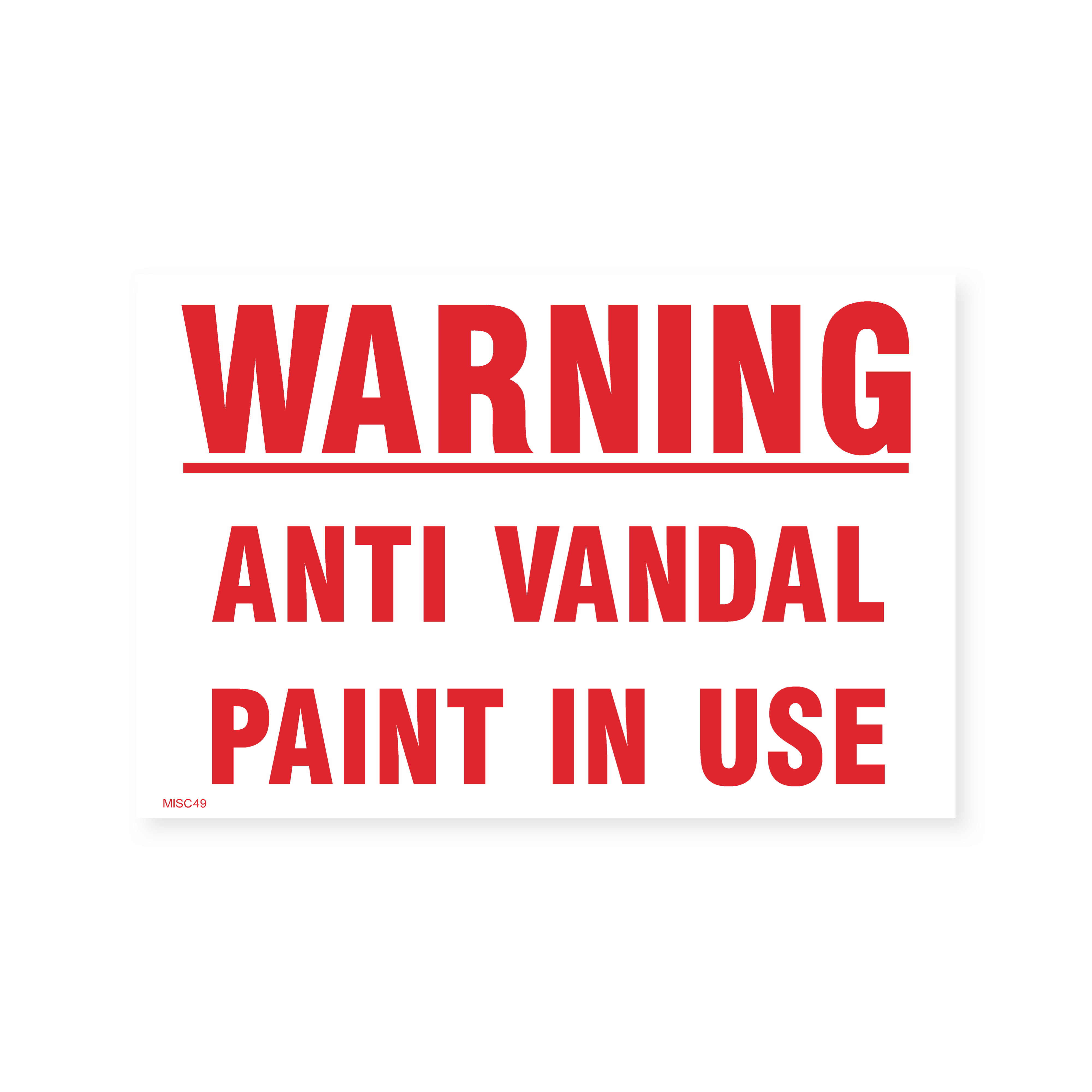 Deter vandalism and protect your property with our "Anti-Vandal Paint in Use" signs. These clear warnings serve as a powerful deterrent and help maintain the appearance of your premises. Available in various sizes and materials.