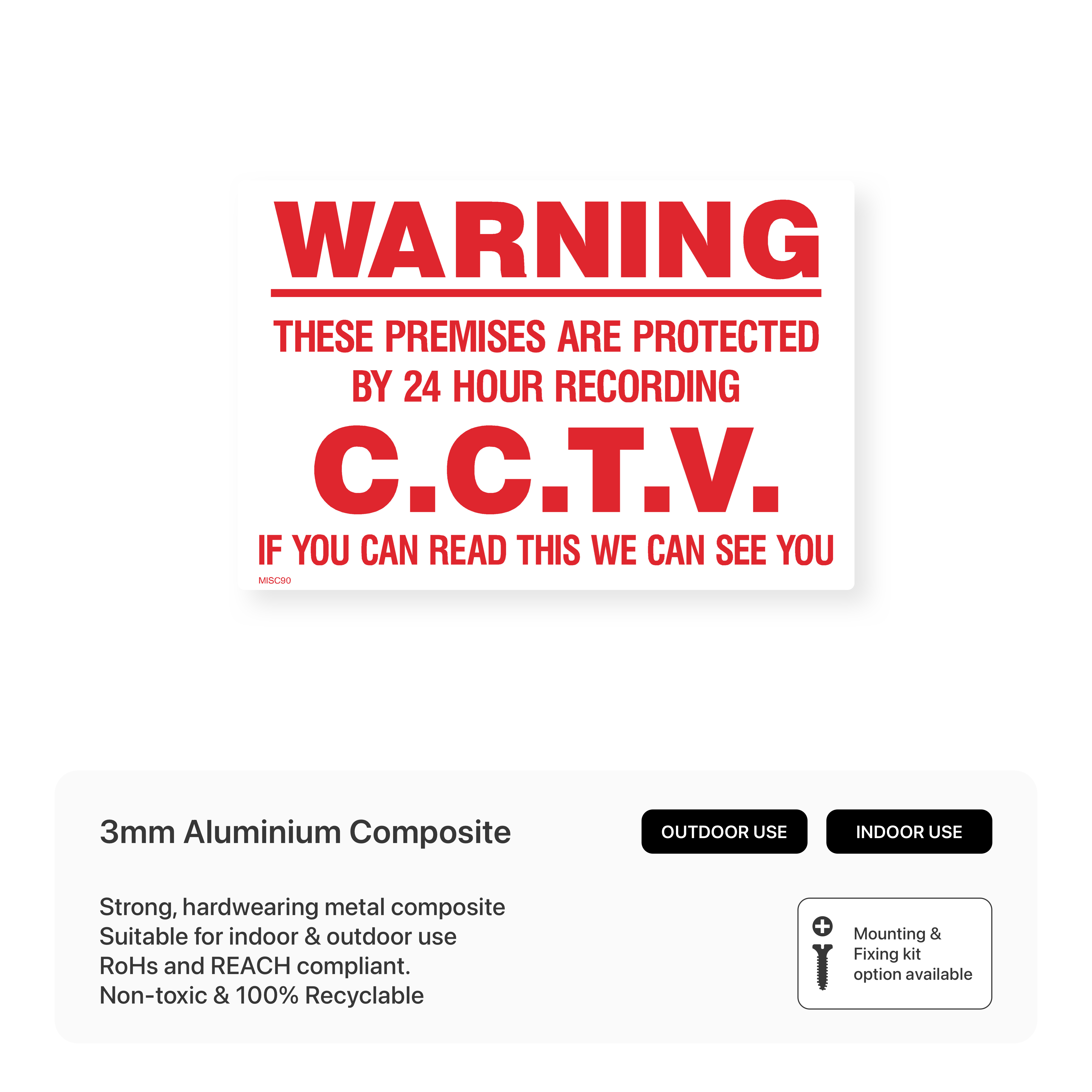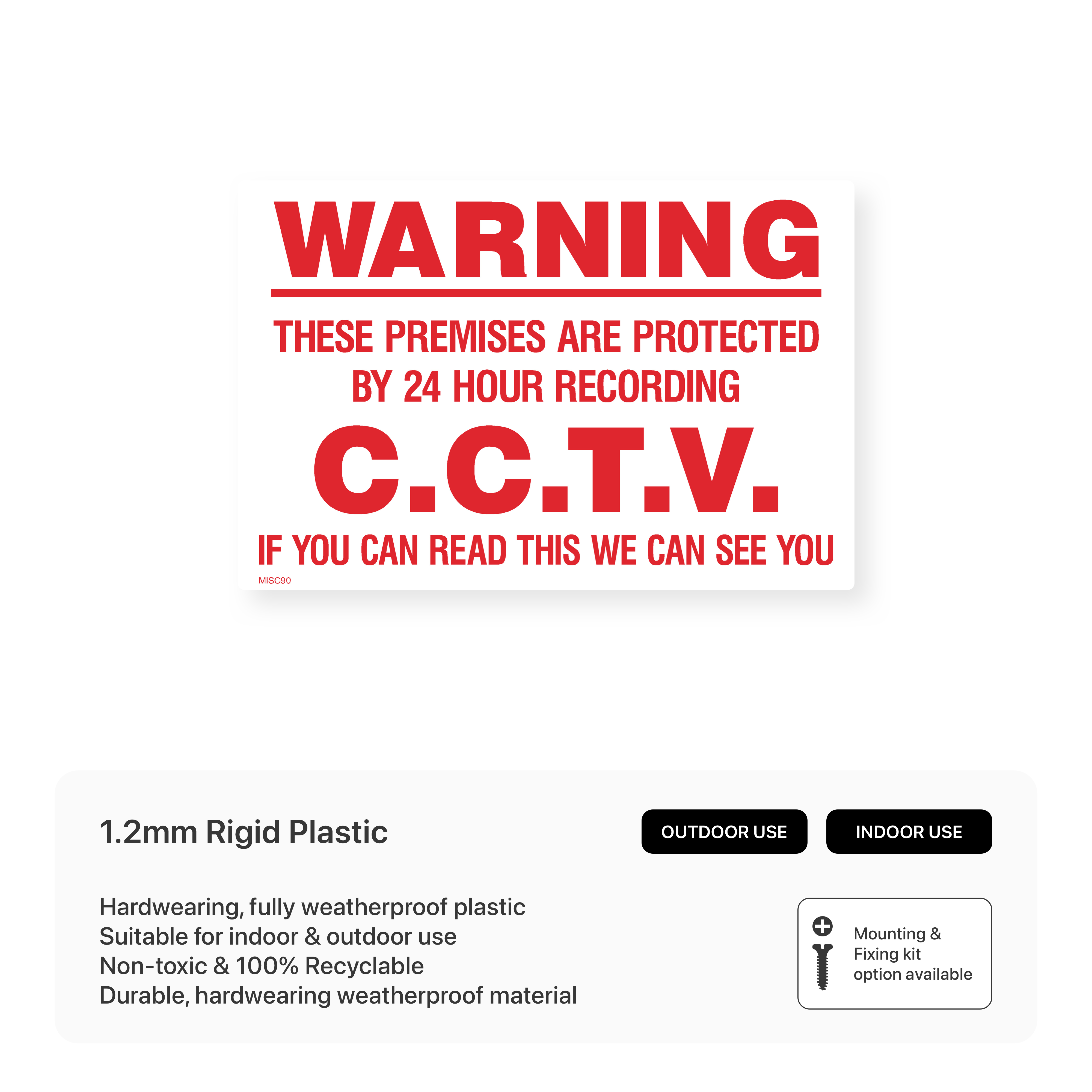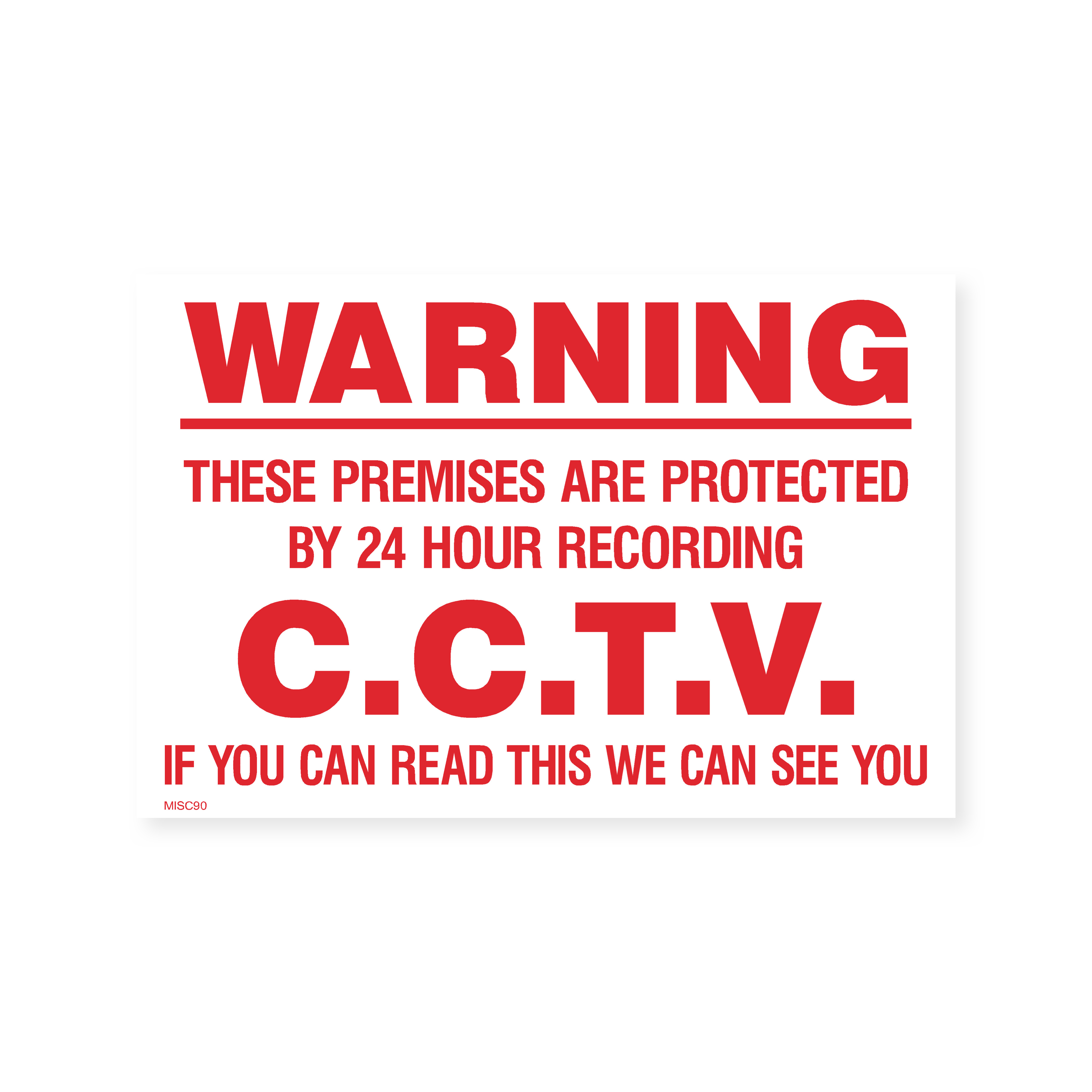 Enhance security and deter crime with our bold and eye-catching CCTV warning signs. Featuring the message "THESE PREMISES ARE PROTECTED BY A 24 HOUR RECORDING C.C.T.V. - IF YOU CAN READ THIS WE CAN SEE YOU," these signs clearly communicate that the area is under constant surveillance. Choose from a range of sizes and materials to best suit your needs.