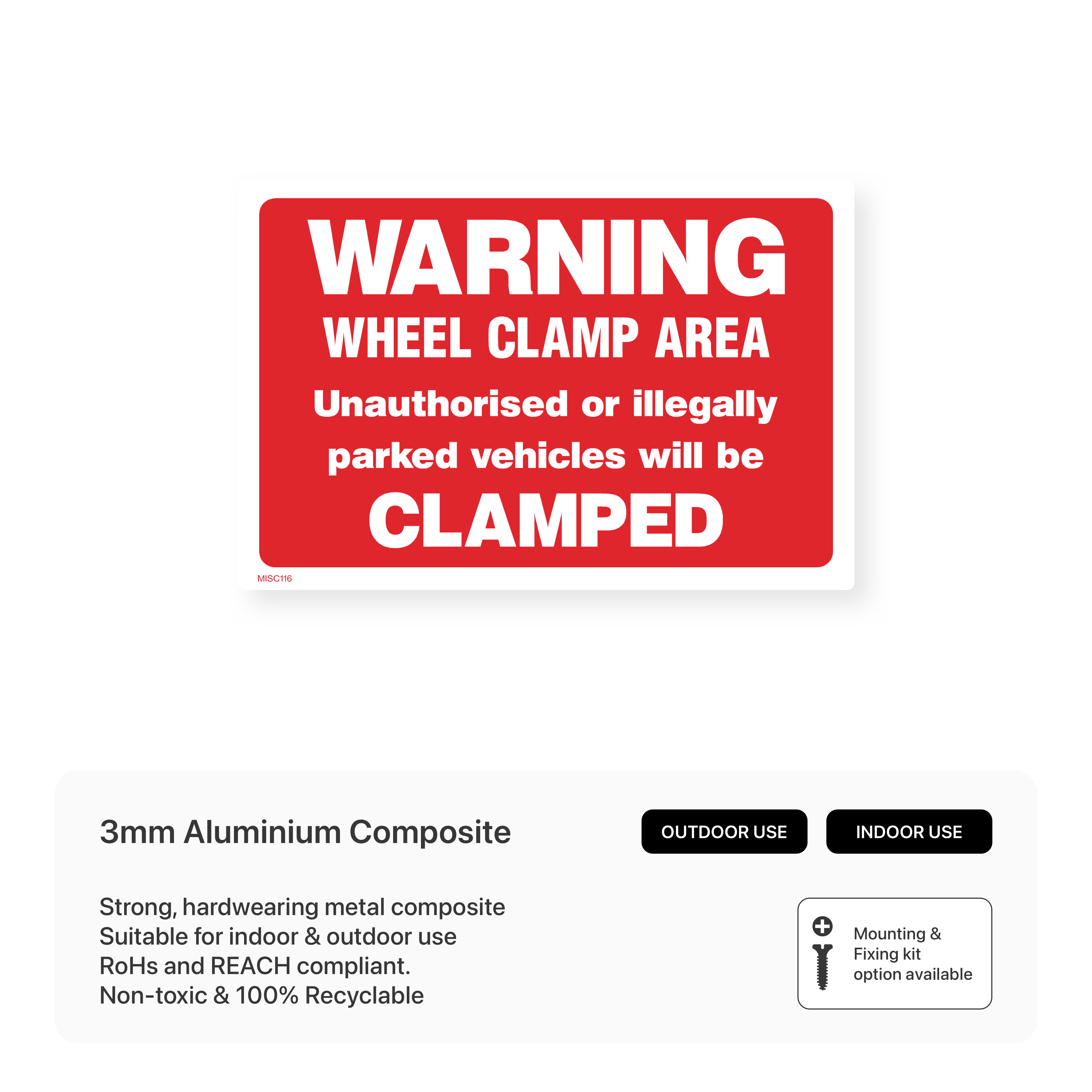 Deter unauthorized or illegal parking with our "Wheel Clamp Area" signs. Clearly warn drivers that their vehicles will be clamped if parked improperly. Available in various sizes and materials for maximum visibility.