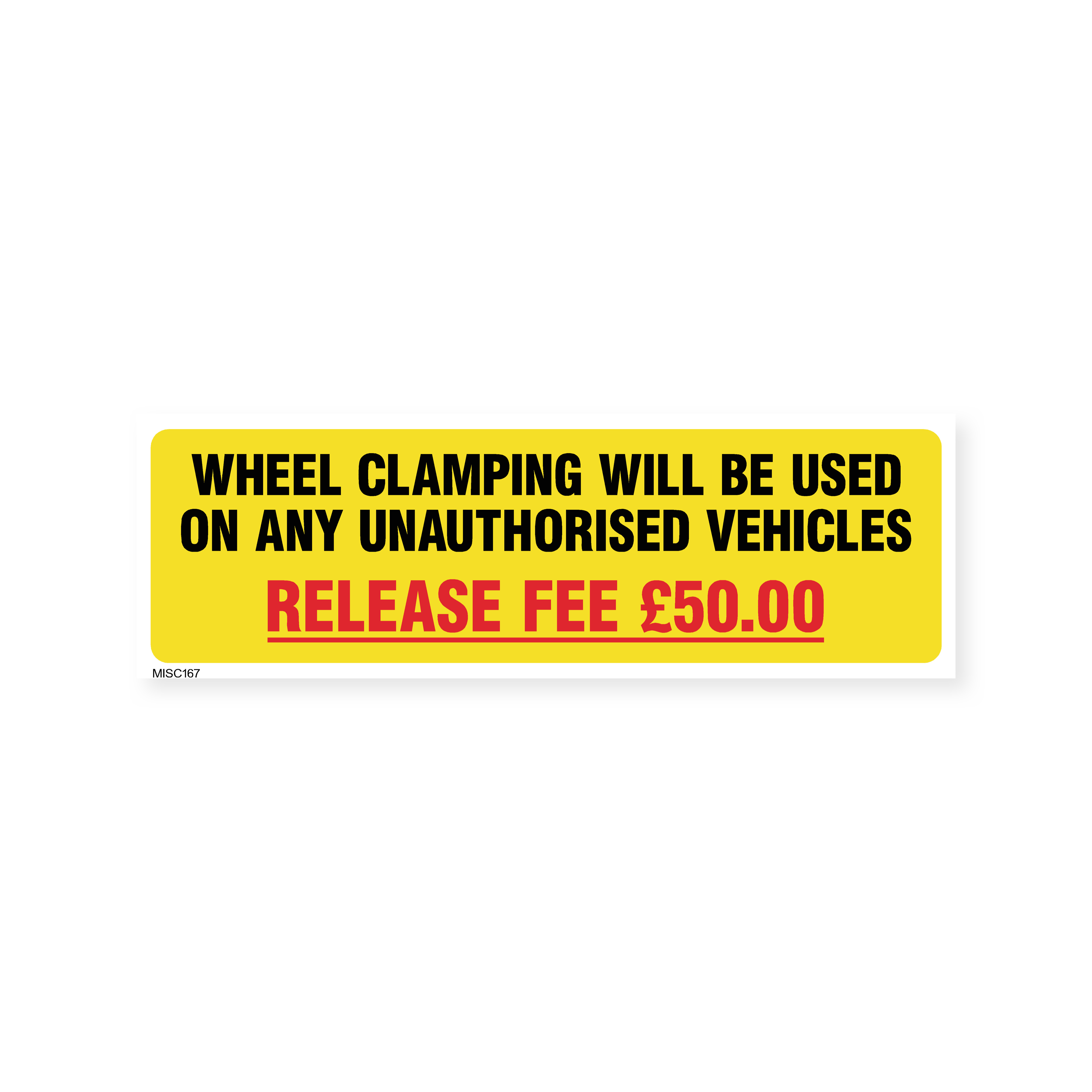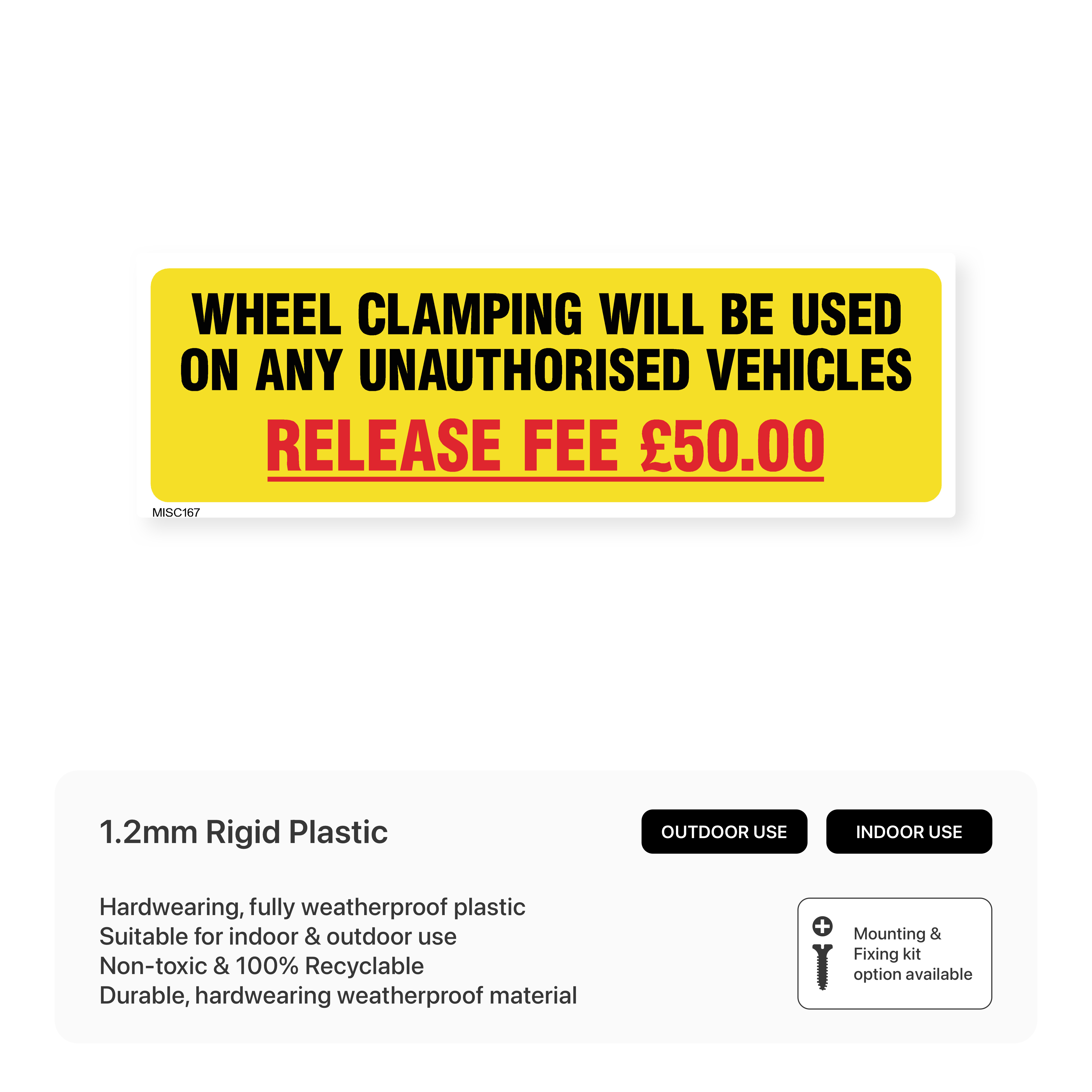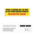 Deter illegal parking with our "Wheel Clamping Will Be Used" signs. Clearly communicate the consequences of unauthorized parking and the £50 release fee.