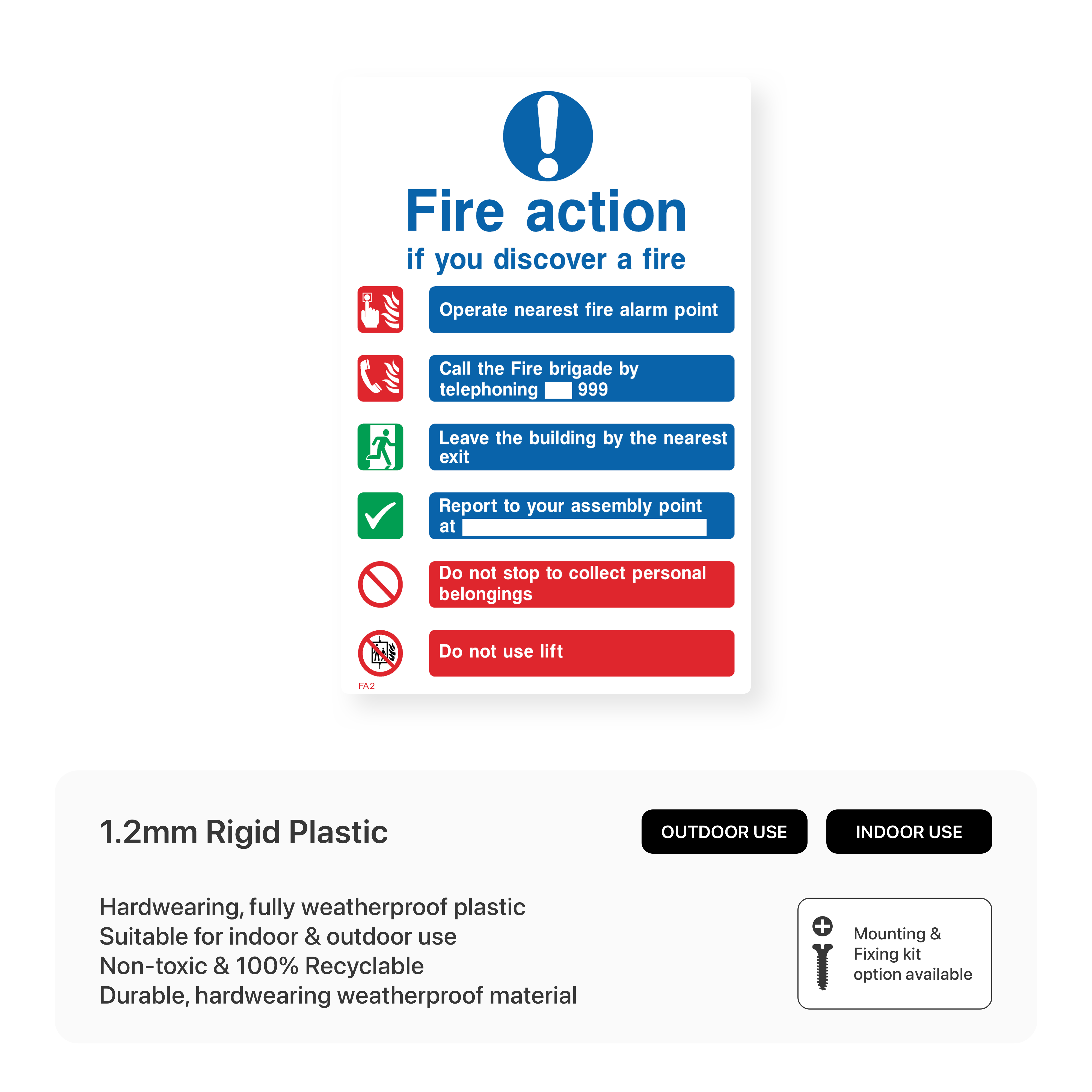 Ensure prompt emergency response with our "Fire Action - Call the fire brigade" sign. This sign clearly instructs individuals to immediately call the fire brigade in case of a fire, saving valuable time and potentially lives.