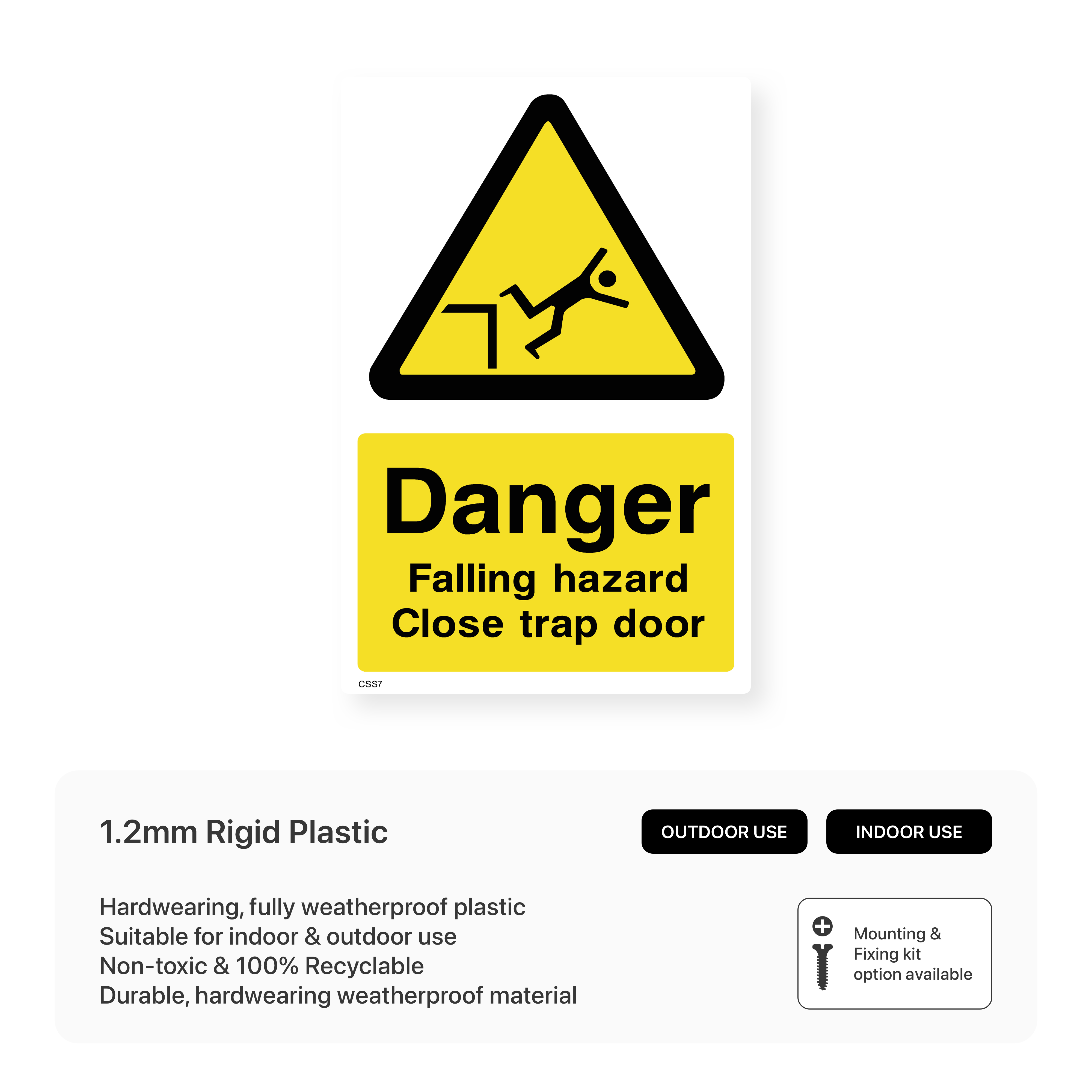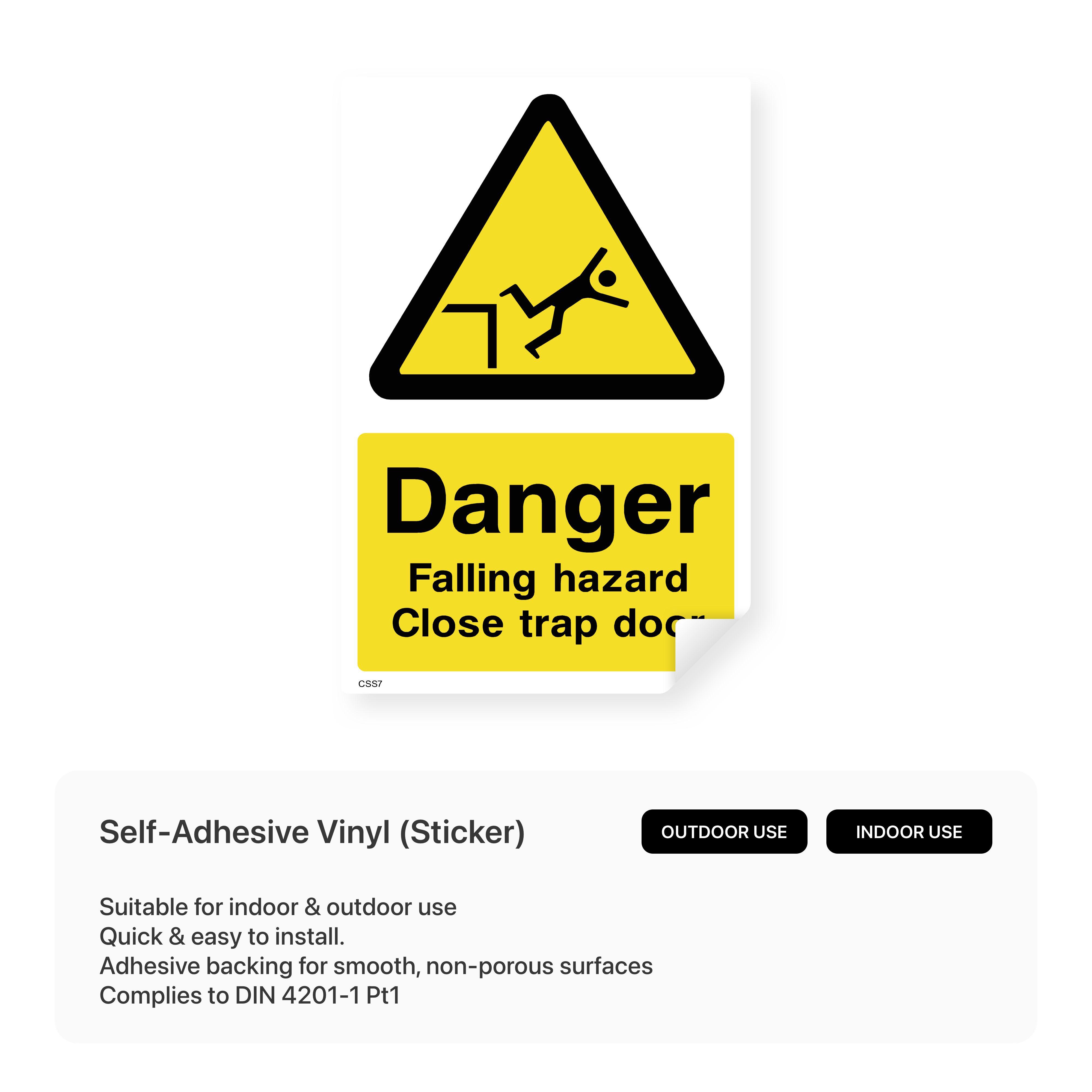 Promote vigilance and prevent falls with our "Danger Falling hazard - close trap door" sign. Remind workers to secure trap doors and reduce the risk of accidents in areas with potential fall hazards.