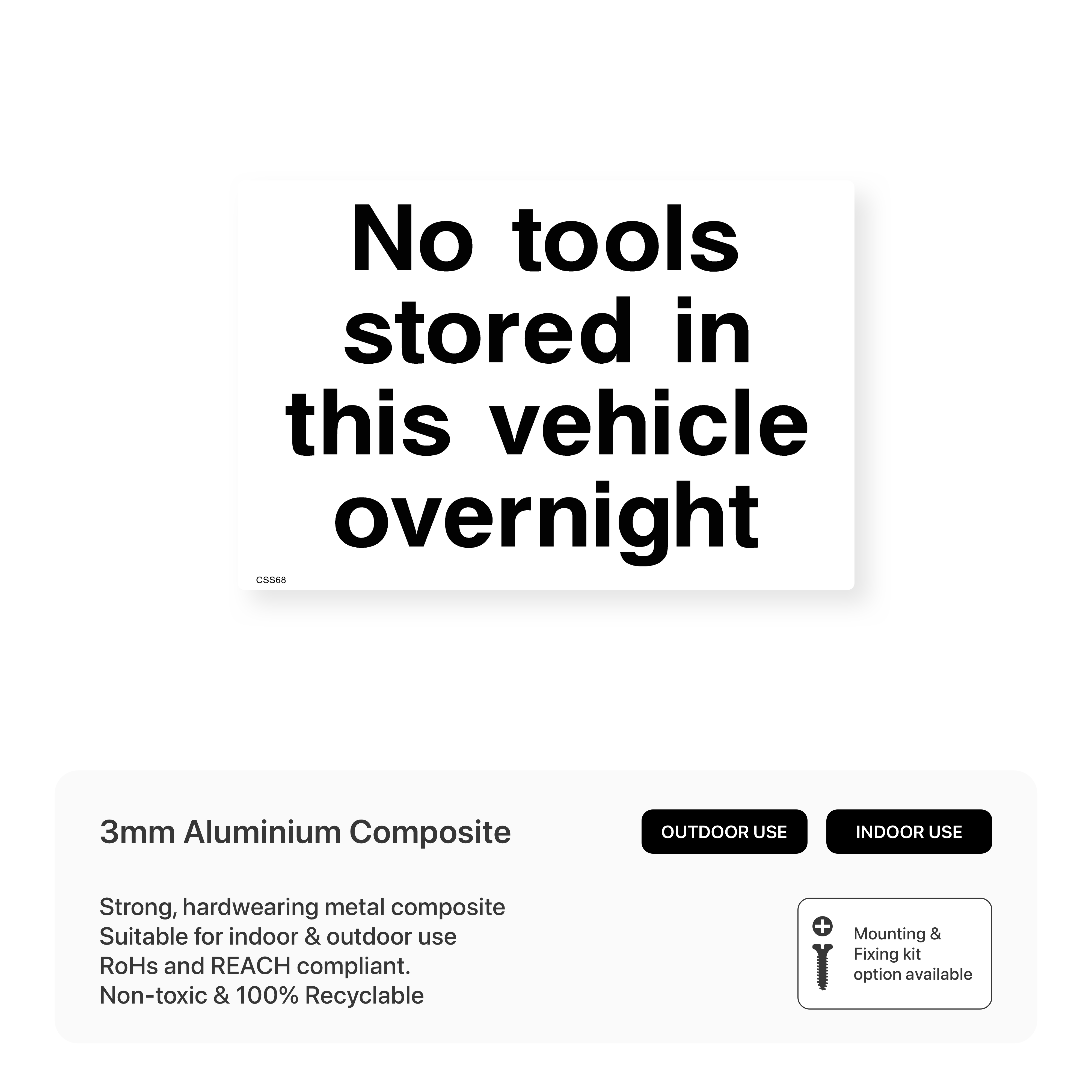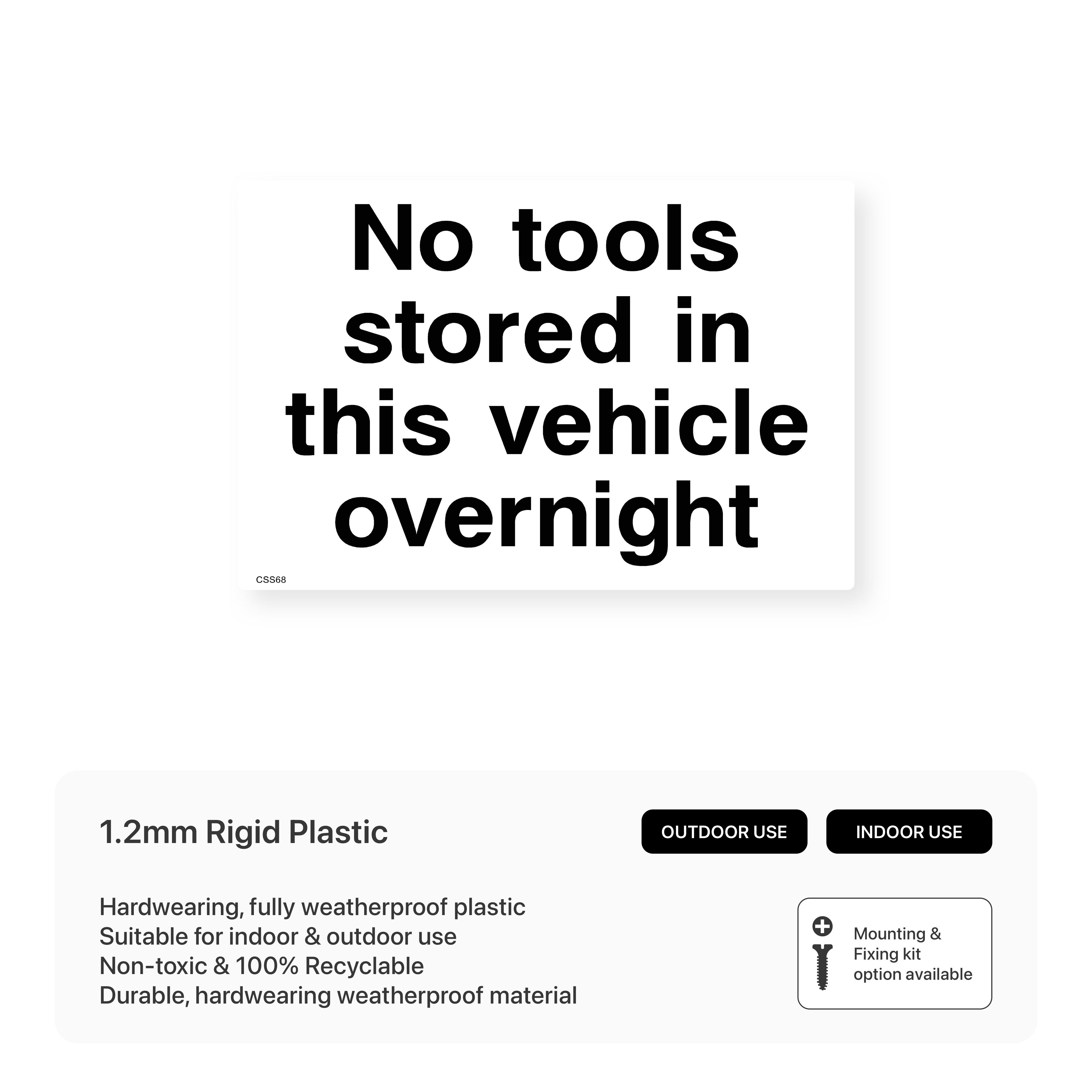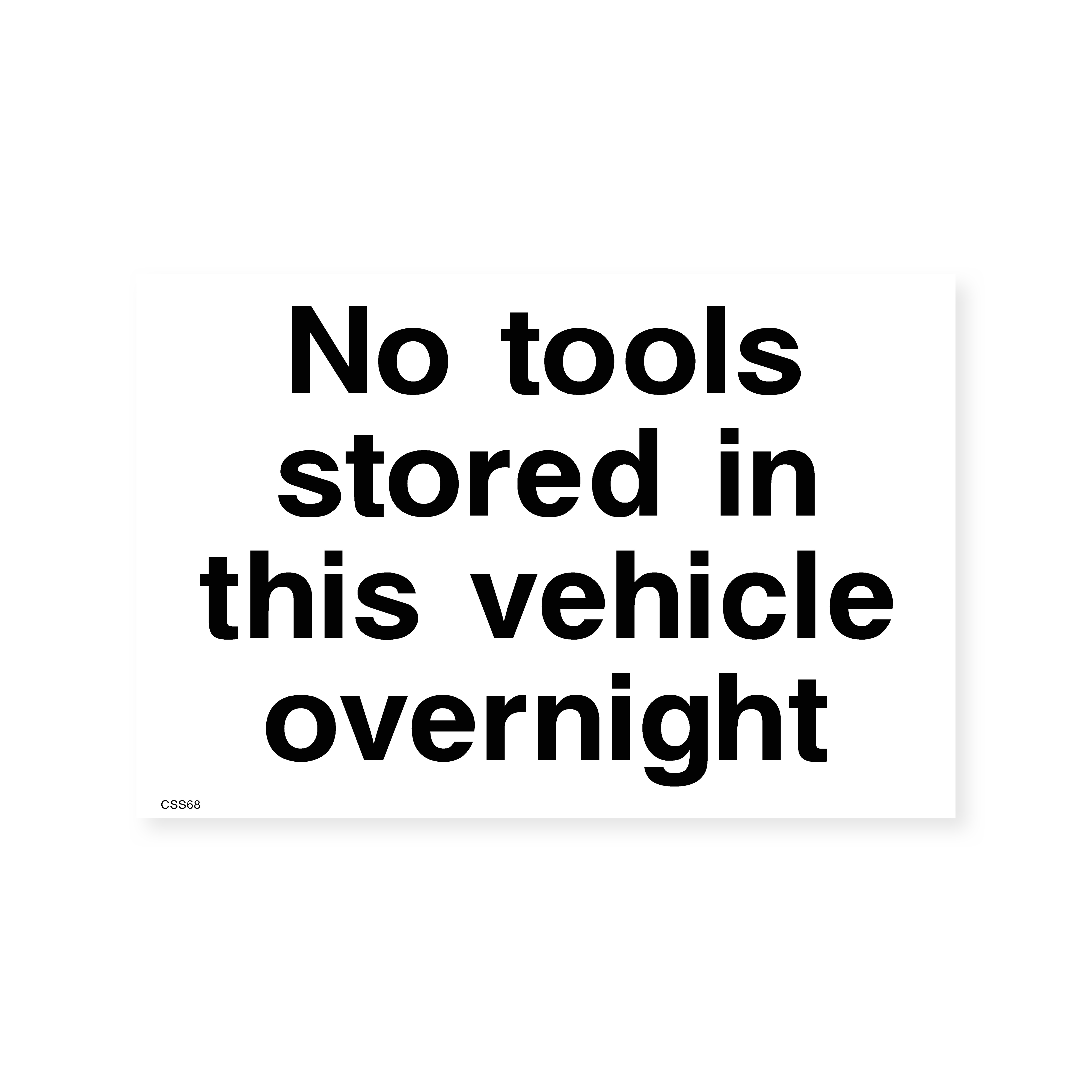 Protect your tools and equipment with our "No tools stored in this vehicle overnight" sign. Clearly communicate this policy to prevent theft and ensure the security of your valuable assets on the construction site.