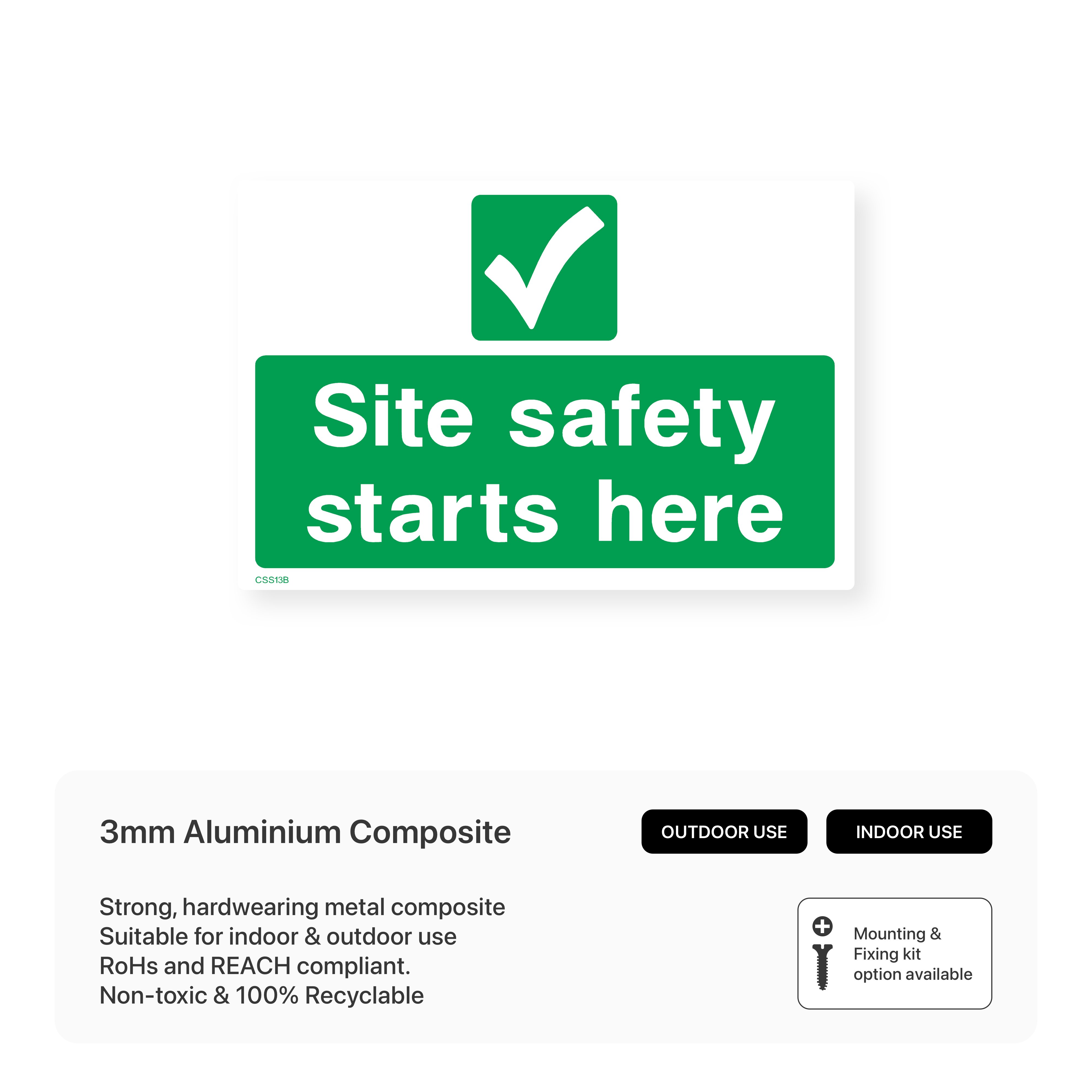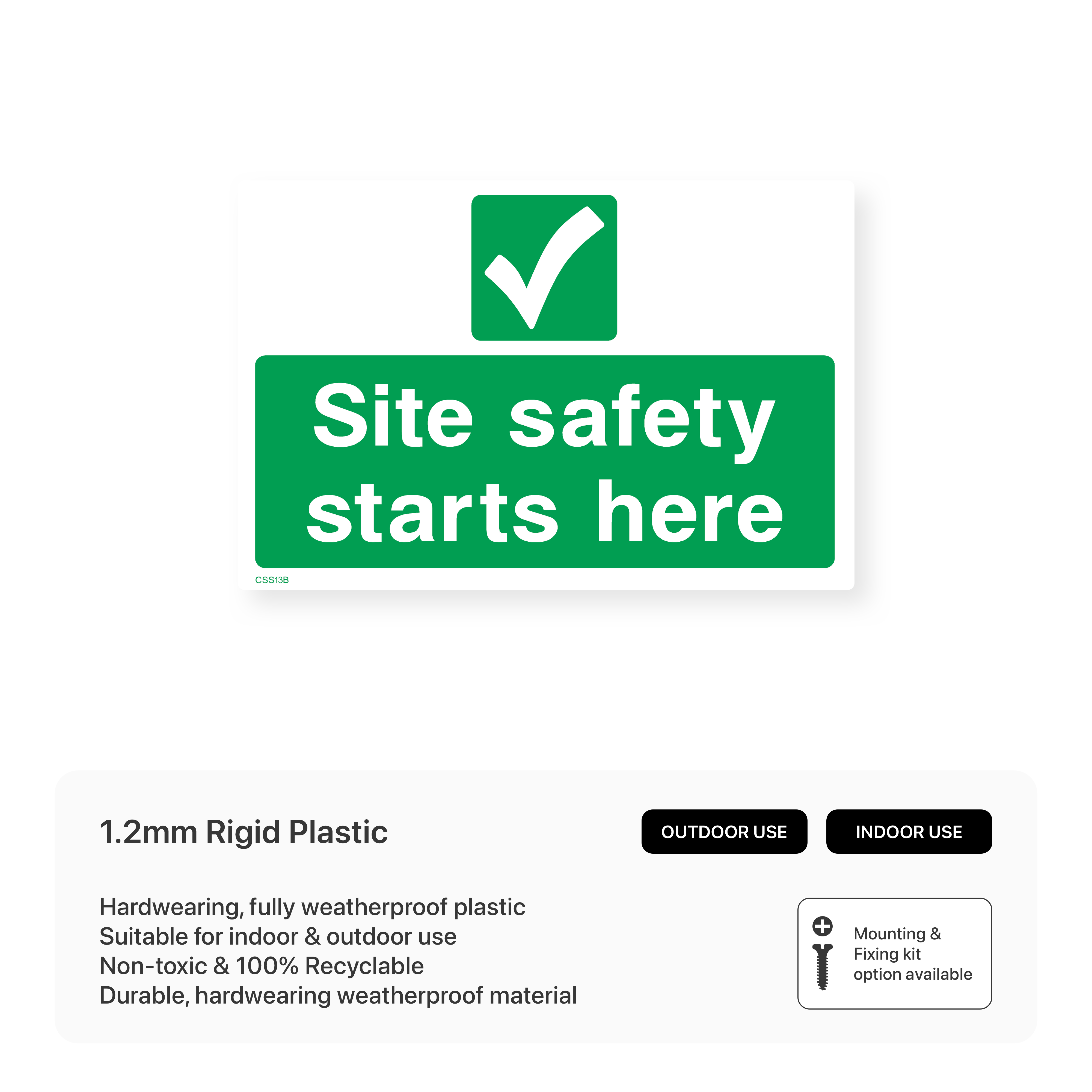 Establish a strong safety culture with our "Site safety starts here" sign. Place this sign at the entrance of your construction site to remind everyone entering that safety is a top priority and that they have a role to play in maintaining a safe work environment.