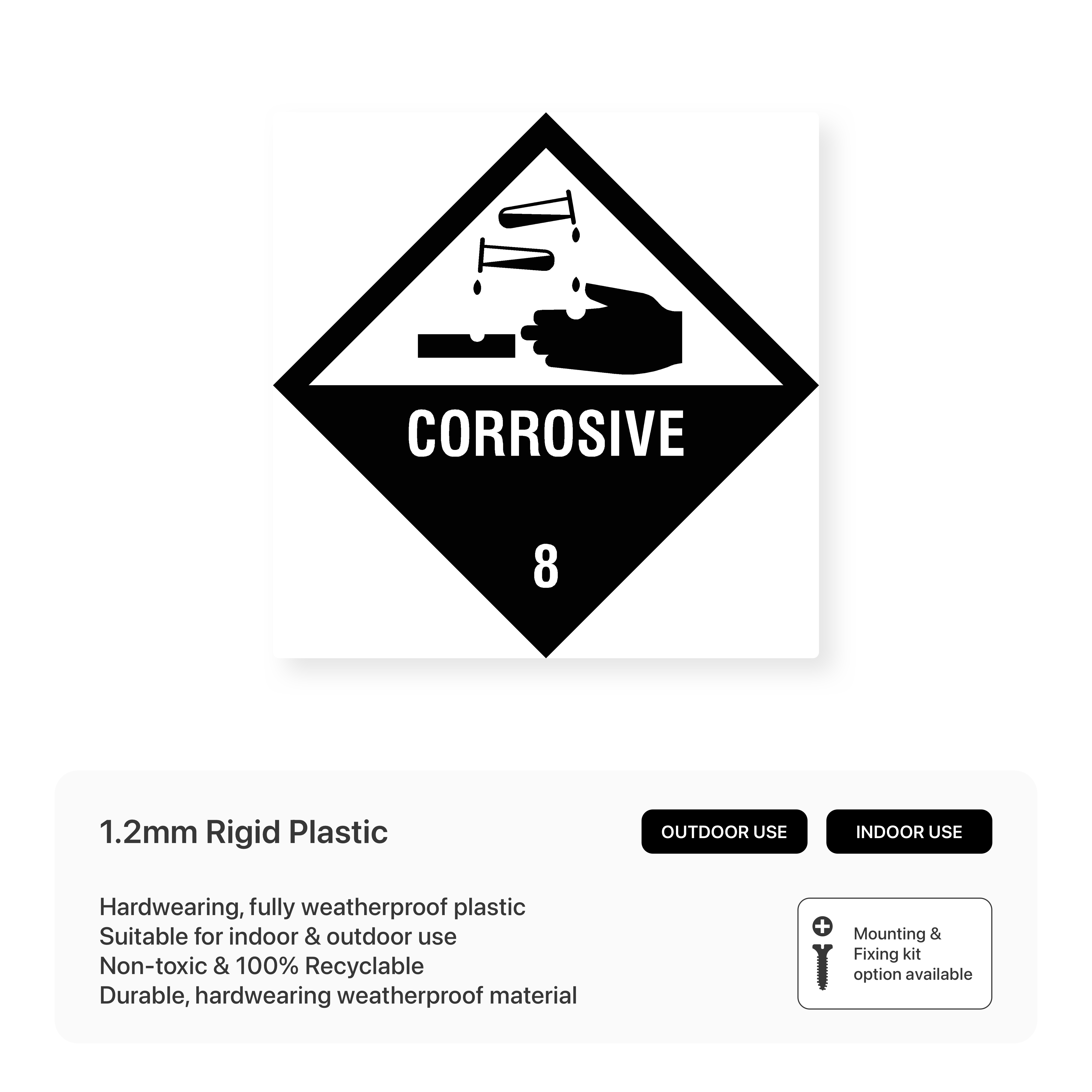 Clearly identify corrosive substances with our "Corrosive 8 - Hazchem" sign. This sign communicates the specific hazards associated with corrosive substances, promoting safe handling, storage, and use to prevent injuries and damage.