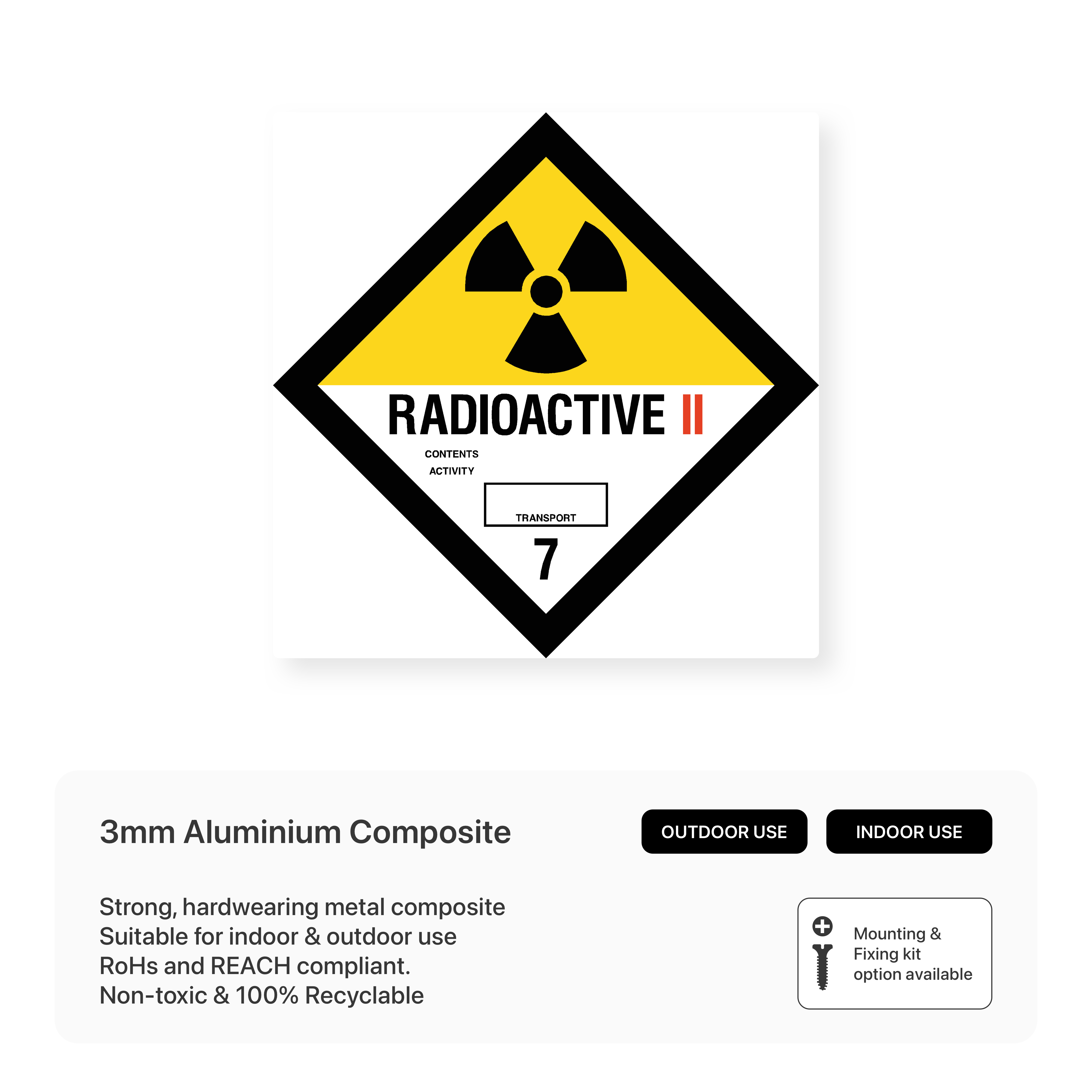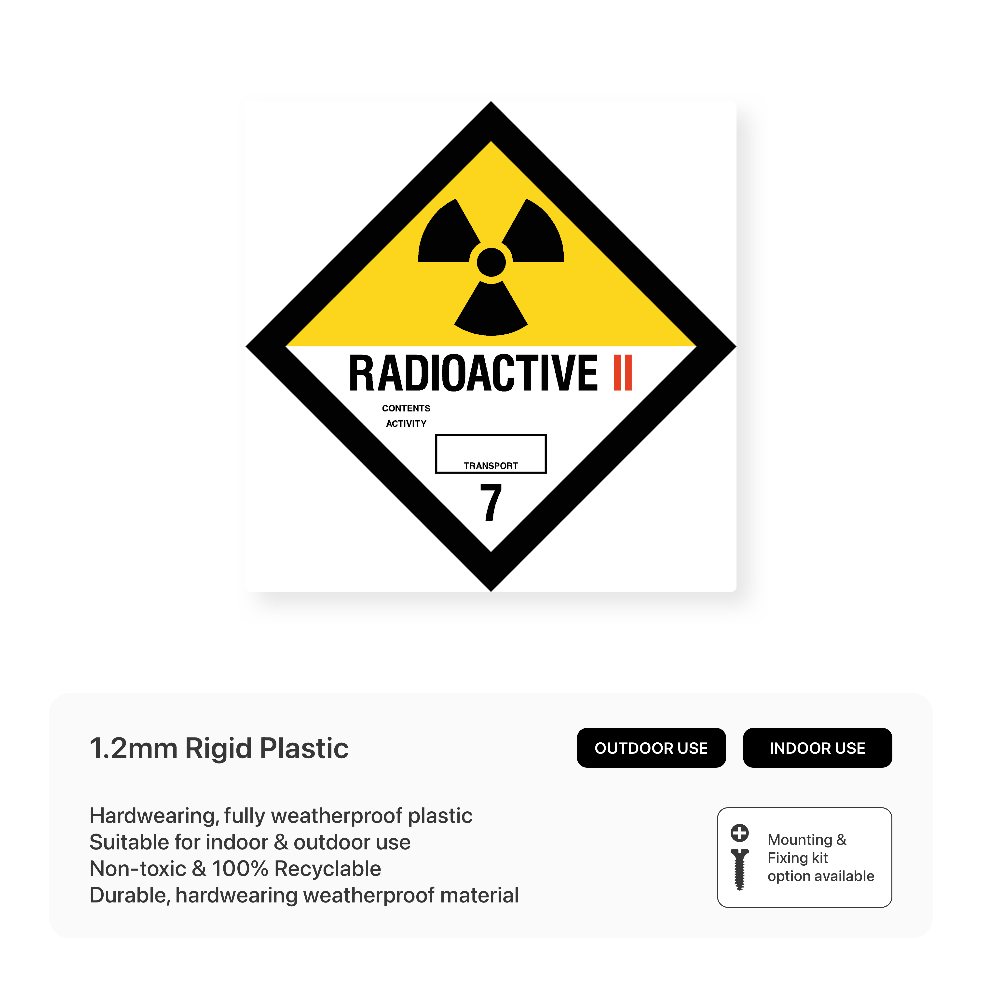 Warn of radioactive hazards with our "Radioactive II 7 - Hazchem" sign. This sign clearly communicates the specific hazards associated with radioactive materials, ensuring proper handling, storage, and disposal to protect people and the environment.
