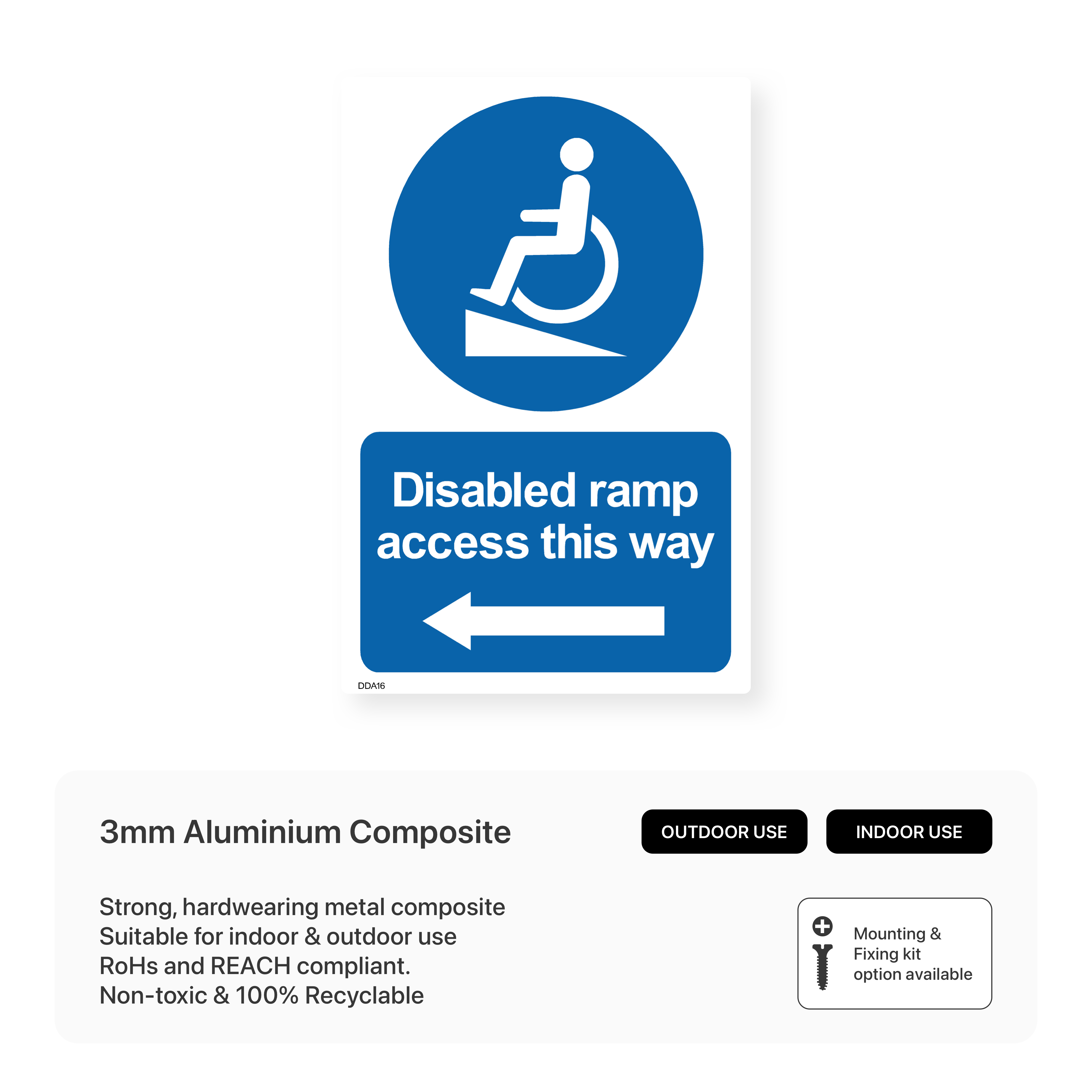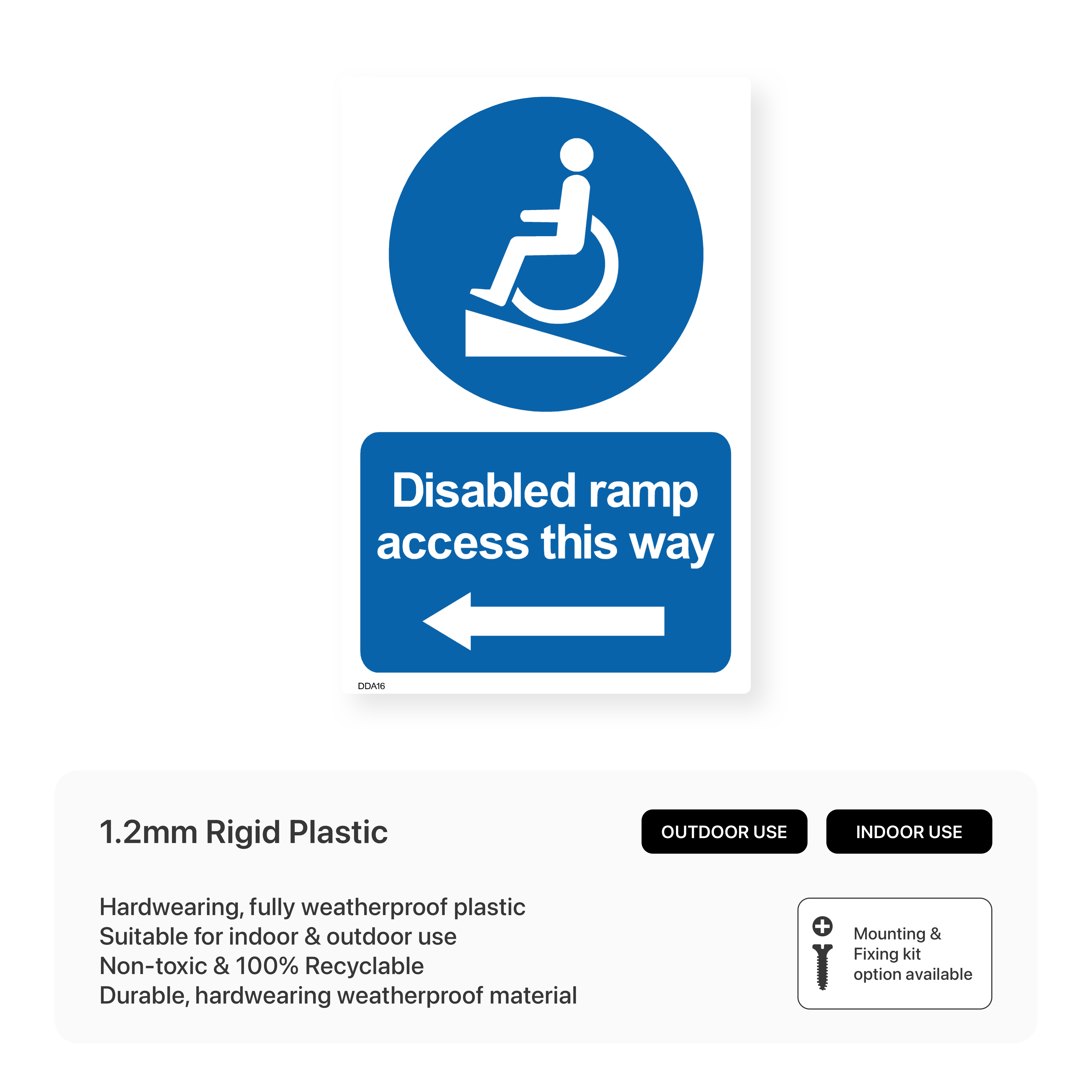 Guide individuals with disabilities to accessible ramps with our "Disabled ramp access this way - Left arrow" sign. This directional sign clearly indicates the location of the ramp and the direction to access it, promoting ease of use and accessibility.