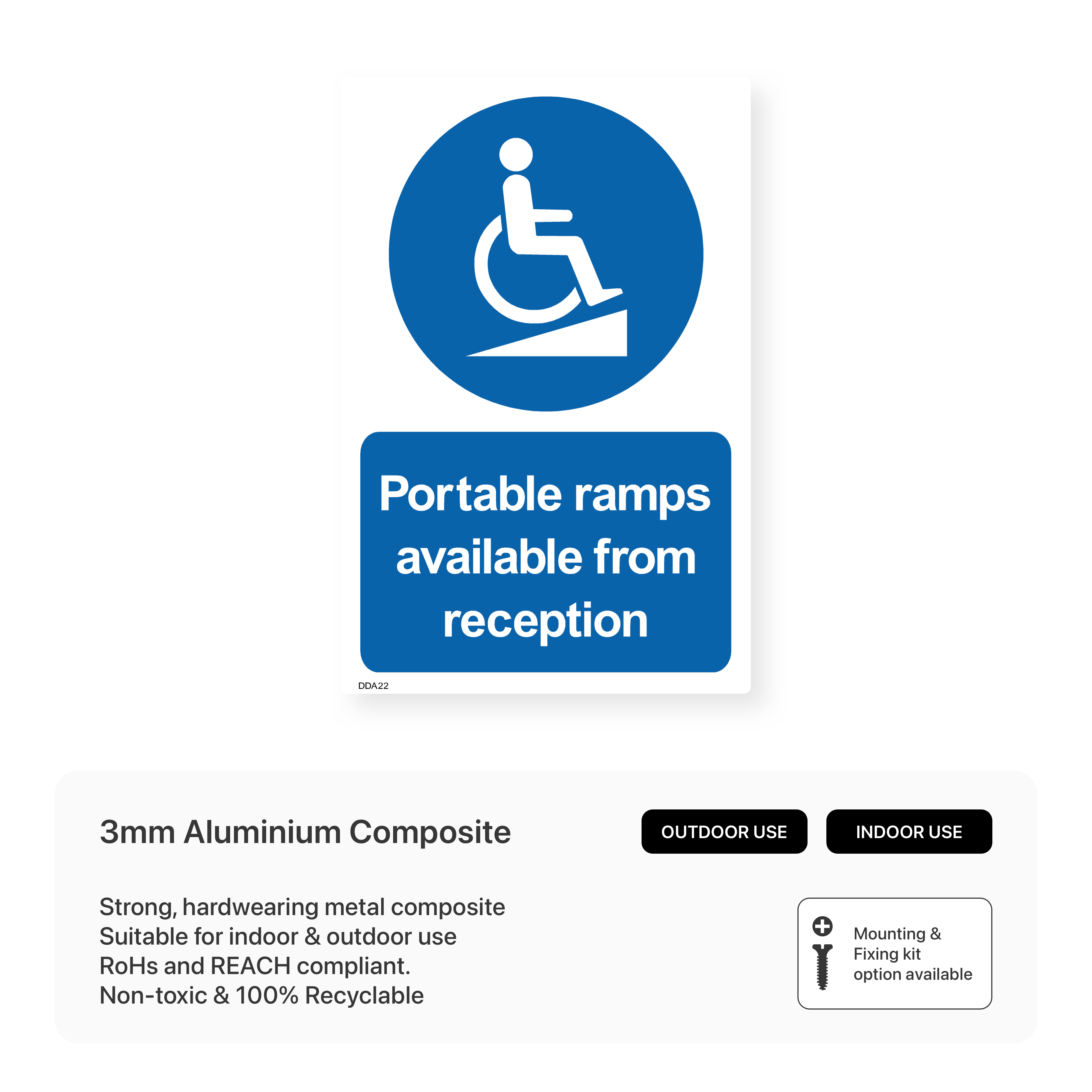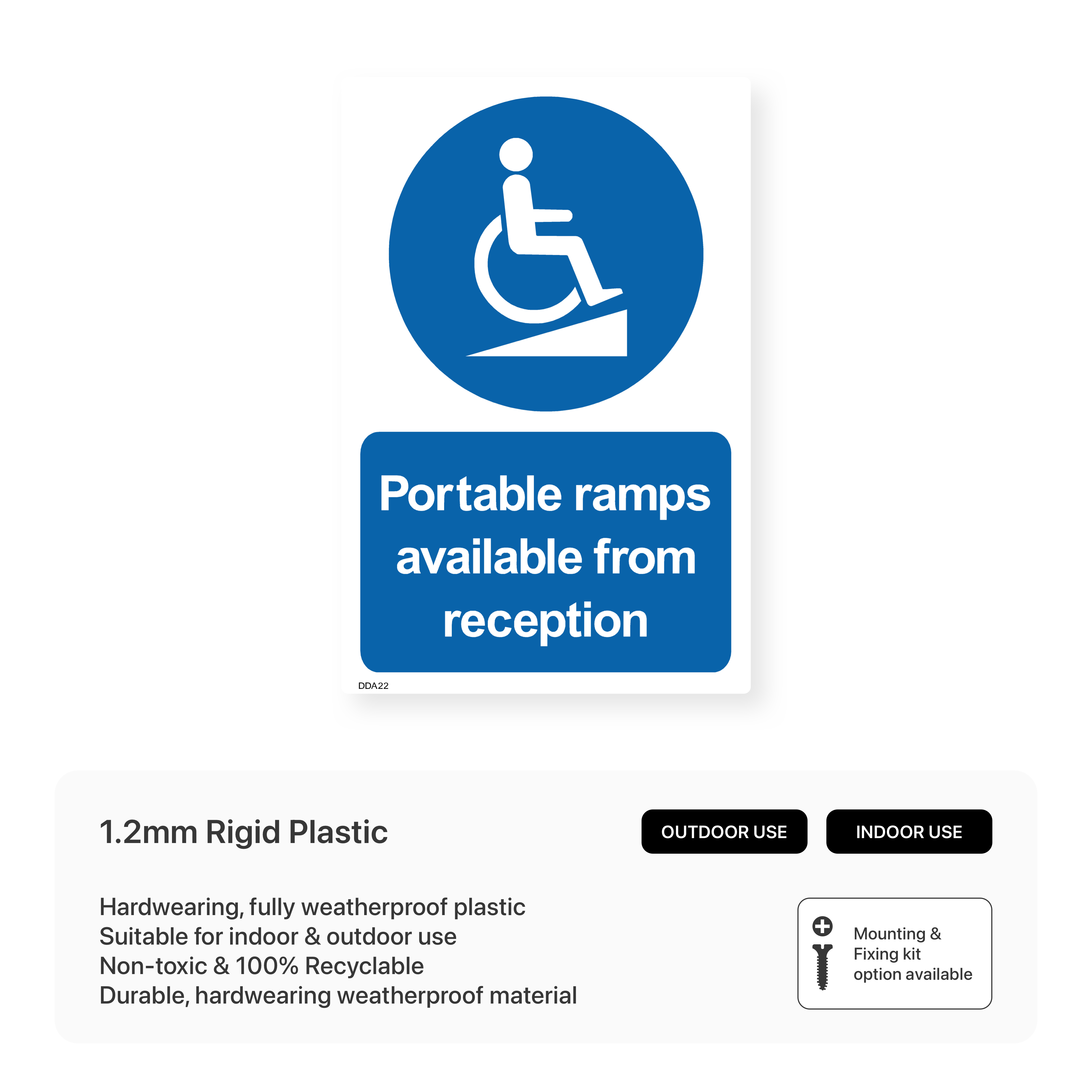 Ensure accessibility for everyone with our "Portable ramps available from reception" sign. This sign informs individuals that portable ramps are available for use upon request, promoting inclusivity and ease of access for wheelchair users and those with mobility impairments.
