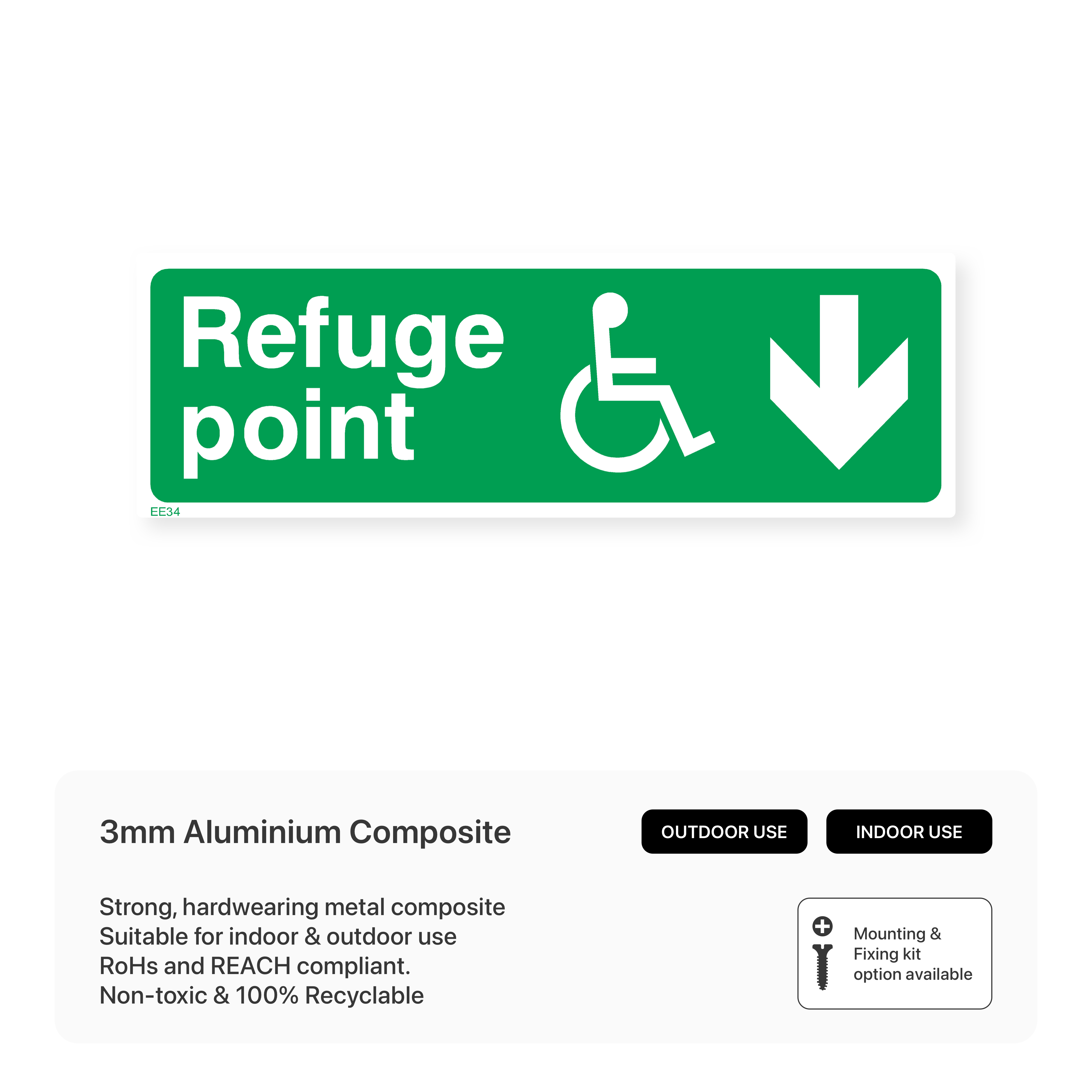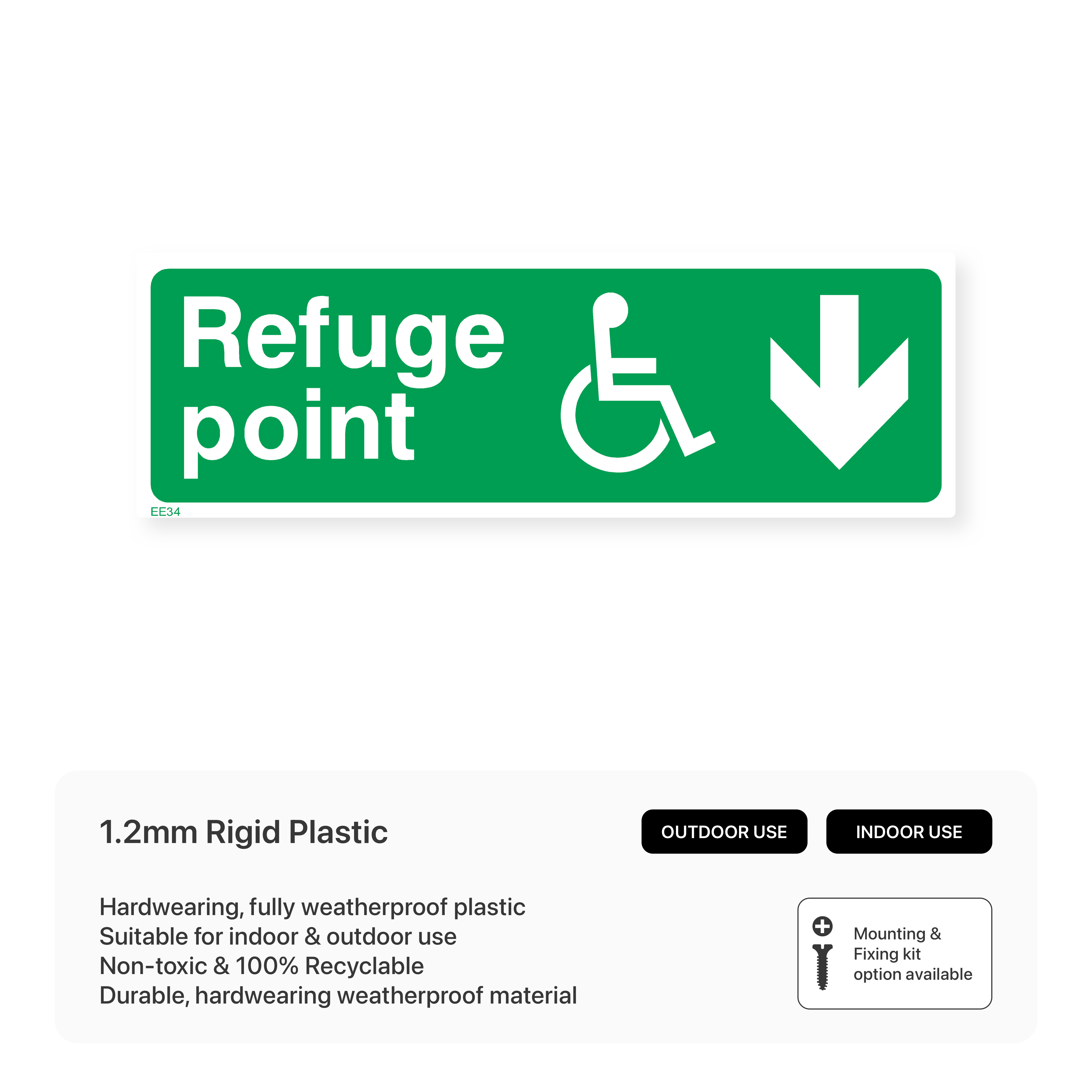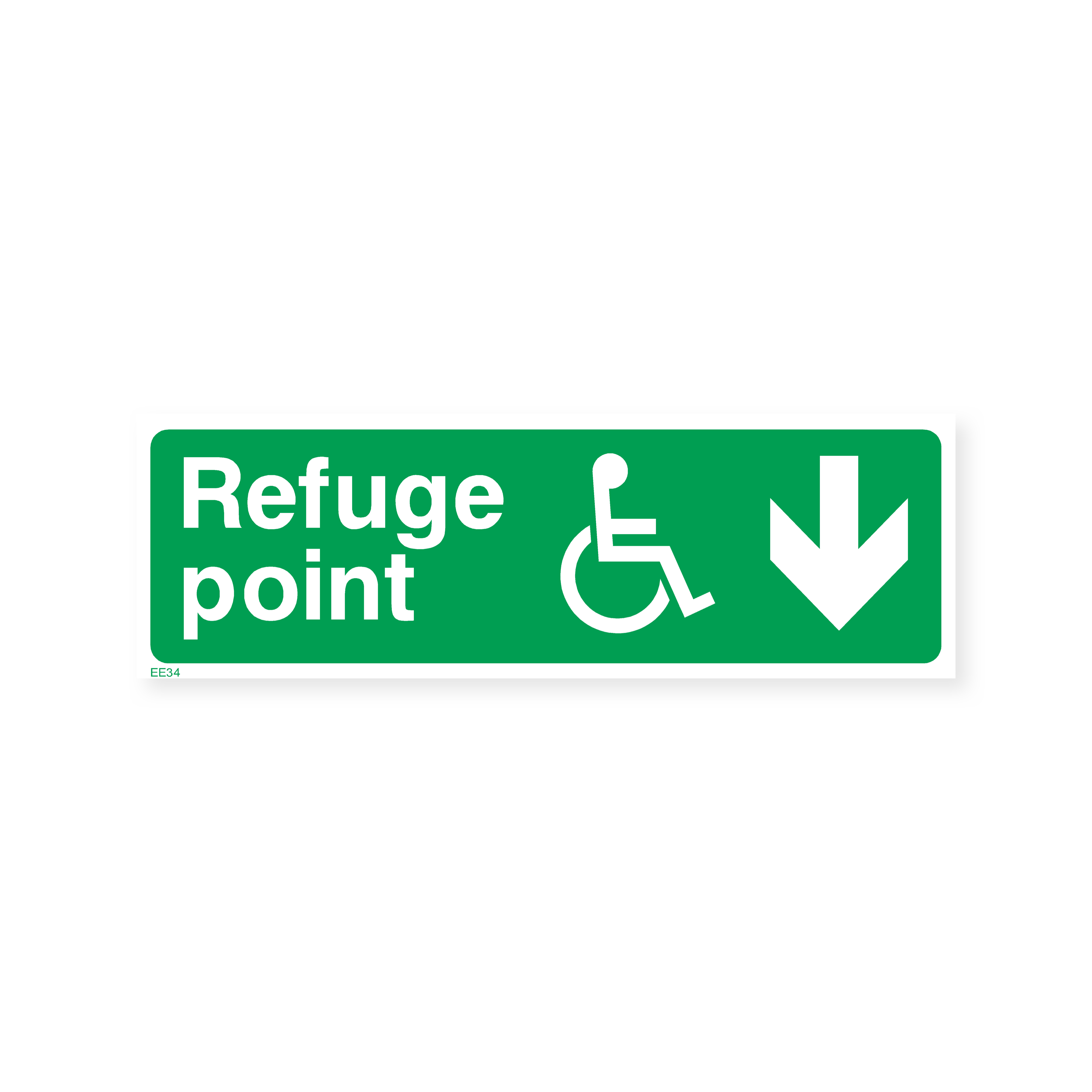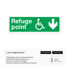 Guide individuals to refuge points with our "Refuge point - Arrow down" sign. This directional sign clearly indicates the location of the nearest refuge point and the direction to access it, providing a safe haven during emergencies.