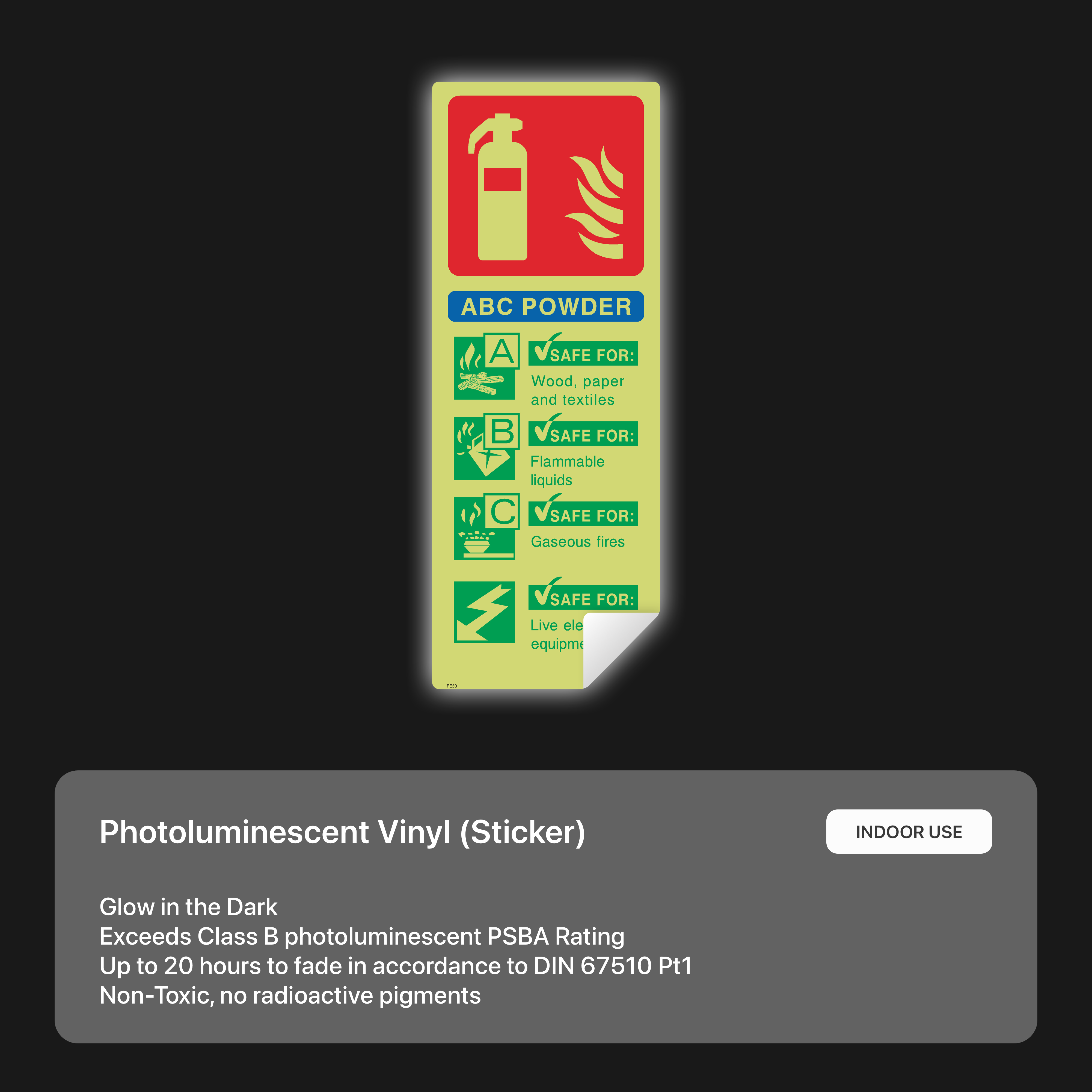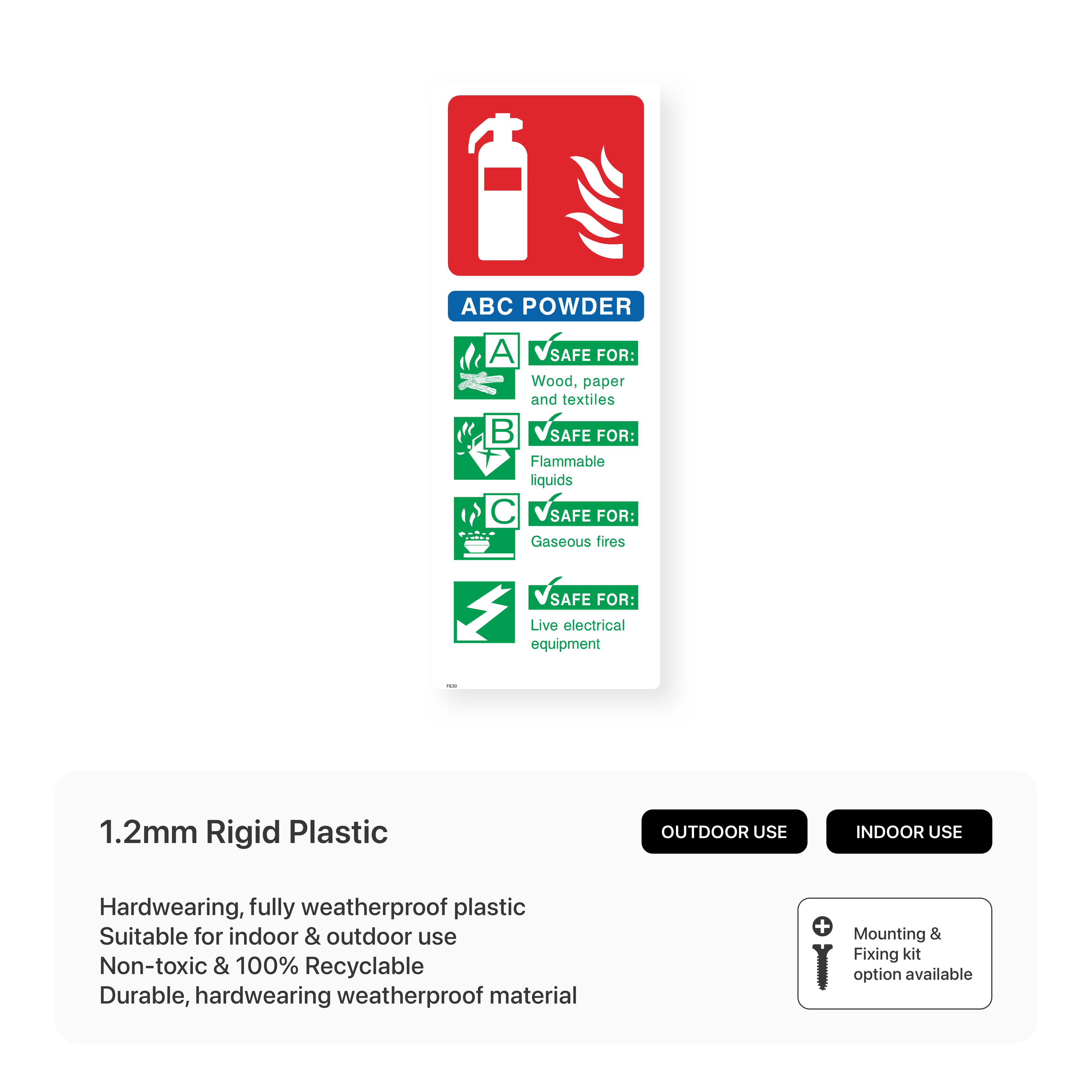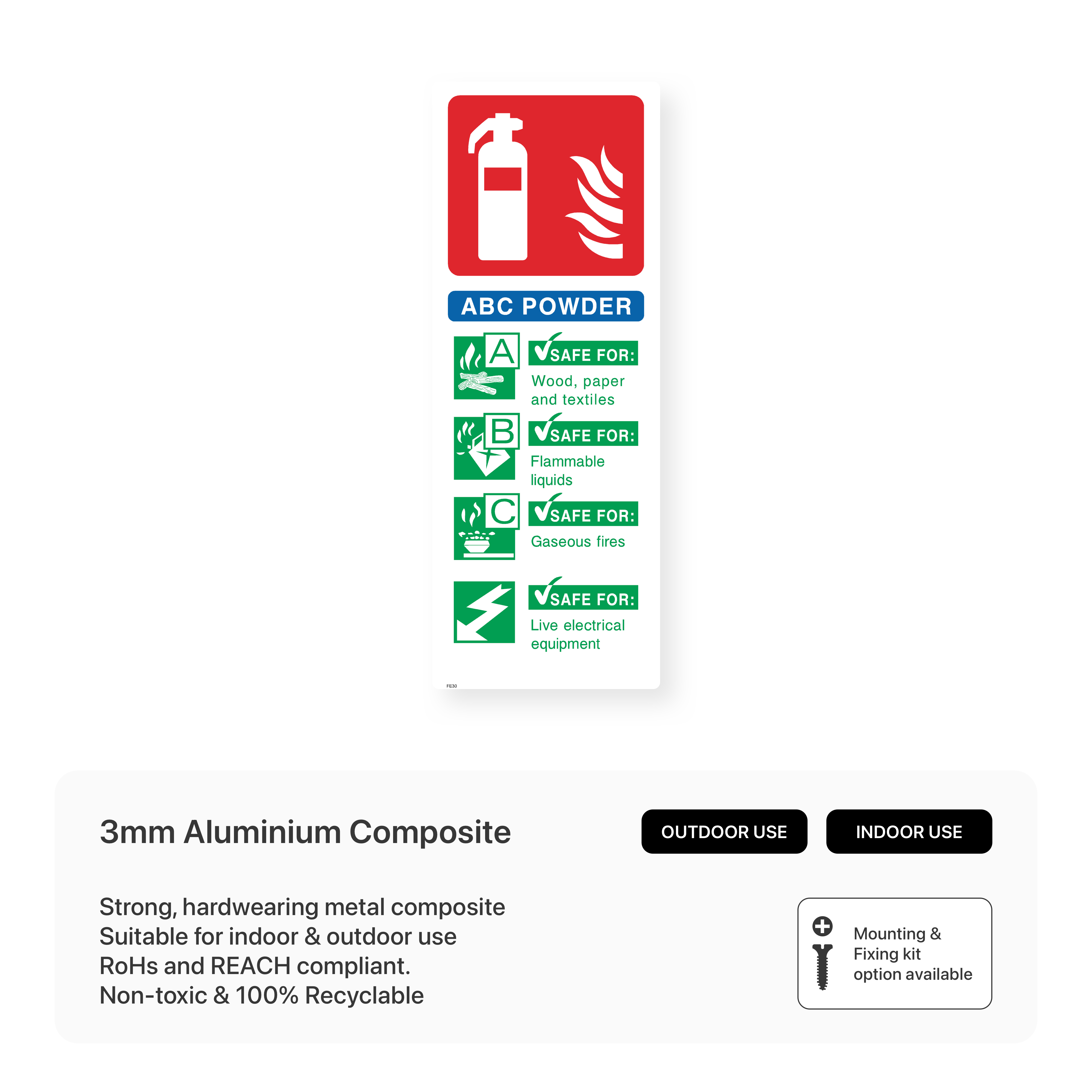 Identify ABC powder fire extinguishers with our "Fire Extinguisher ID - ABC Powder" sign. This sign helps individuals quickly identify the type of extinguisher and its appropriate use for various fires.