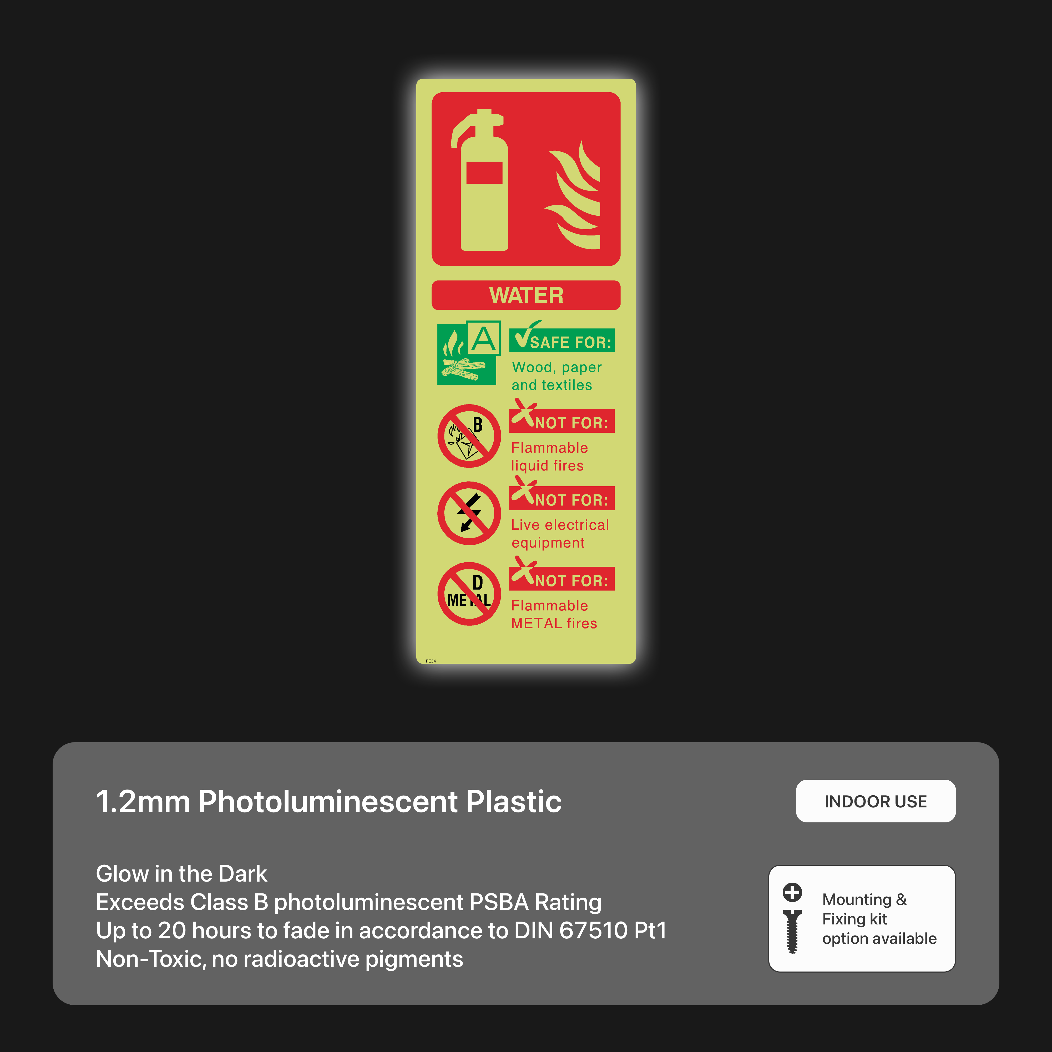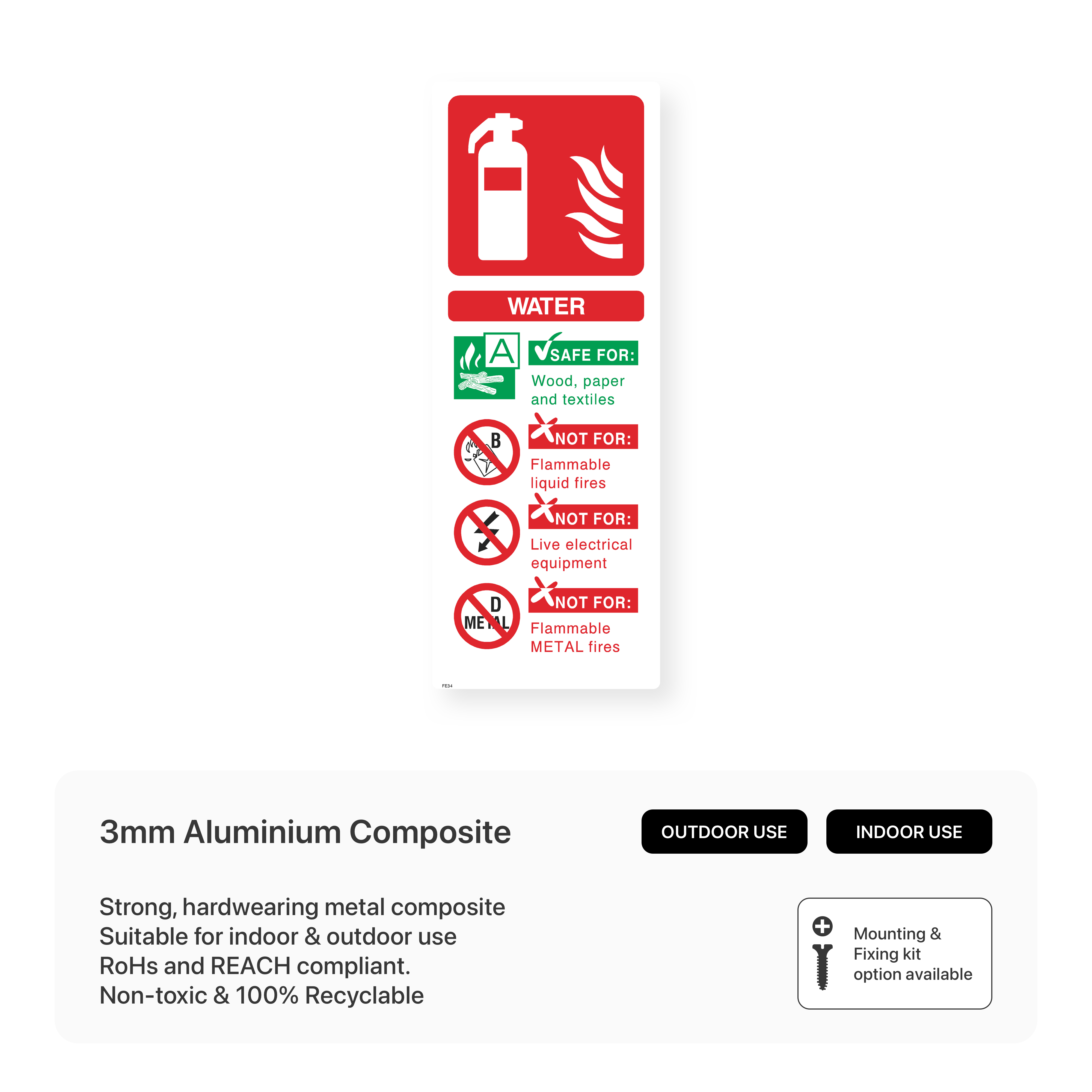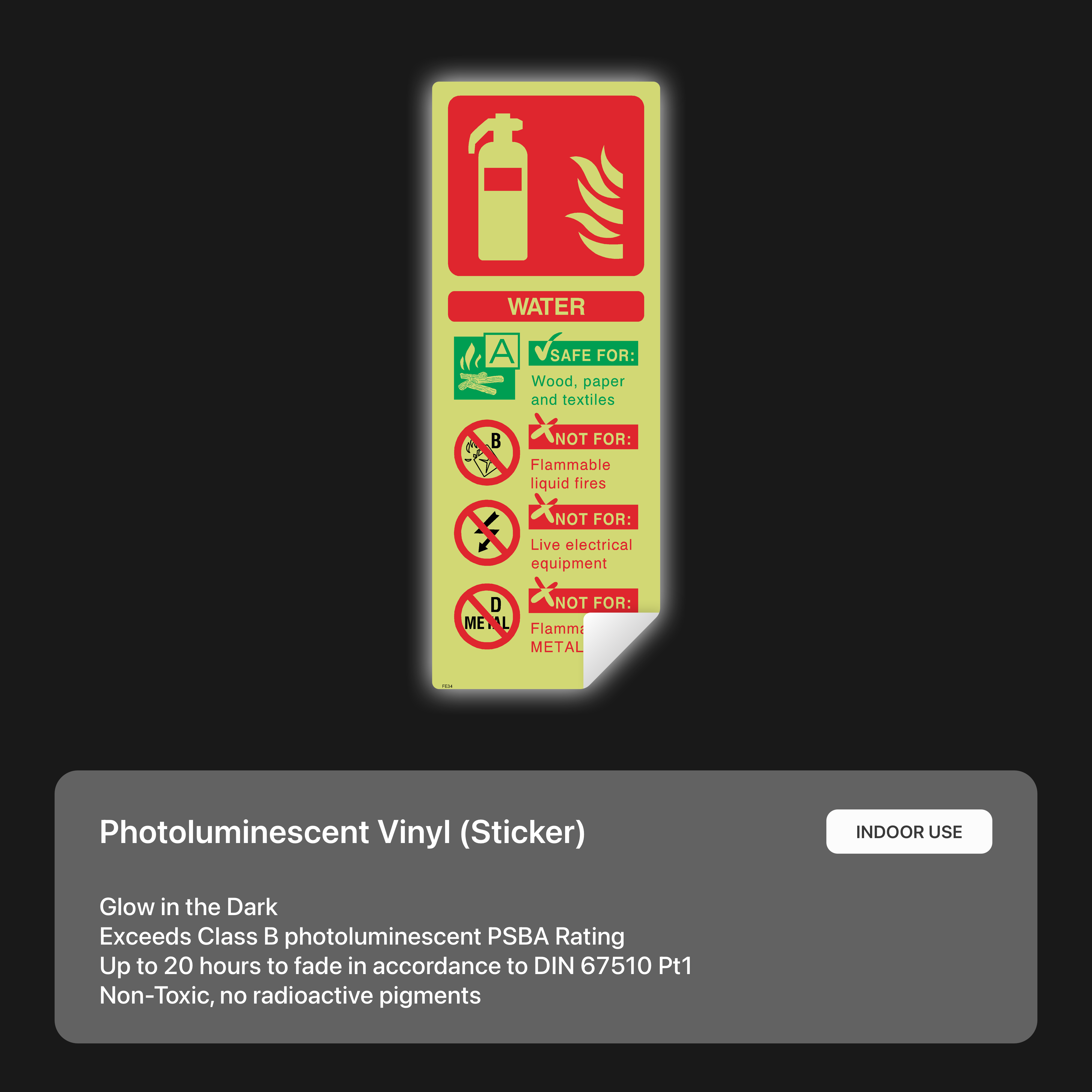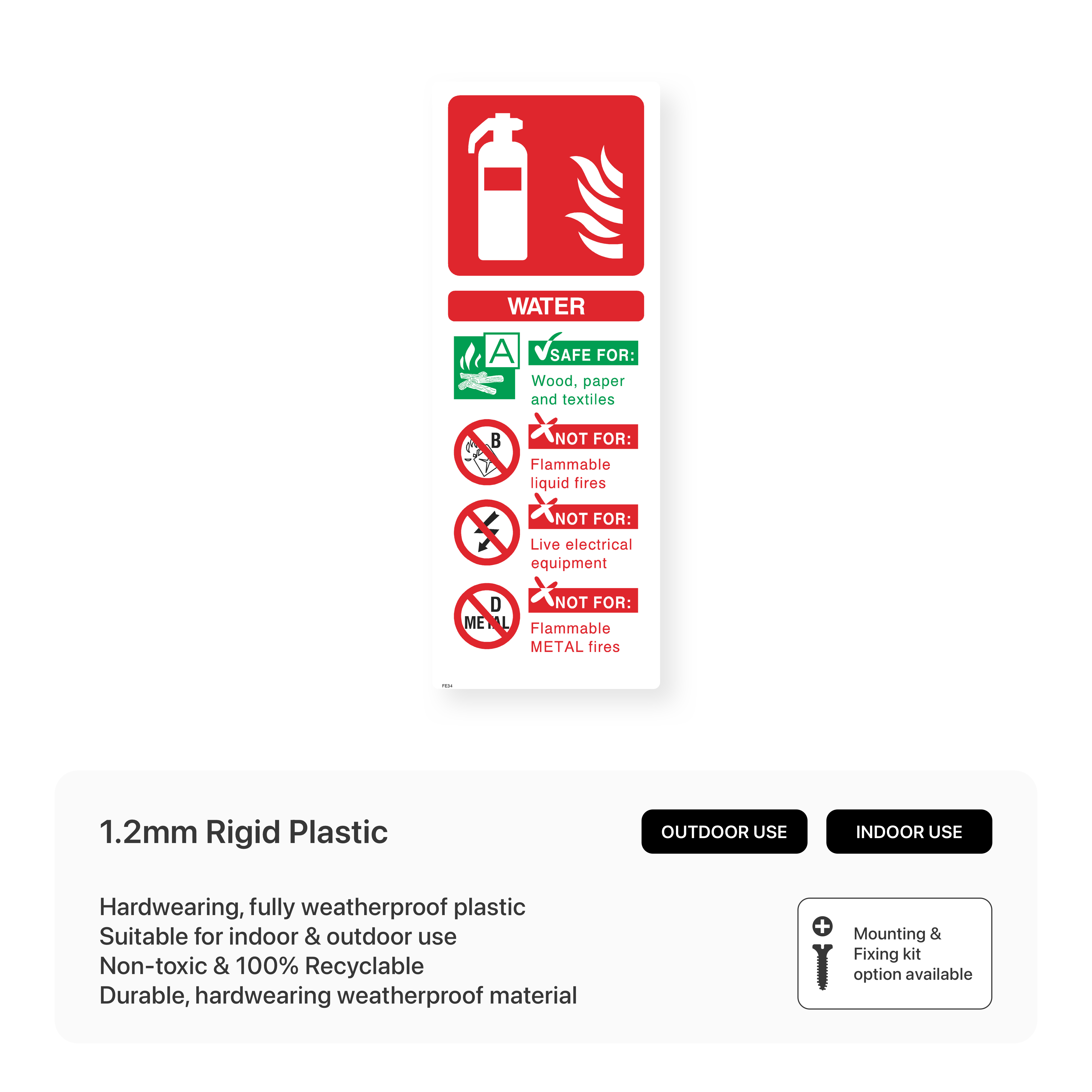 Clearly identify water fire extinguishers with our "Fire Extinguisher ID - Water" sign. This sign helps individuals quickly identify the type of extinguisher and its appropriate use for specific fires, such as wood and paper fires.