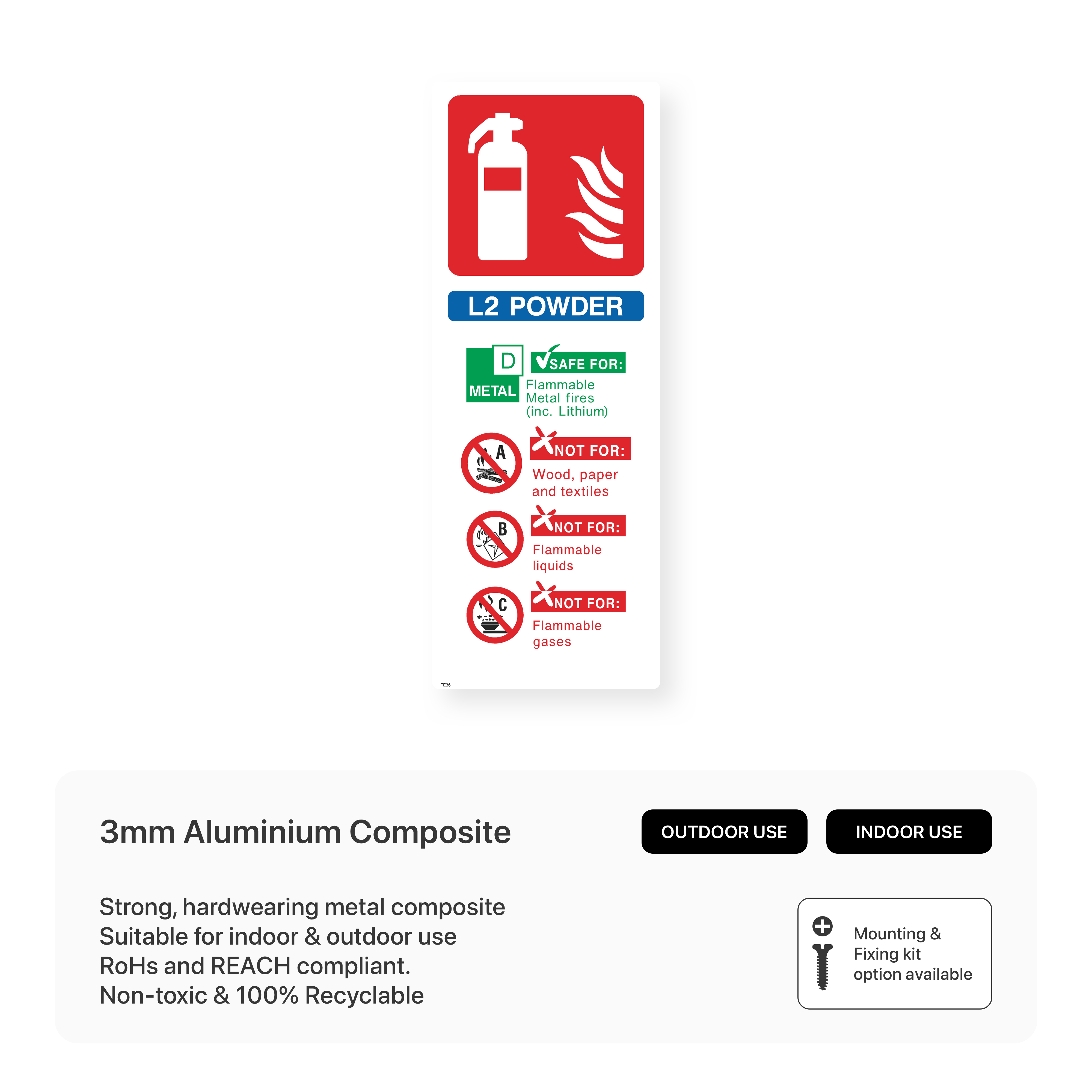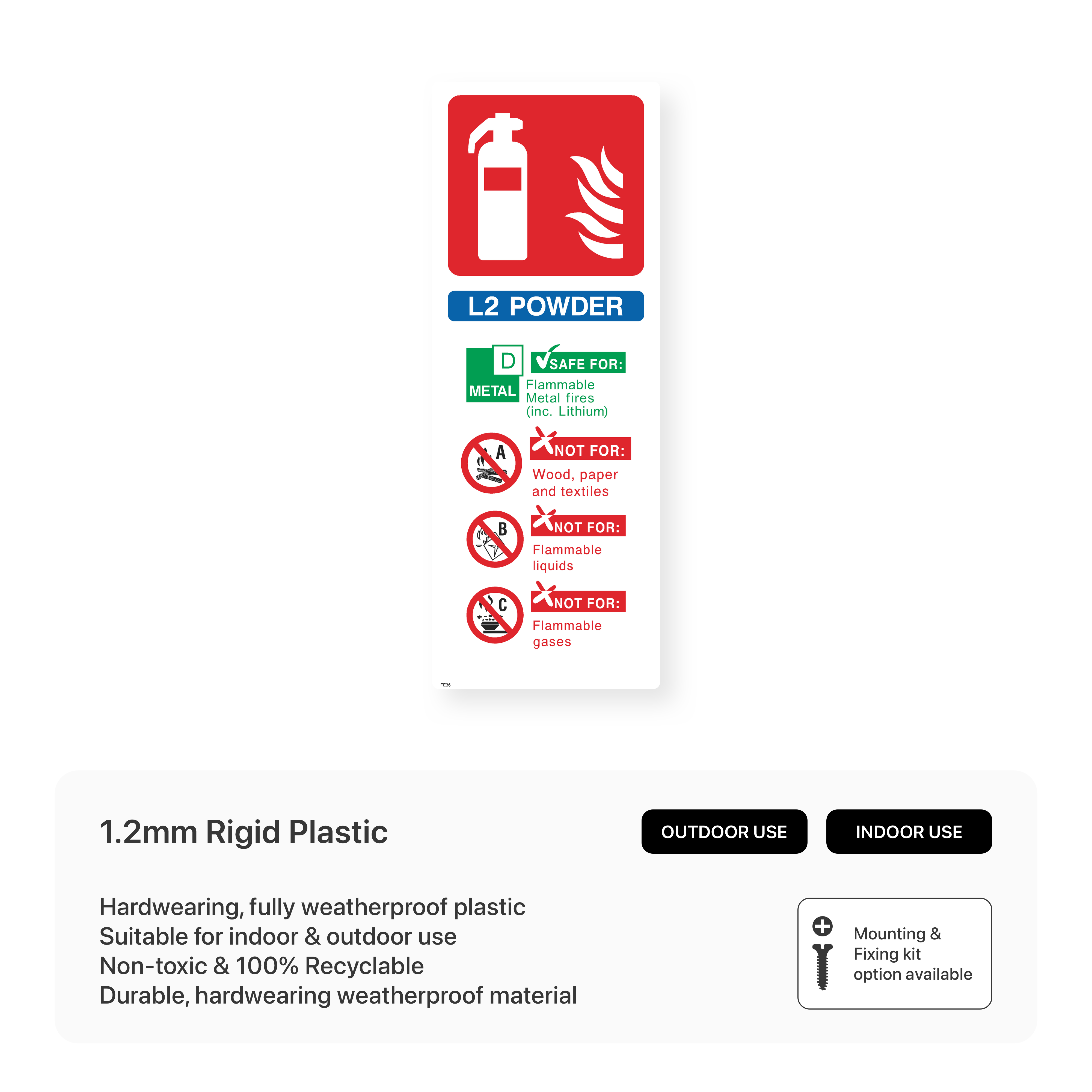 Identify L2 powder fire extinguishers with our "Fire Extinguisher ID - L2 Powder" sign. This sign helps individuals quickly identify the type of extinguisher and its appropriate use for specific fires, such as flammable liquid and gas fires.