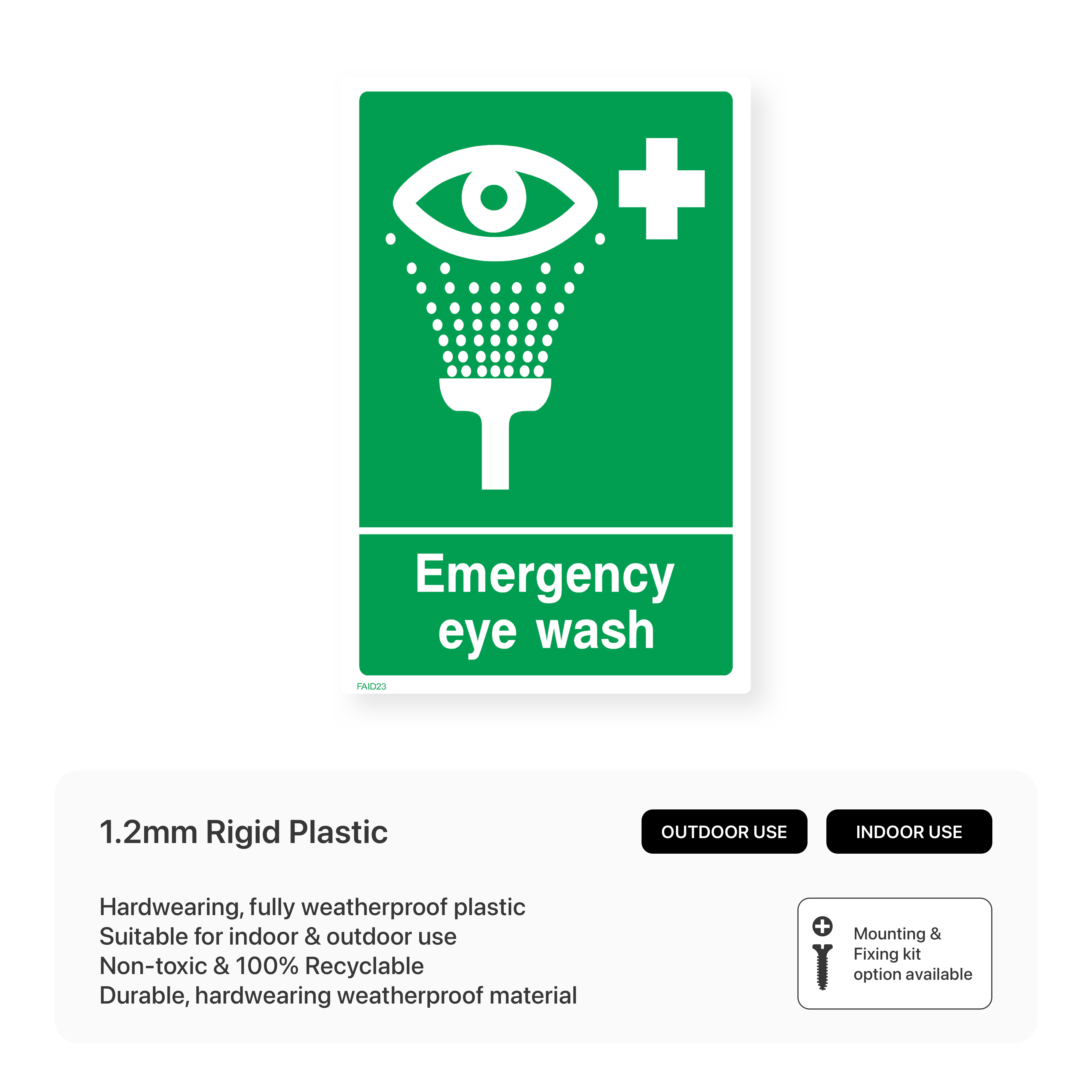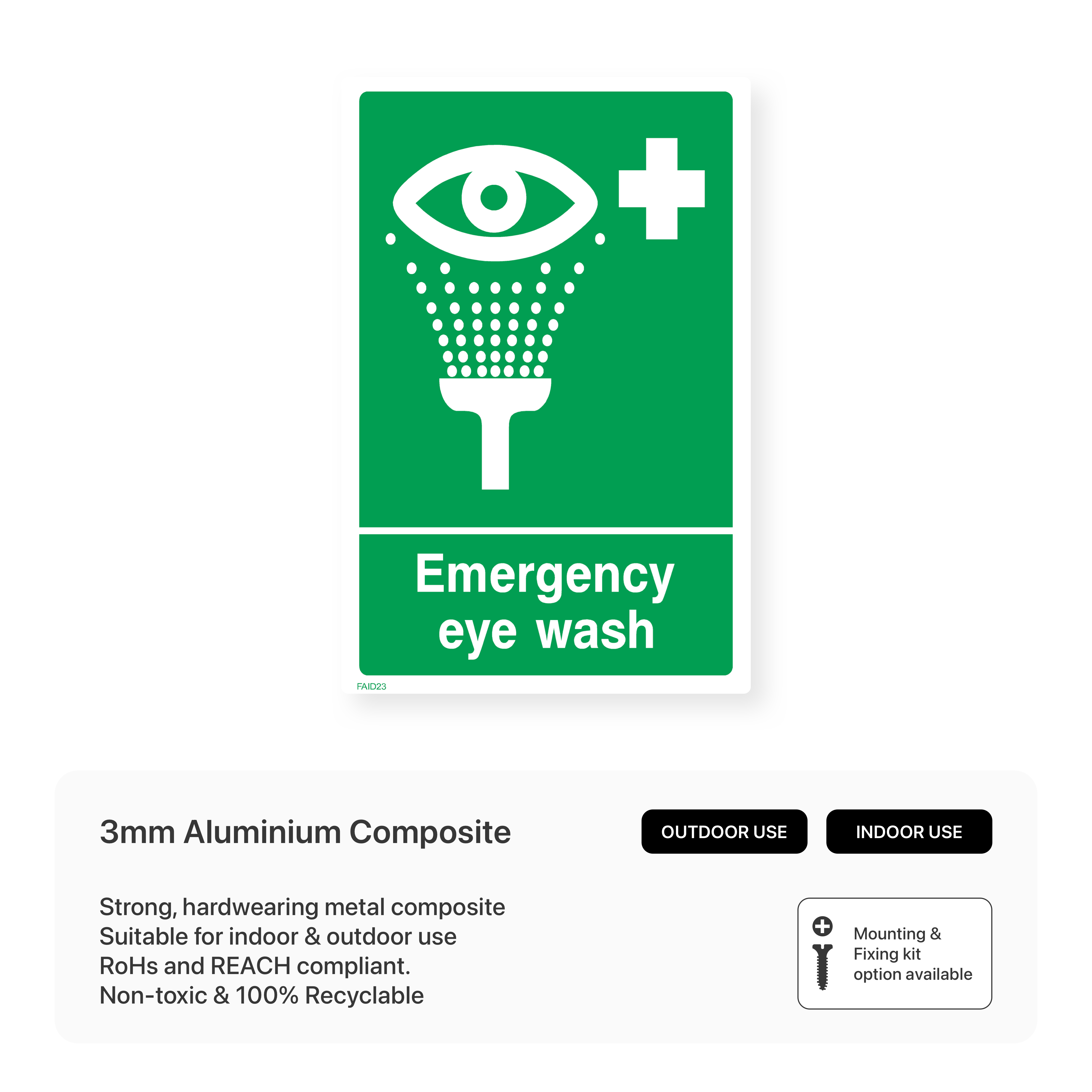 Ensure immediate access to emergency eye wash facilities with our "Emergency eye wash" sign. This sign clearly marks the location of the nearest emergency eye wash station, allowing for quick response in case of eye injuries or contamination.