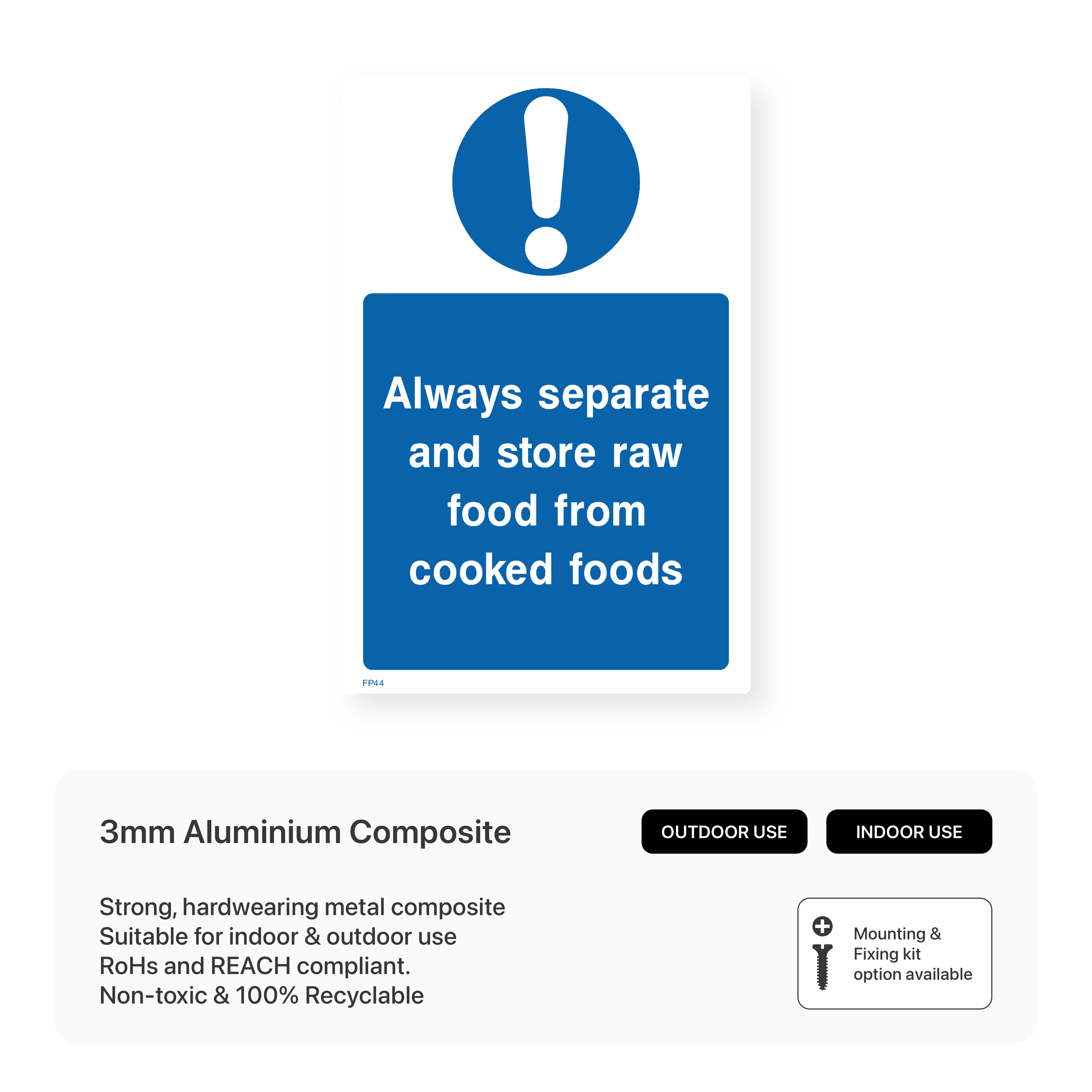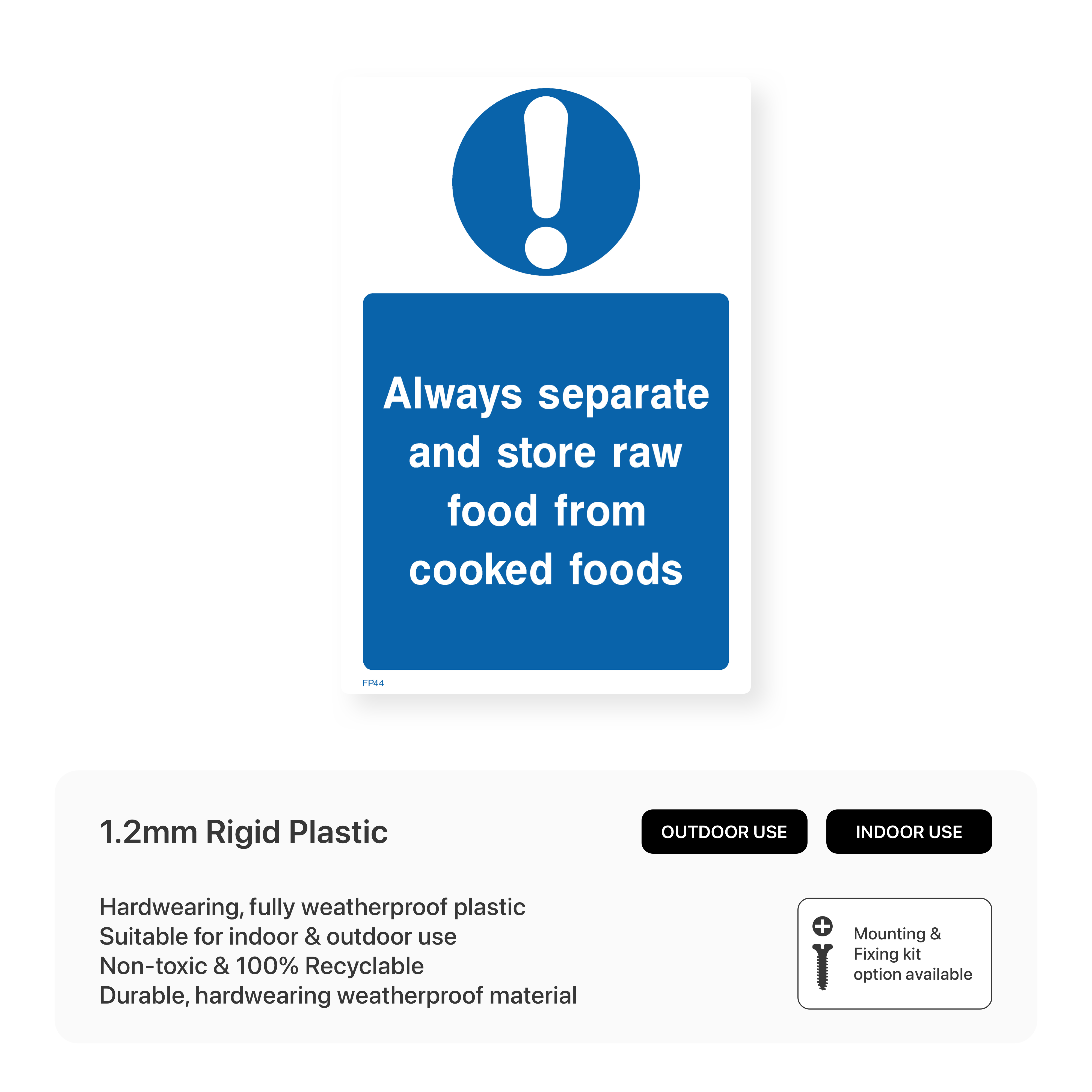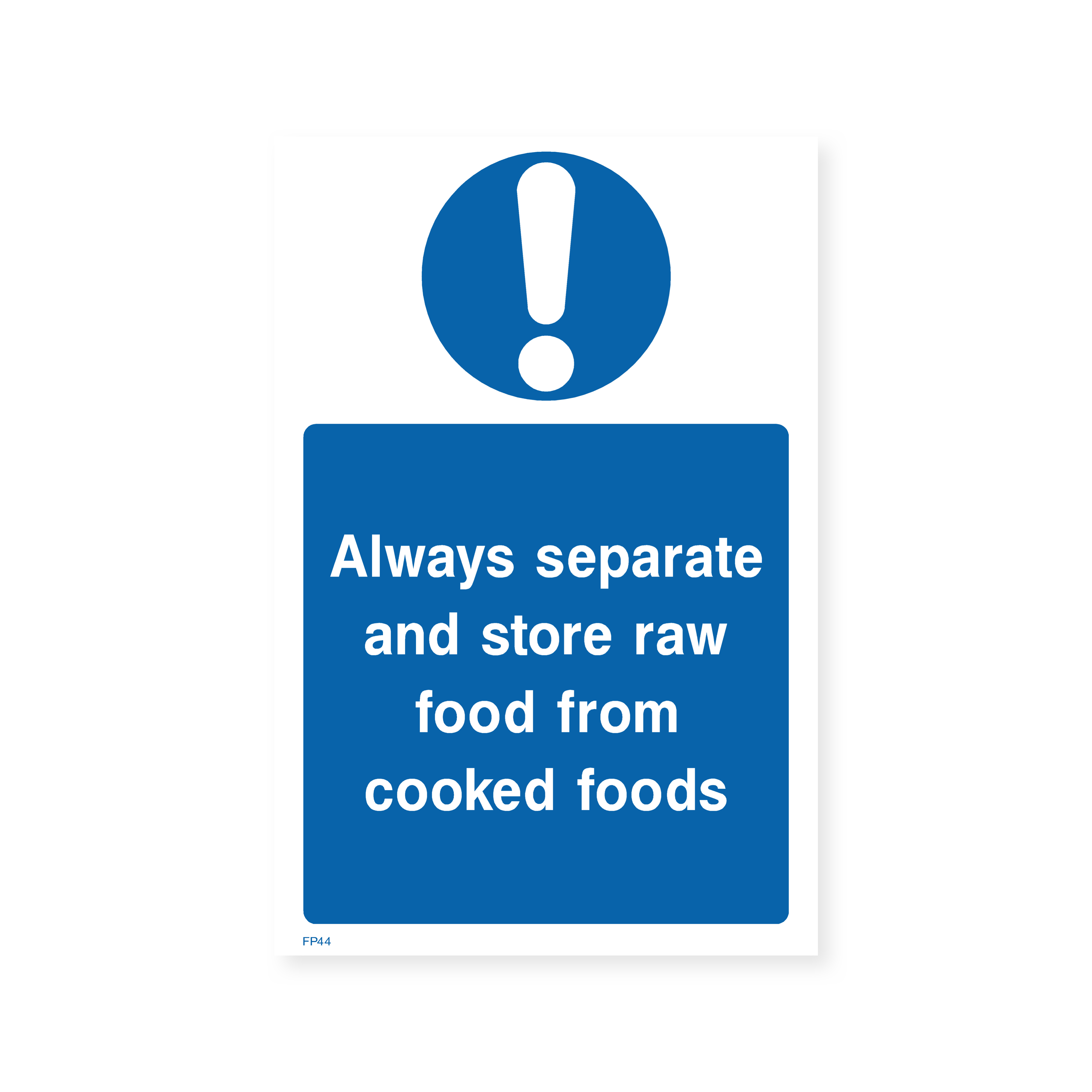 Prevent cross-contamination and ensure food safety with our "Always separate and store raw food from cooked foods" sign. This sign reminds employees of this crucial hygiene practice, reducing the risk of foodborne illnesses.