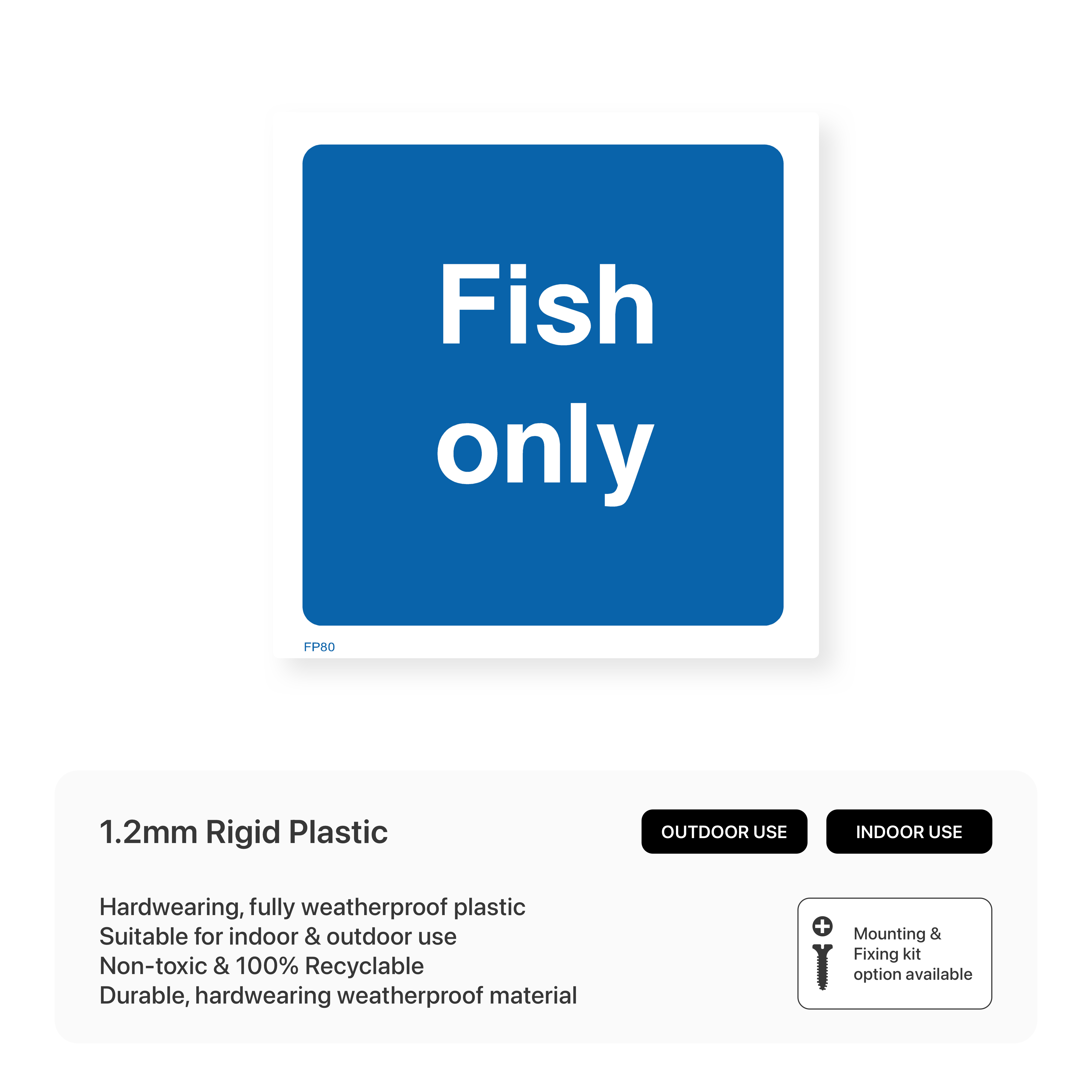 Designate specific areas for fish handling with our "Fish only" sign. This sign helps prevent cross-contamination and ensures that fish is stored and prepared separately from other food items.