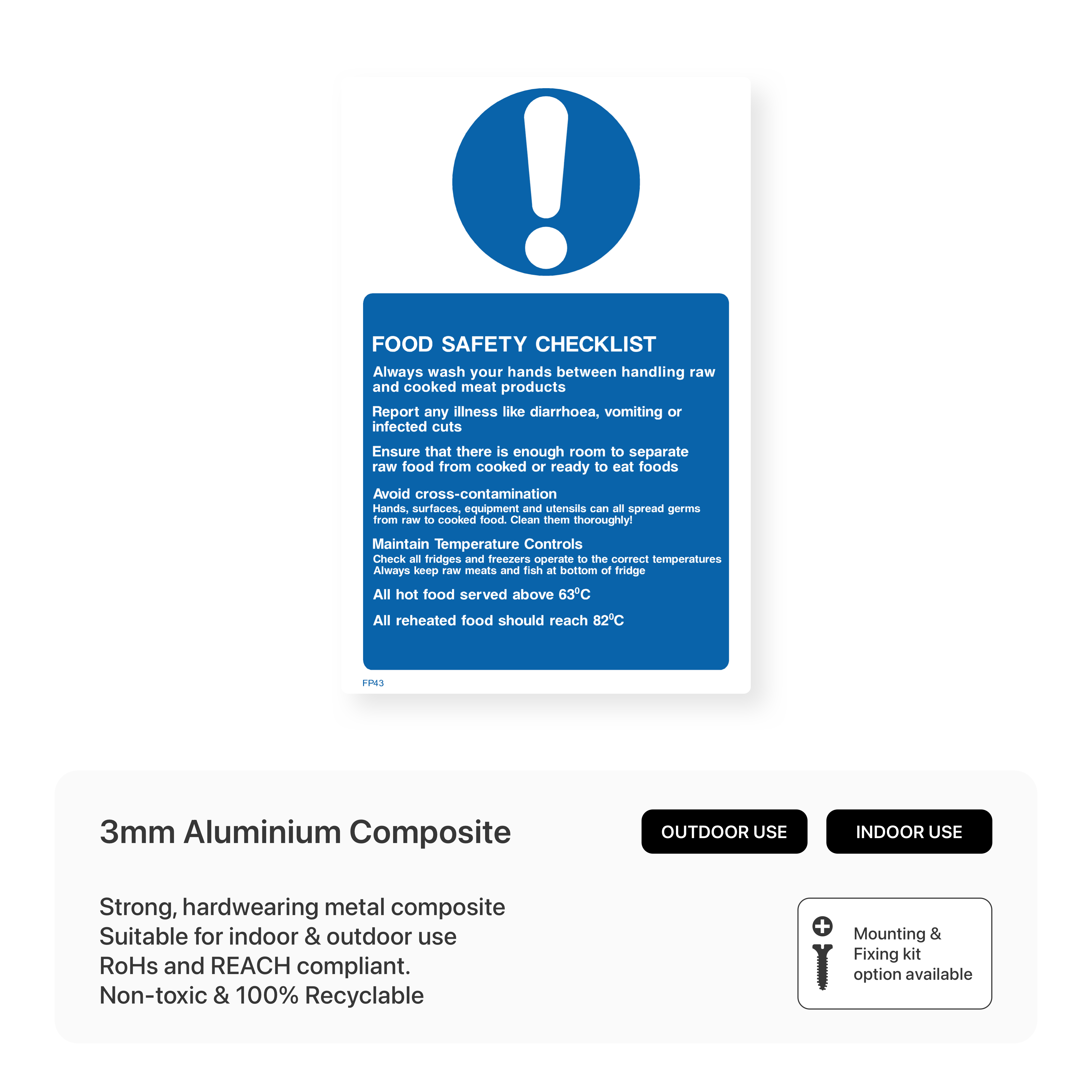 Promote food safety and compliance with our "Food safety checklist" sign. This sign serves as a reminder of essential food safety checks, ensuring that all necessary procedures are followed to maintain hygiene standards.