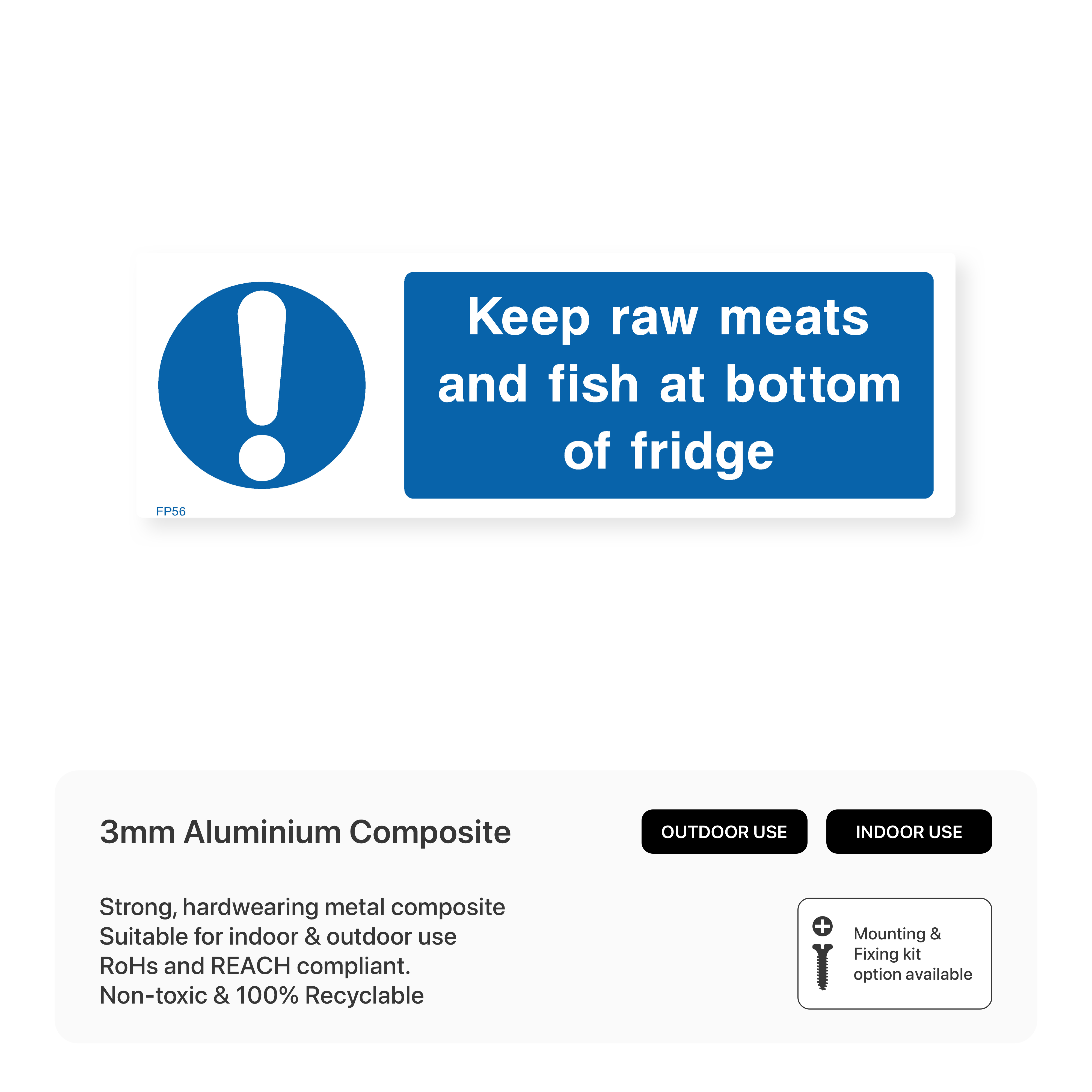 Promote food safety and prevent cross-contamination with our "Keep raw meats and fish at bottom of fridge" sign. This sign reminds employees of proper storage practices, ensuring that raw meats and fish are stored below other food items to prevent dripping and contamination.