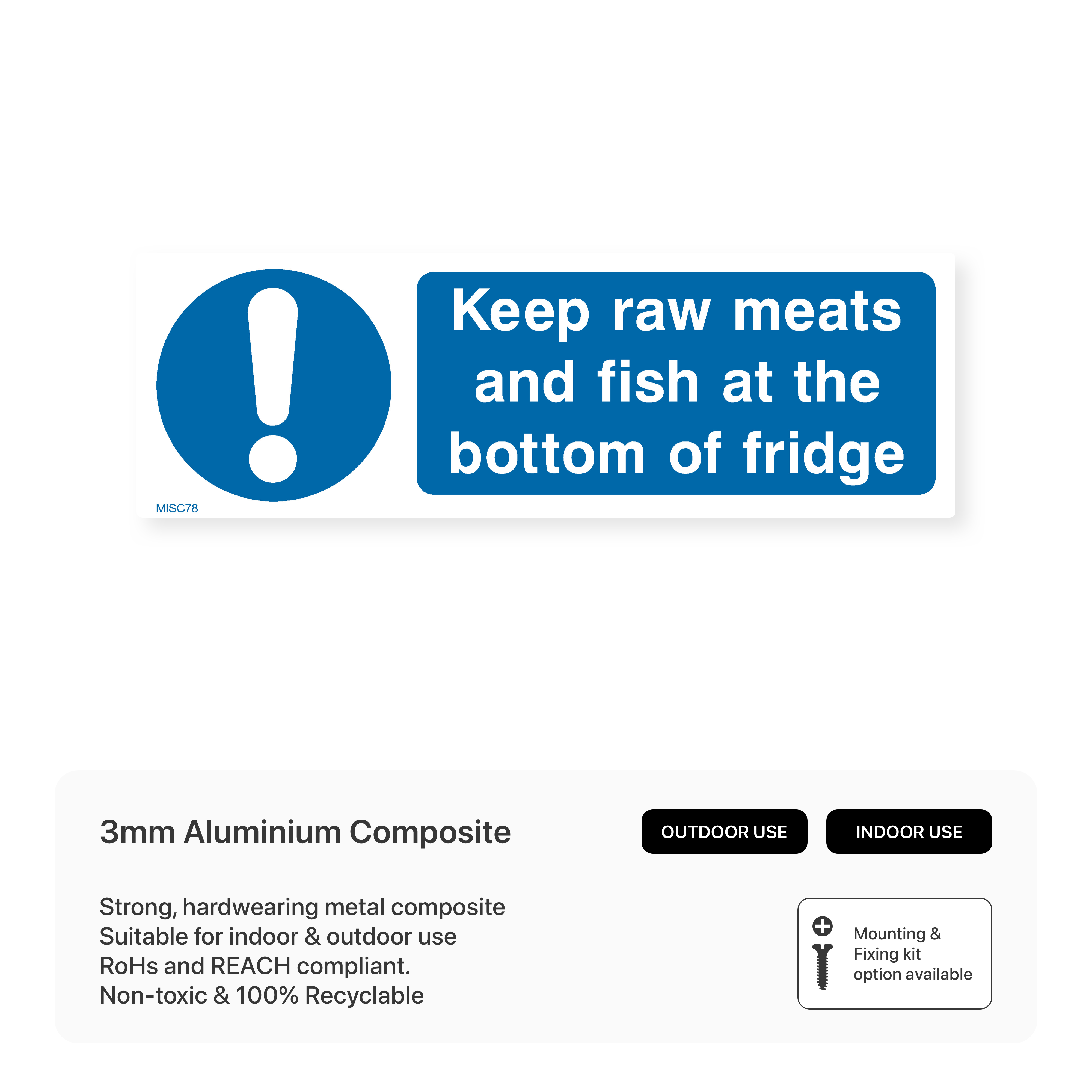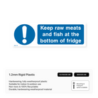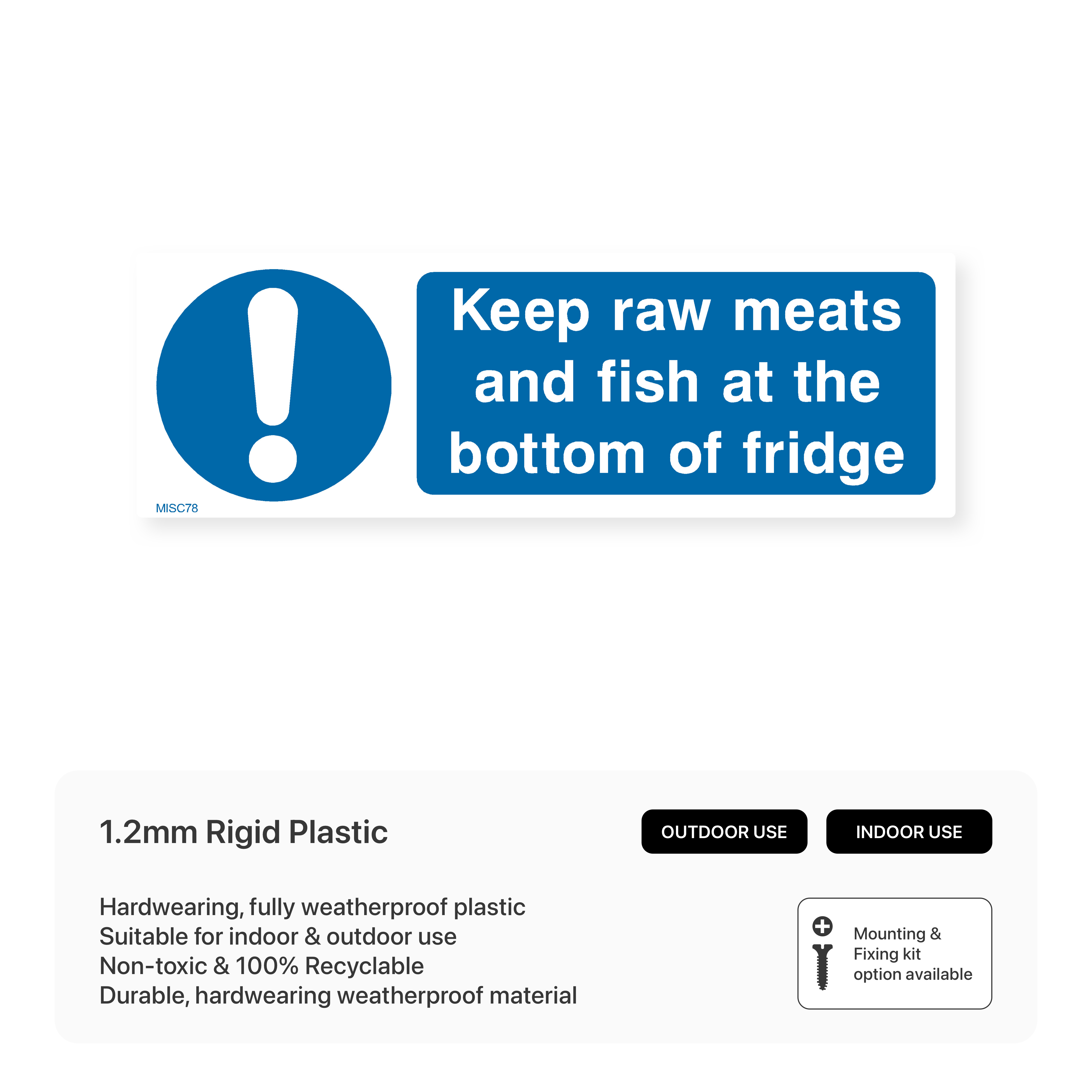 Remind staff of proper food storage practices with our "Keep Raw Meats and Fish at the Bottom of Fridge" signs. Prevent cross-contamination and ensure food safety.