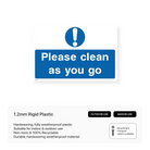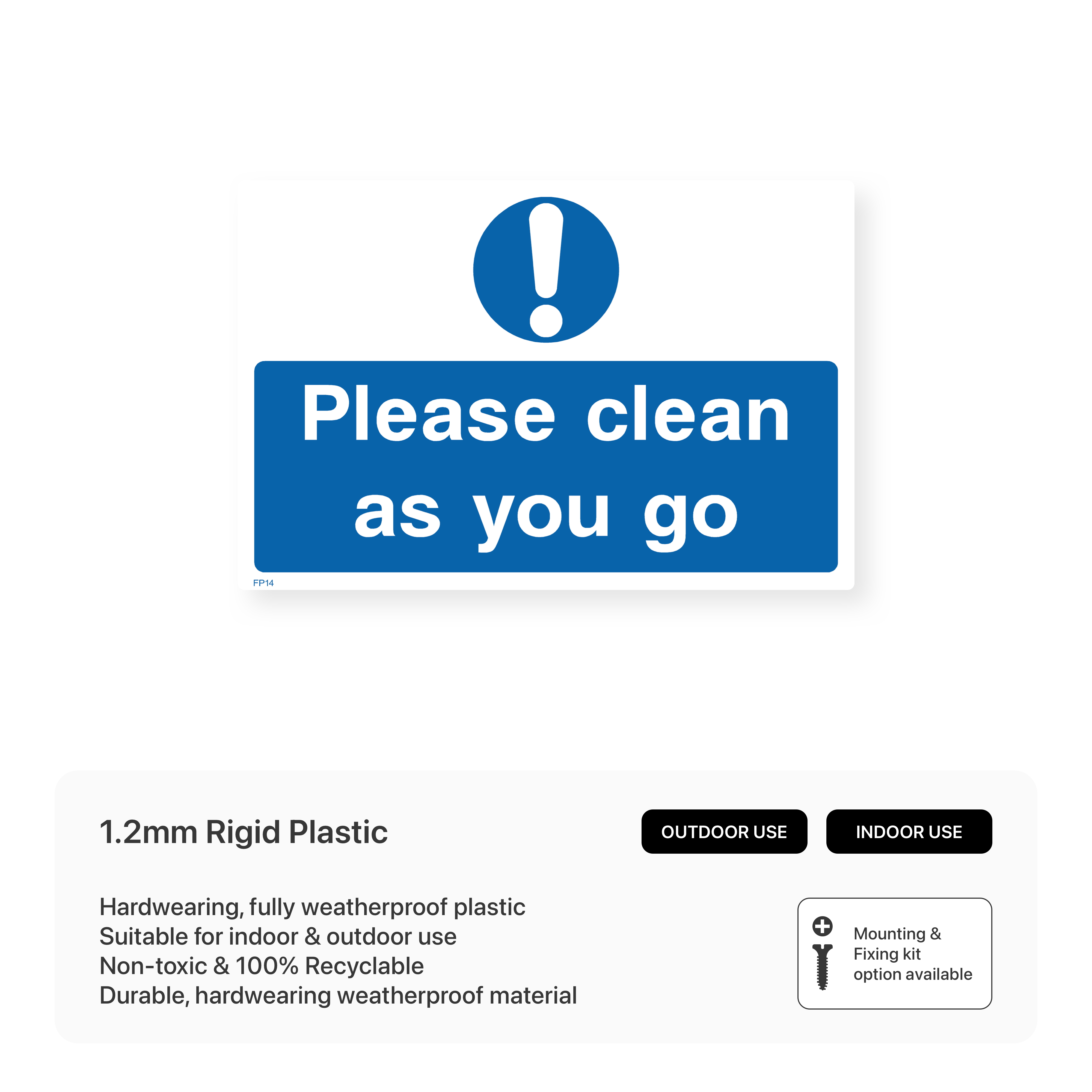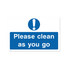 Maintain a clean and hygienic workspace with our "Please clean as you go" sign. This sign encourages employees to clean up spills and messes immediately, reducing the risk of cross-contamination.