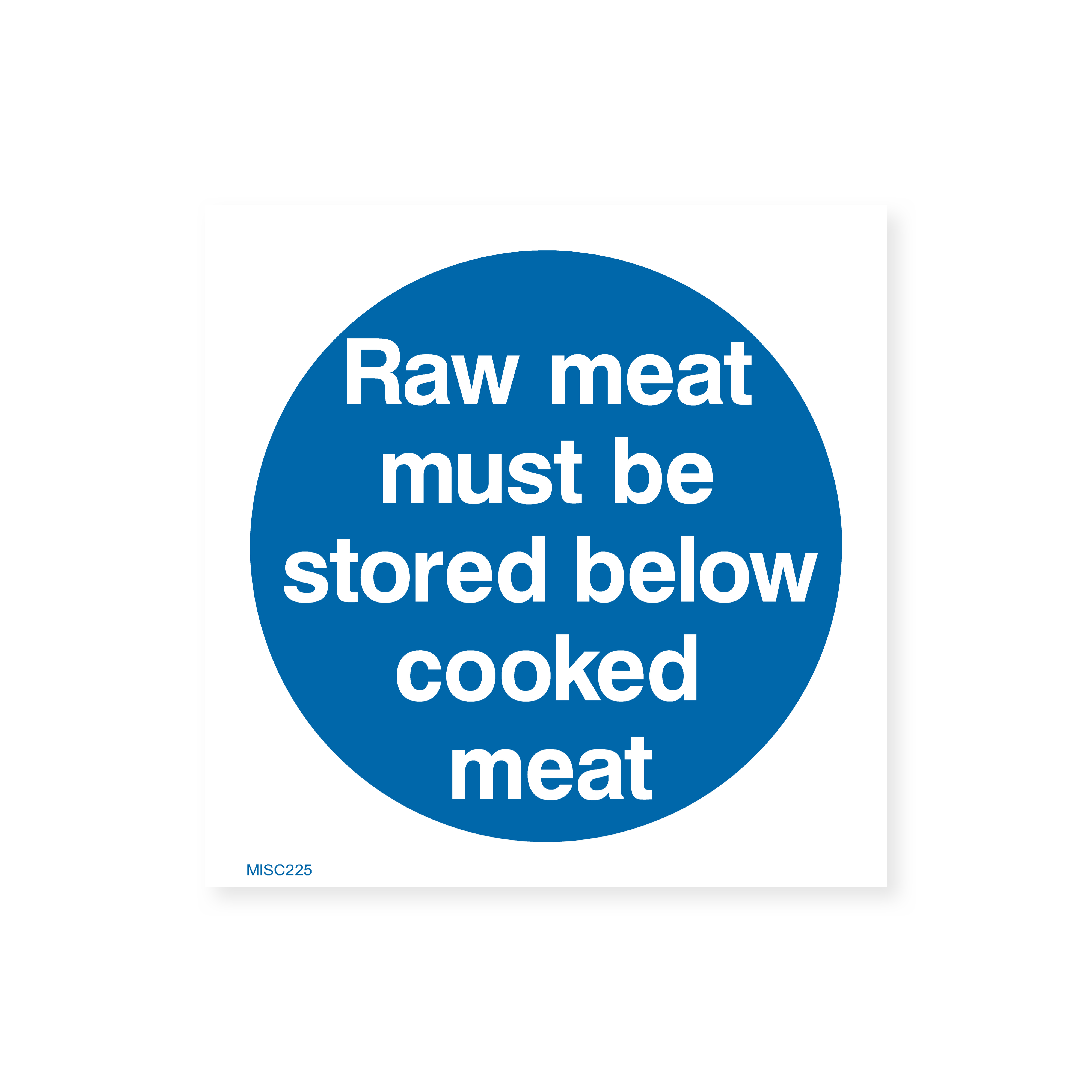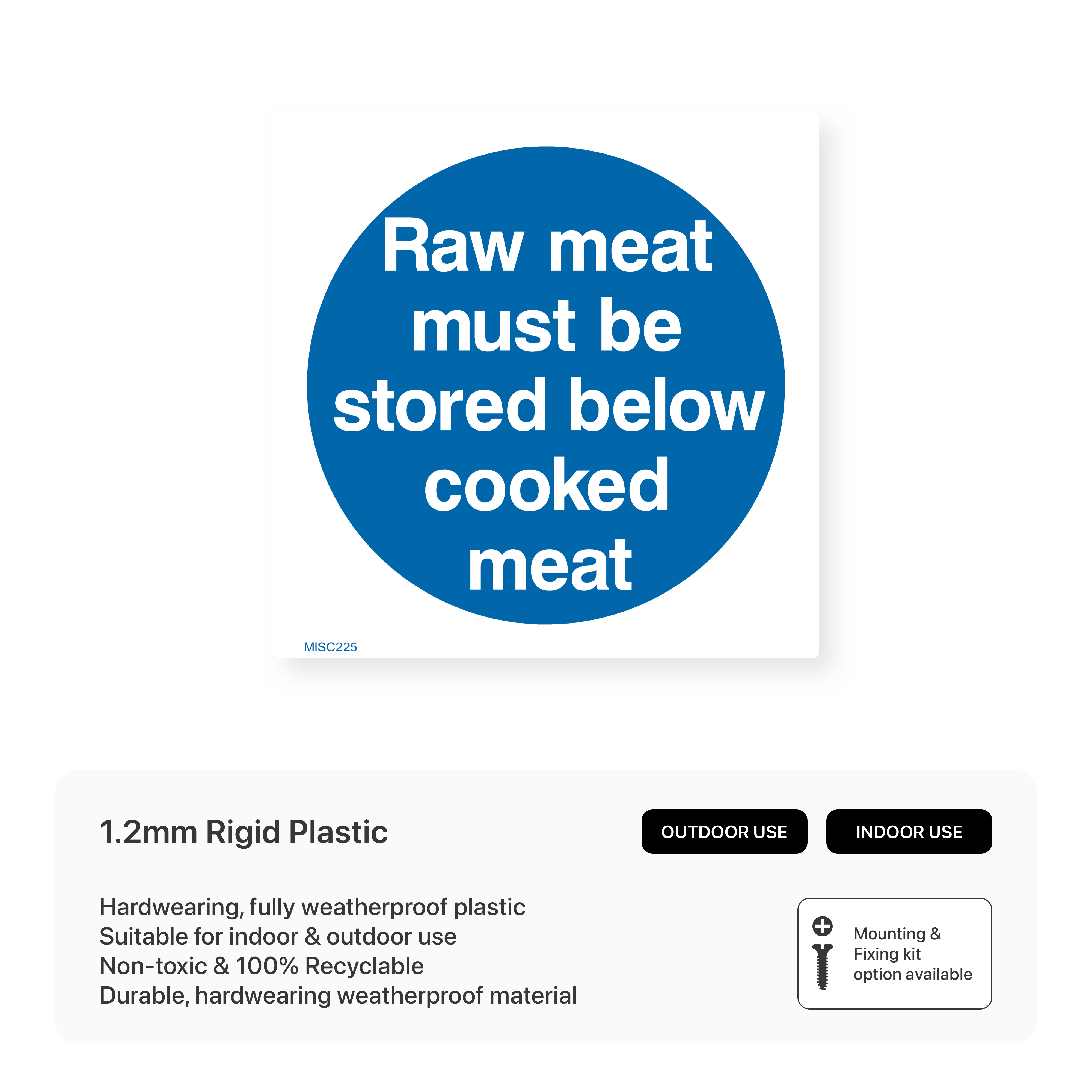 Ensure proper food storage and prevent cross-contamination with our "Raw Meat Must Be Stored Below Cooked Meat" signs.