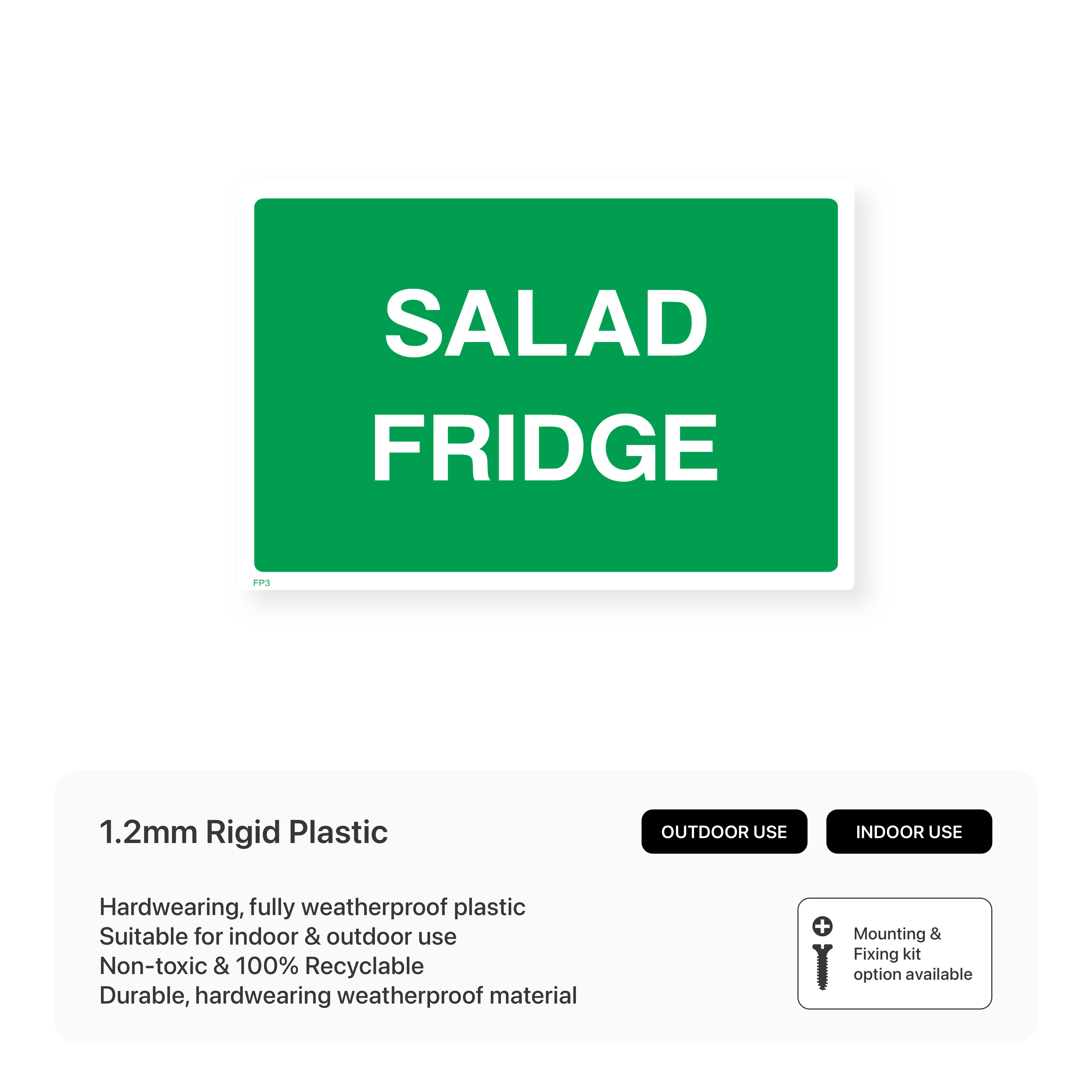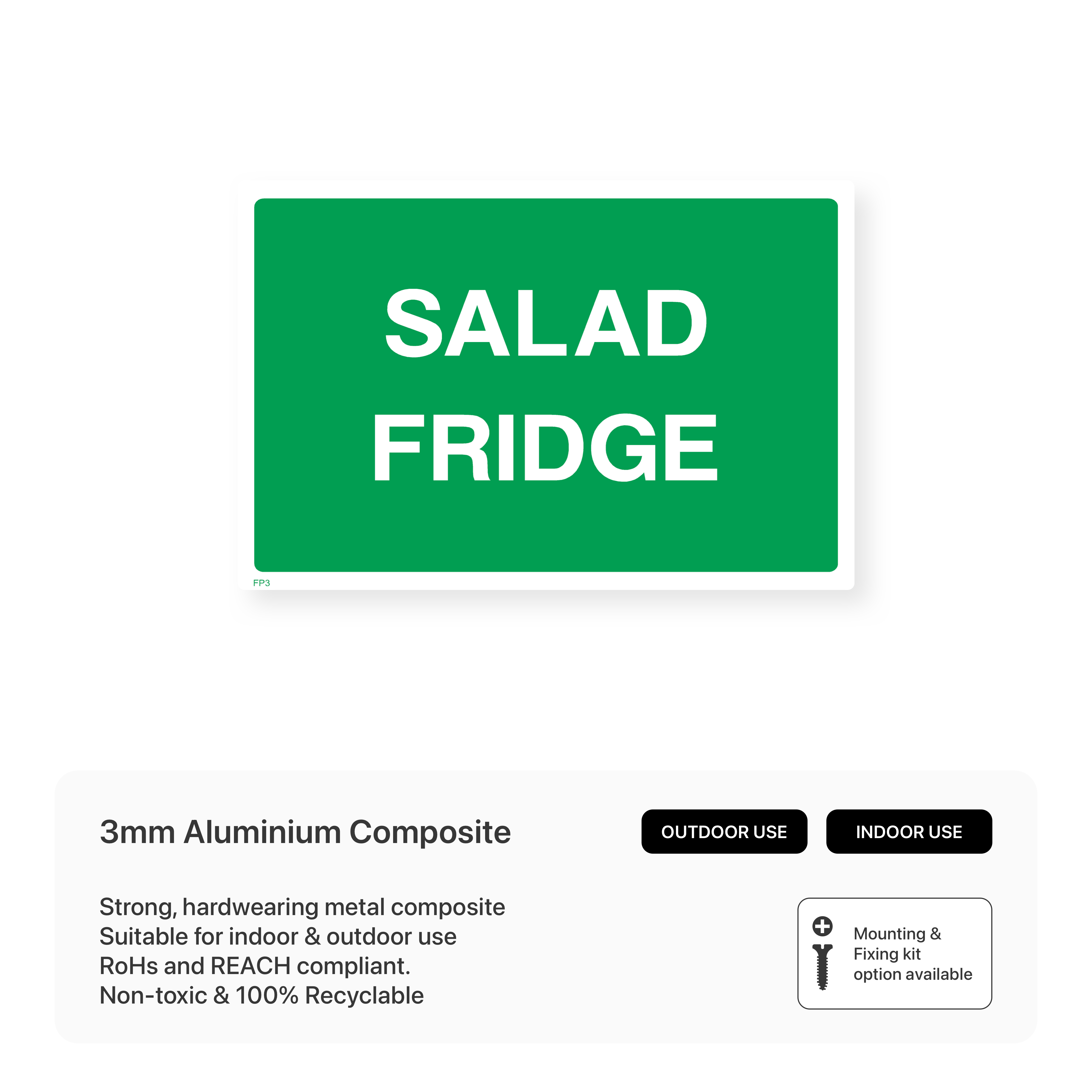 Easily identify designated storage for salads with our "Salad Fridge" sign. This sign helps maintain organization and prevents cross-contamination in your food preparation area.