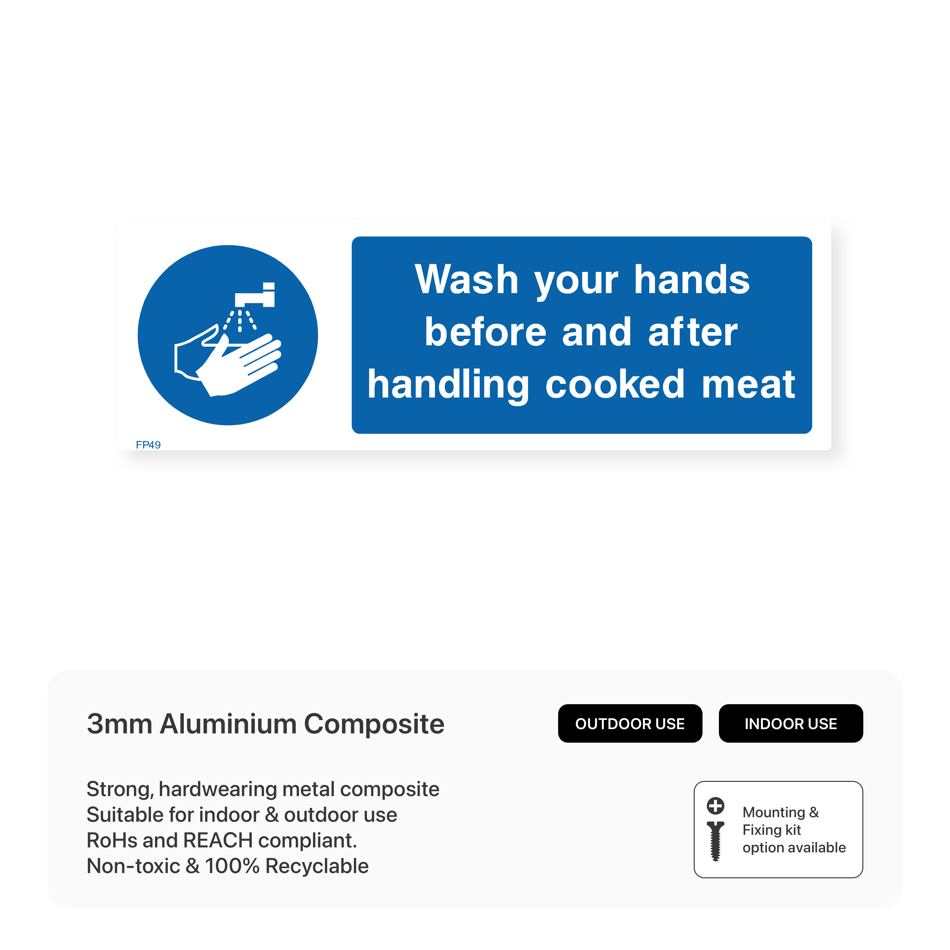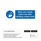 Promote food safety and prevent cross-contamination with our "Wash your hands before and after handling cooked meat" sign. This sign clearly instructs employees on proper hand hygiene when working with cooked meat, reducing the risk of foodborne illnesses.