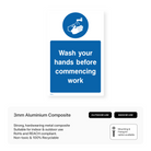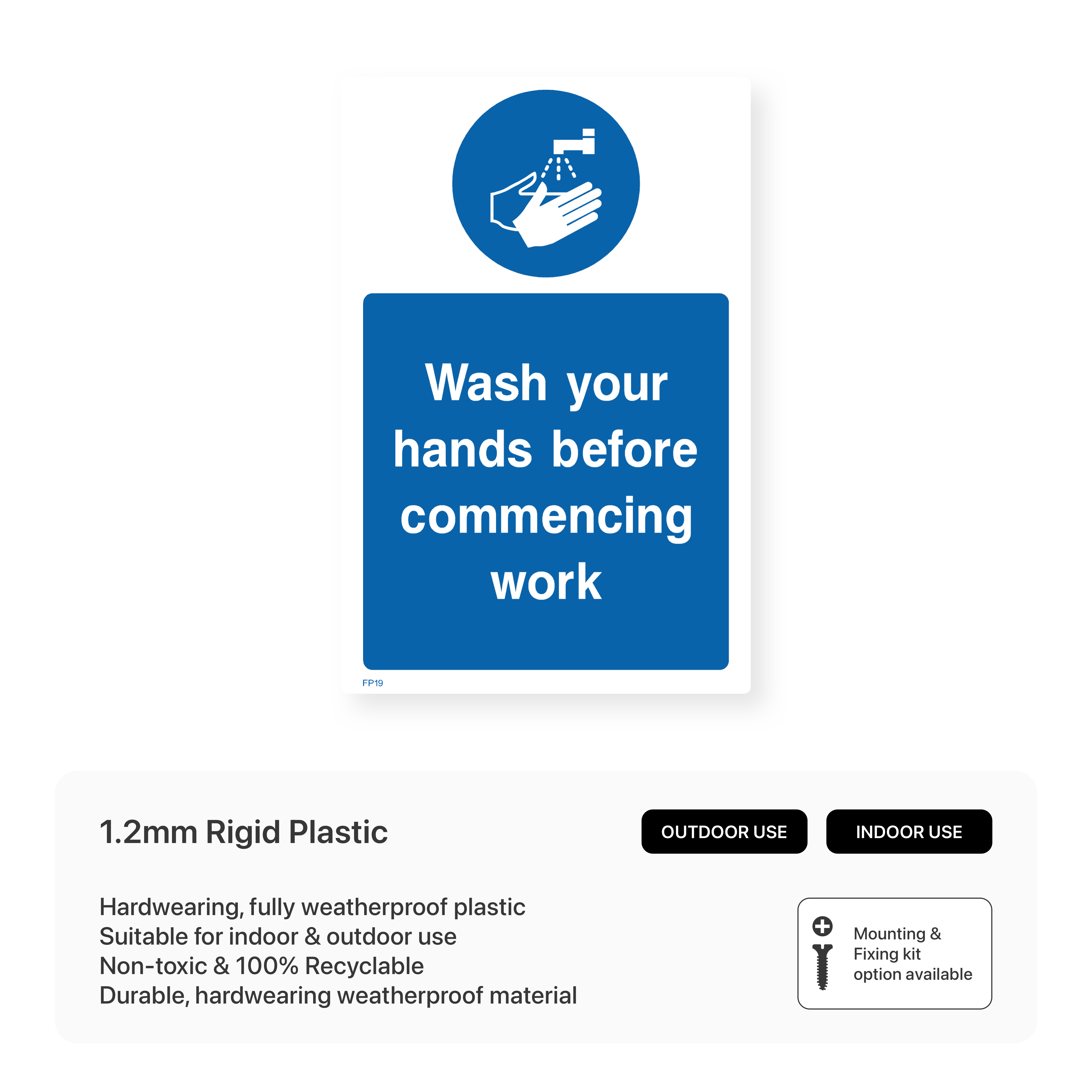 Promote hygiene and food safety with our "Wash your hands before commencing work" sign. This sign reminds employees to wash their hands thoroughly before handling food, reducing the risk of contamination.