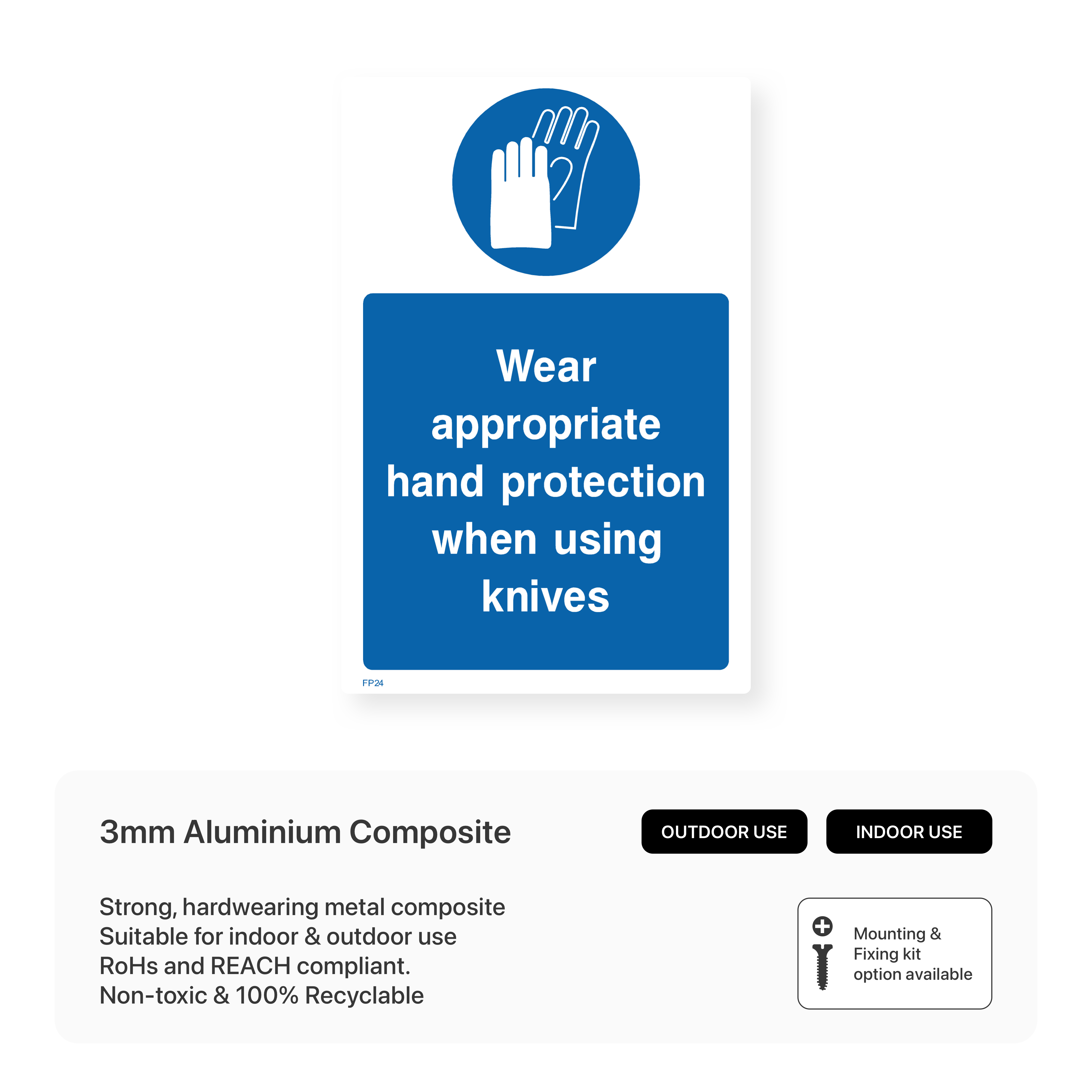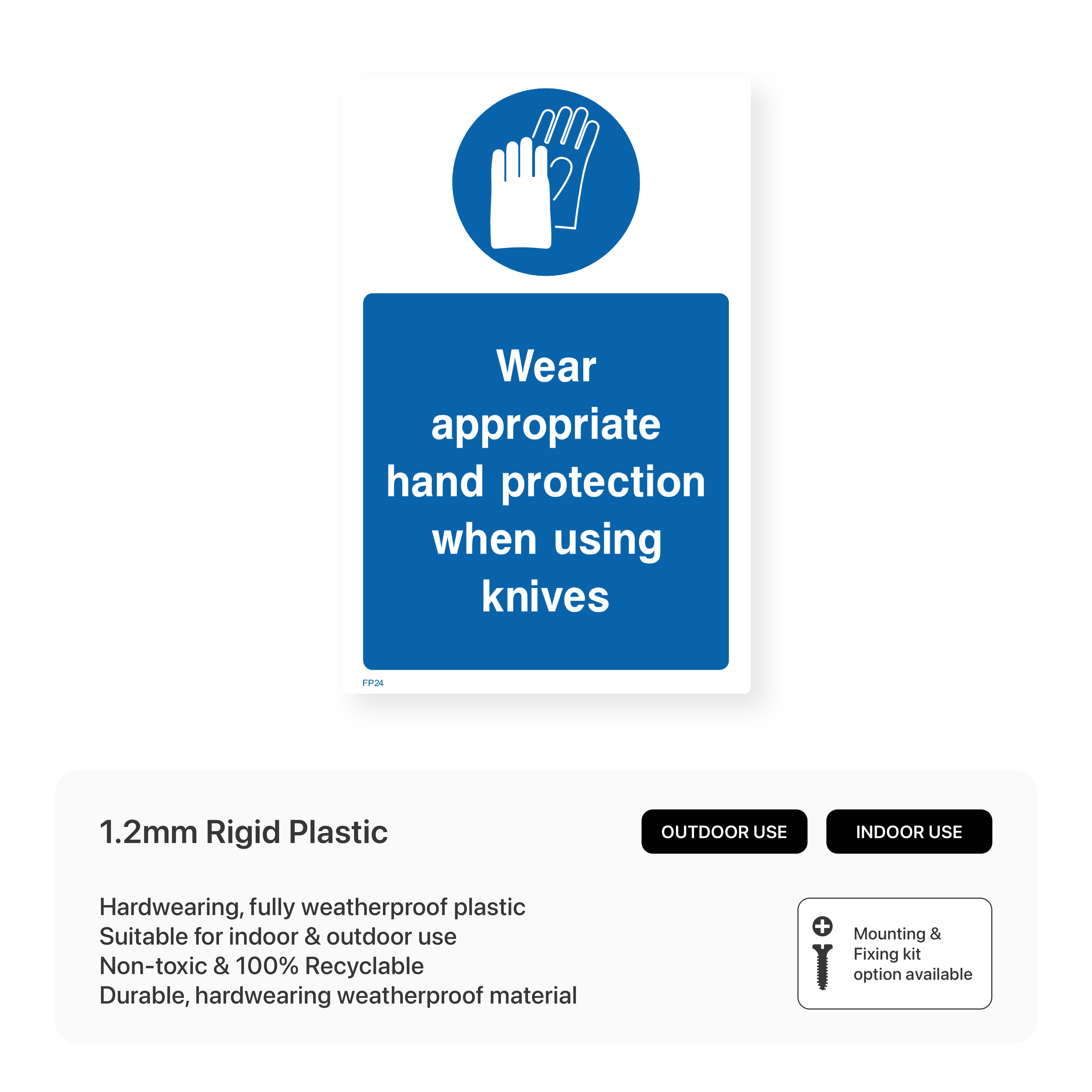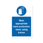 Promote safety in the kitchen with our "Wear appropriate hand protection when using knives" sign. This sign reminds employees to wear cut-resistant gloves or other appropriate hand protection when handling knives, reducing the risk of injuries.
