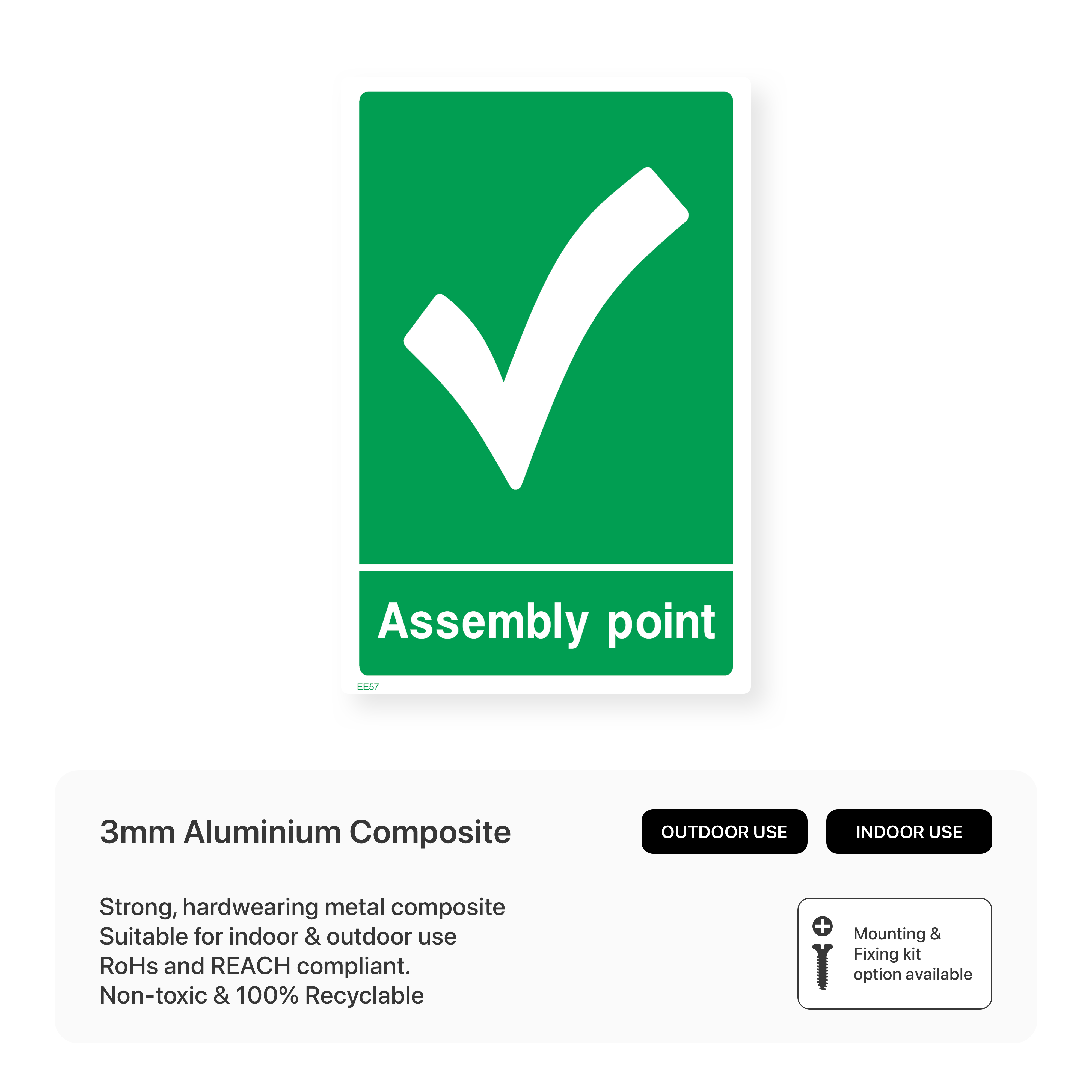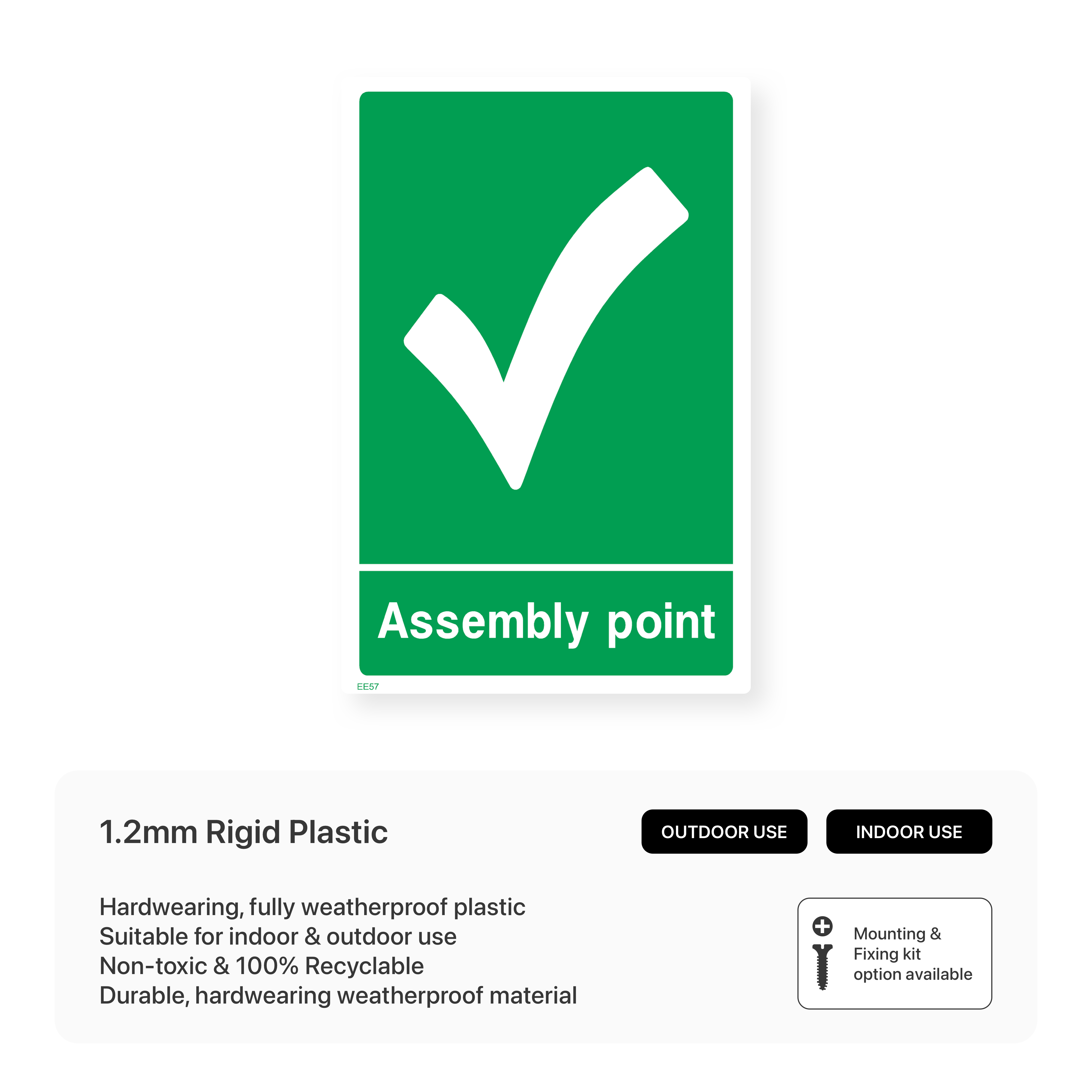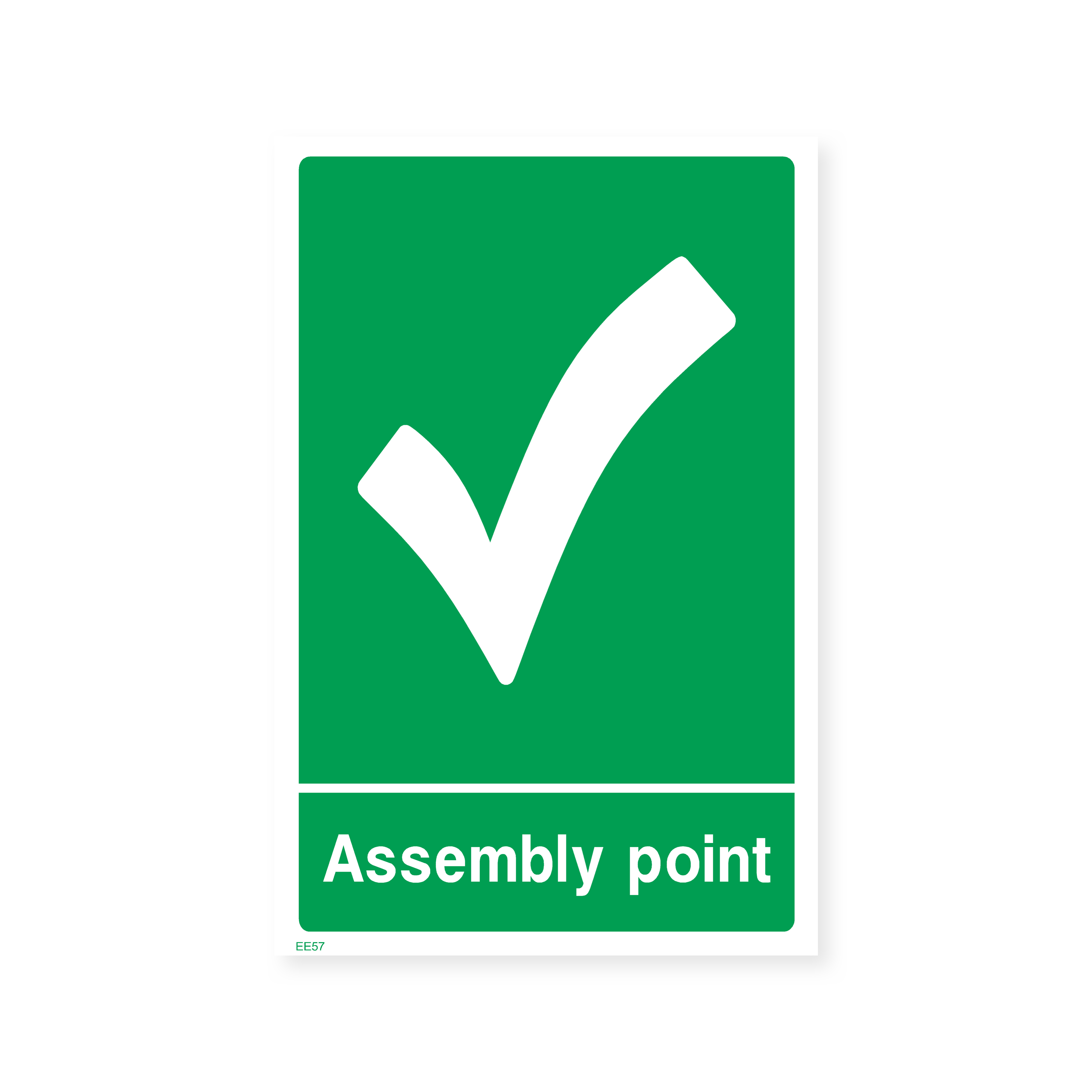 Clearly mark the designated assembly point with our "Assembly Point" sign. This sign helps individuals quickly gather at a safe location during emergencies or evacuations, ensuring their safety and facilitating an organized response.