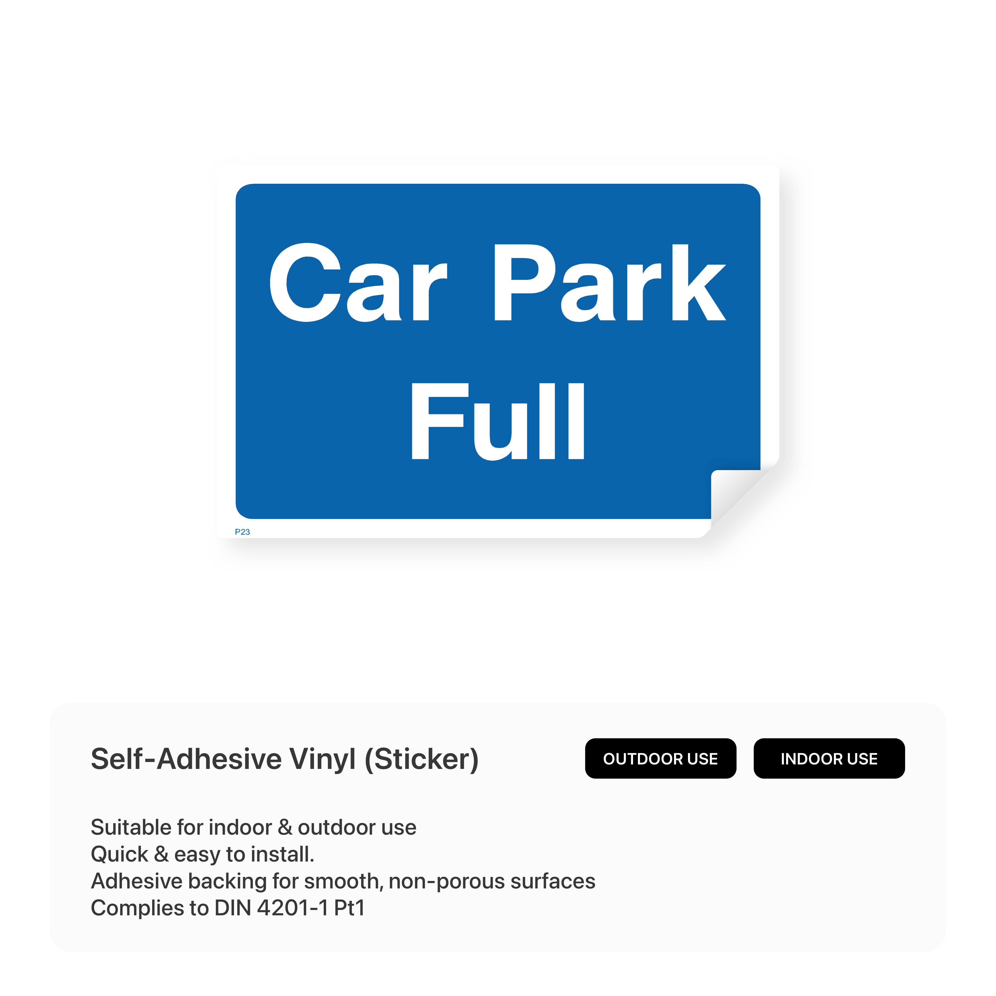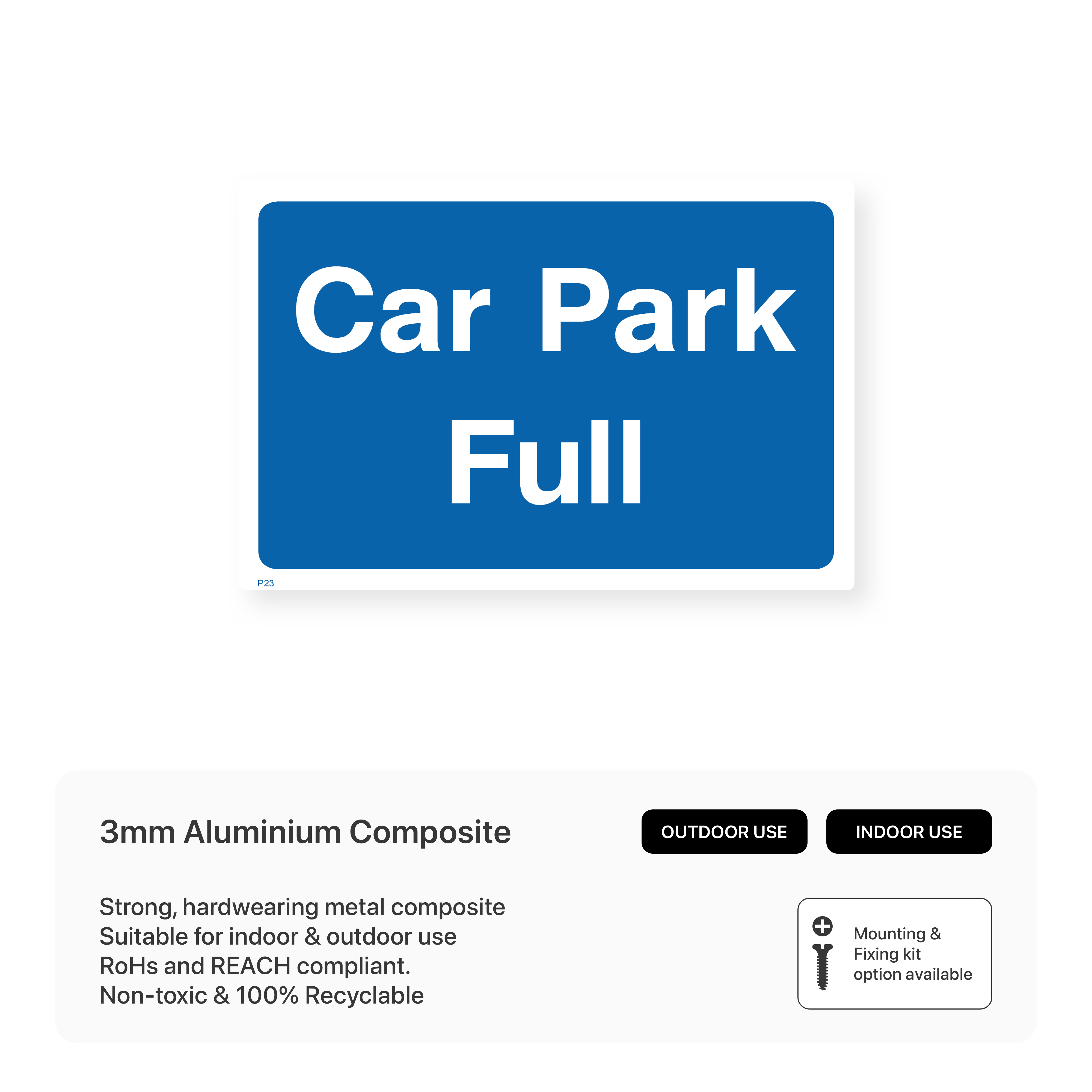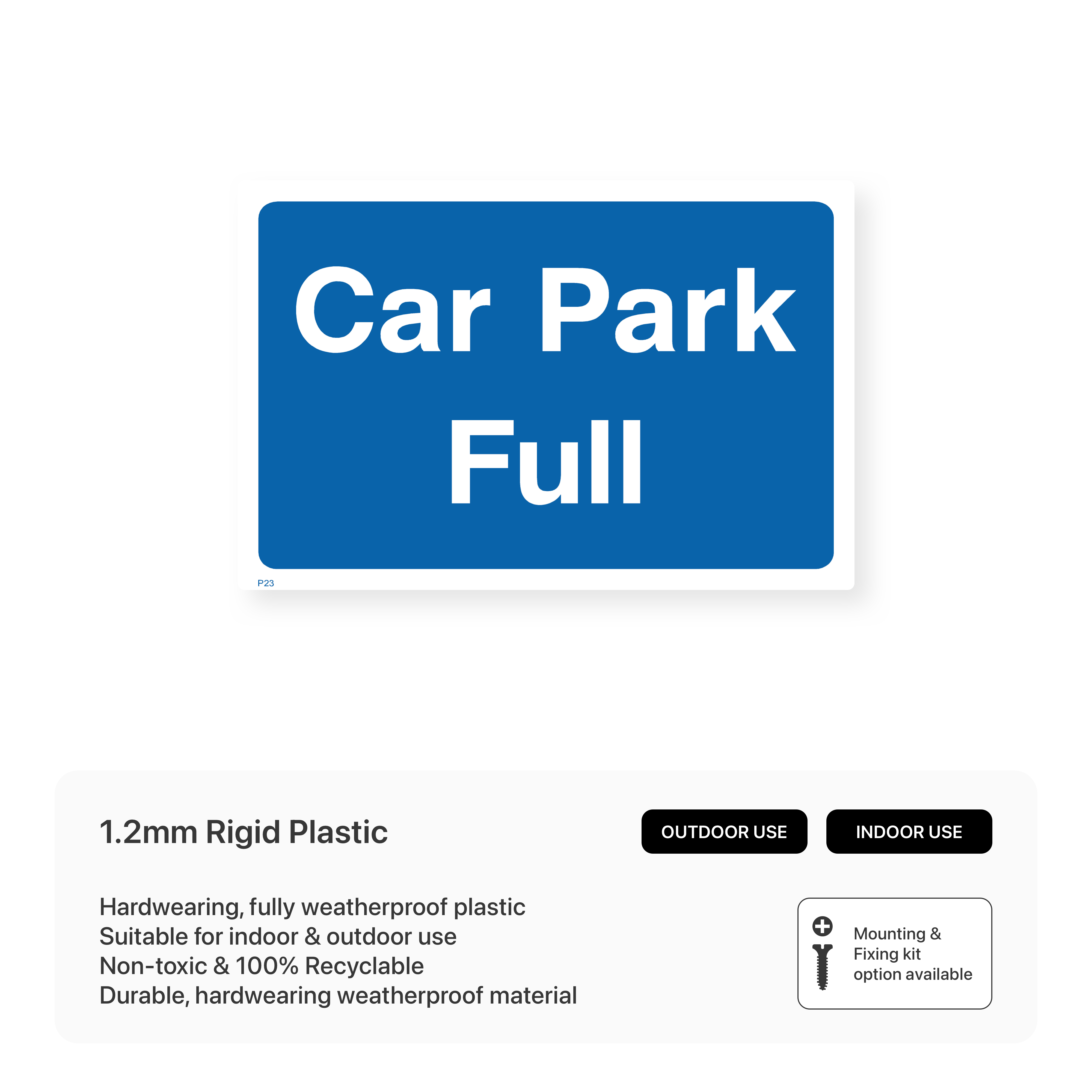 Inform drivers when your car park is at capacity with our "Car Park Full" sign. This sign helps manage traffic flow and prevents congestion by alerting drivers to seek alternative parking options. Choose from various sizes and materials to suit your specific needs and maintain smooth operations in your car park.