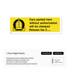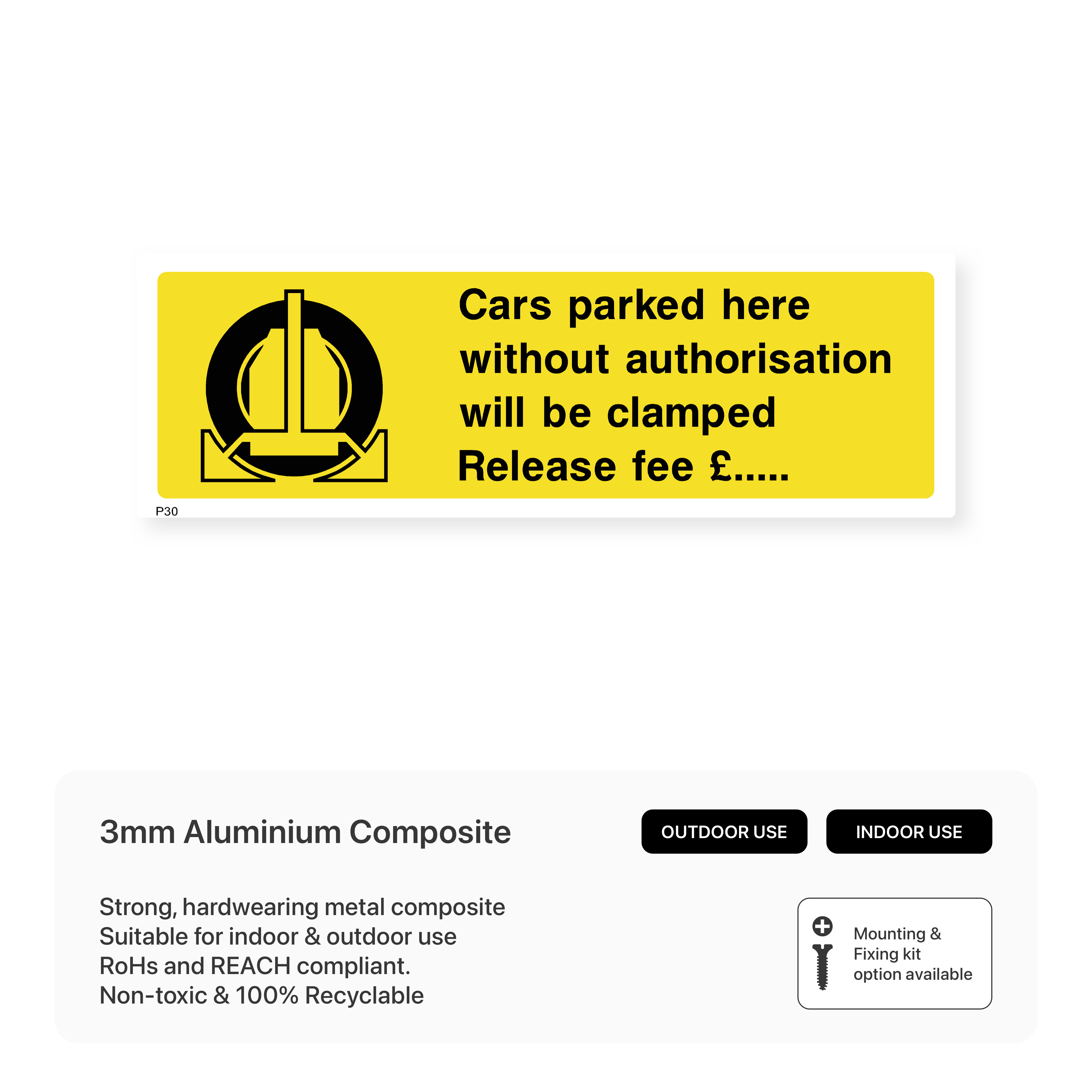 Effectively deter unauthorised parking with our "Cars Parked Here Without Authorisation Will Be Clamped - Release Fee £..." sign. This sign clearly displays the consequences of unauthorised parking, including clamping and the associated release fee. Ensure proper parking management and maintain order in your car park with this highly visible and informative sign.