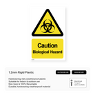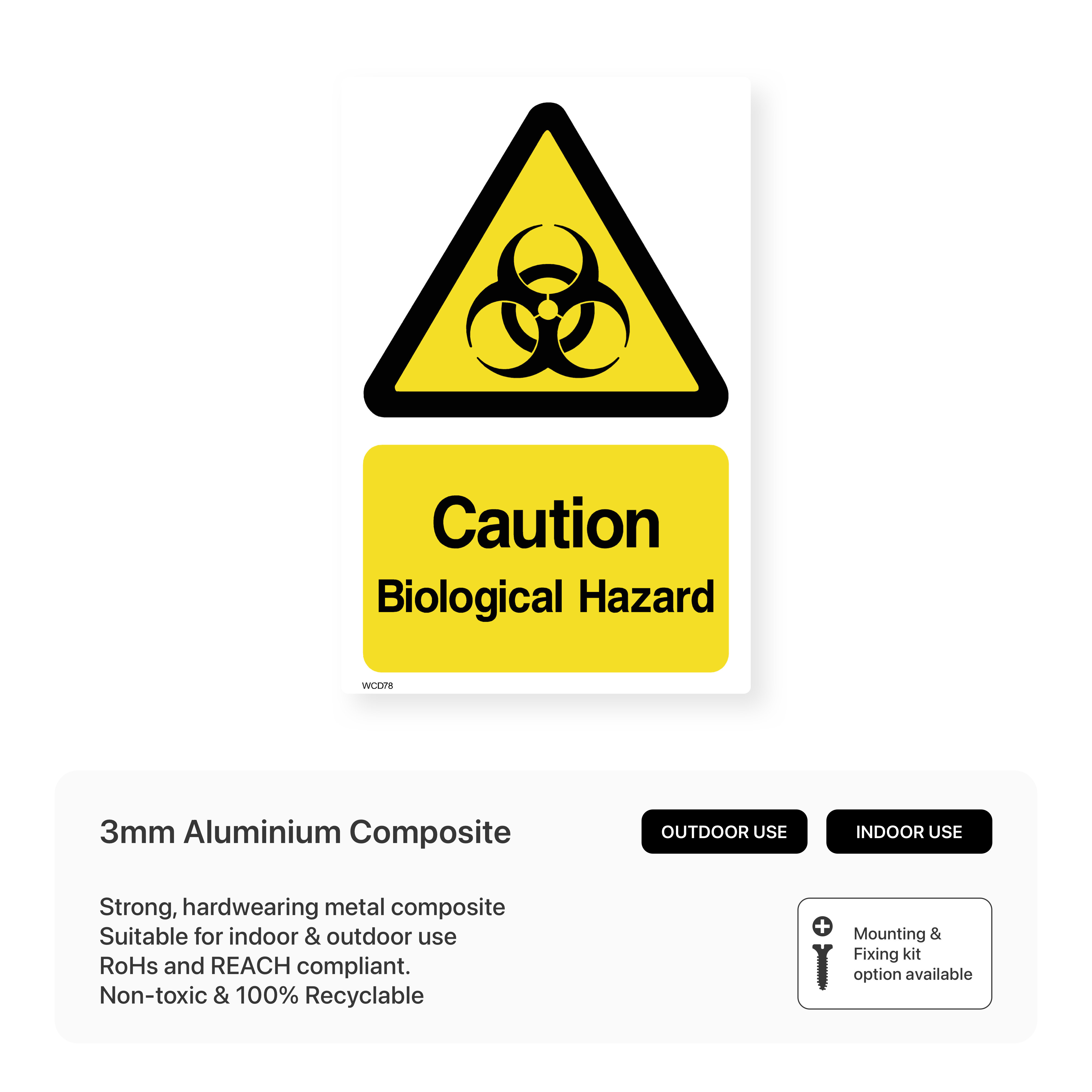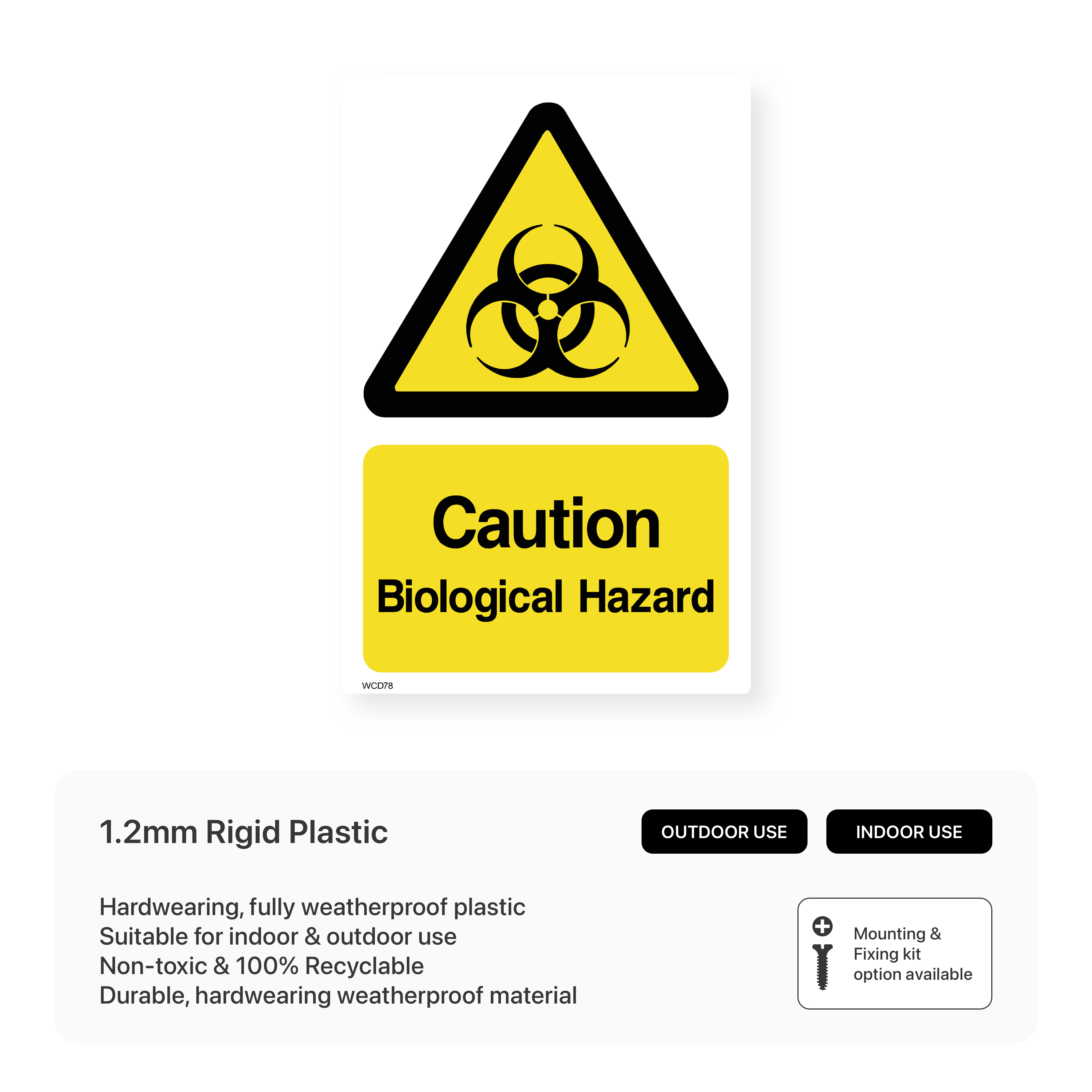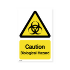 This portrait-oriented sign warns of the presence of biological hazards, such as bacteria, viruses, or other microorganisms. It reminds employees to follow safe work practices and wear appropriate protective equipment to prevent exposure and infection.