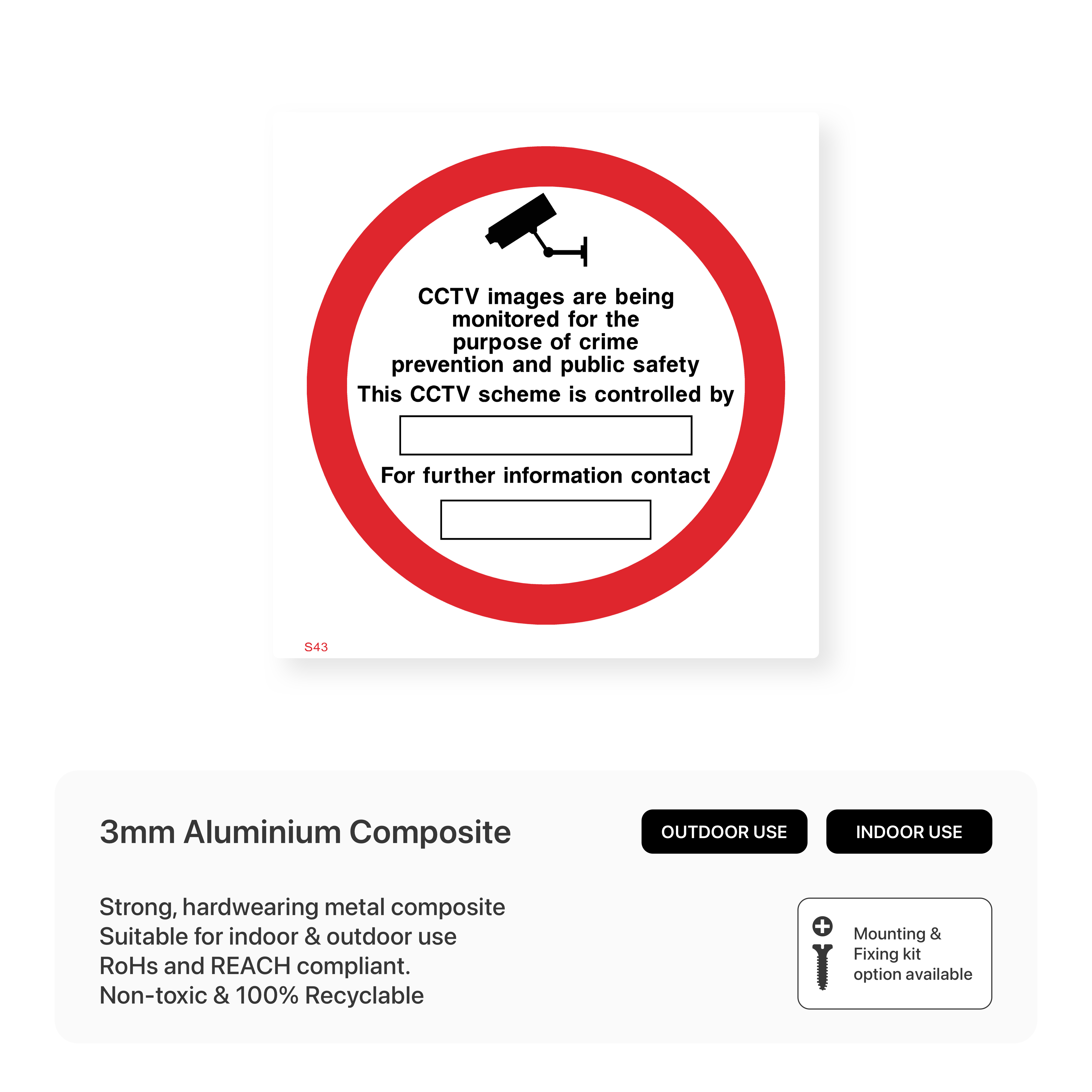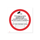 This sign explains the purpose of CCTV surveillance, emphasizing its role in crime prevention and public safety. It also informs the public about who controls the scheme and provides contact information.