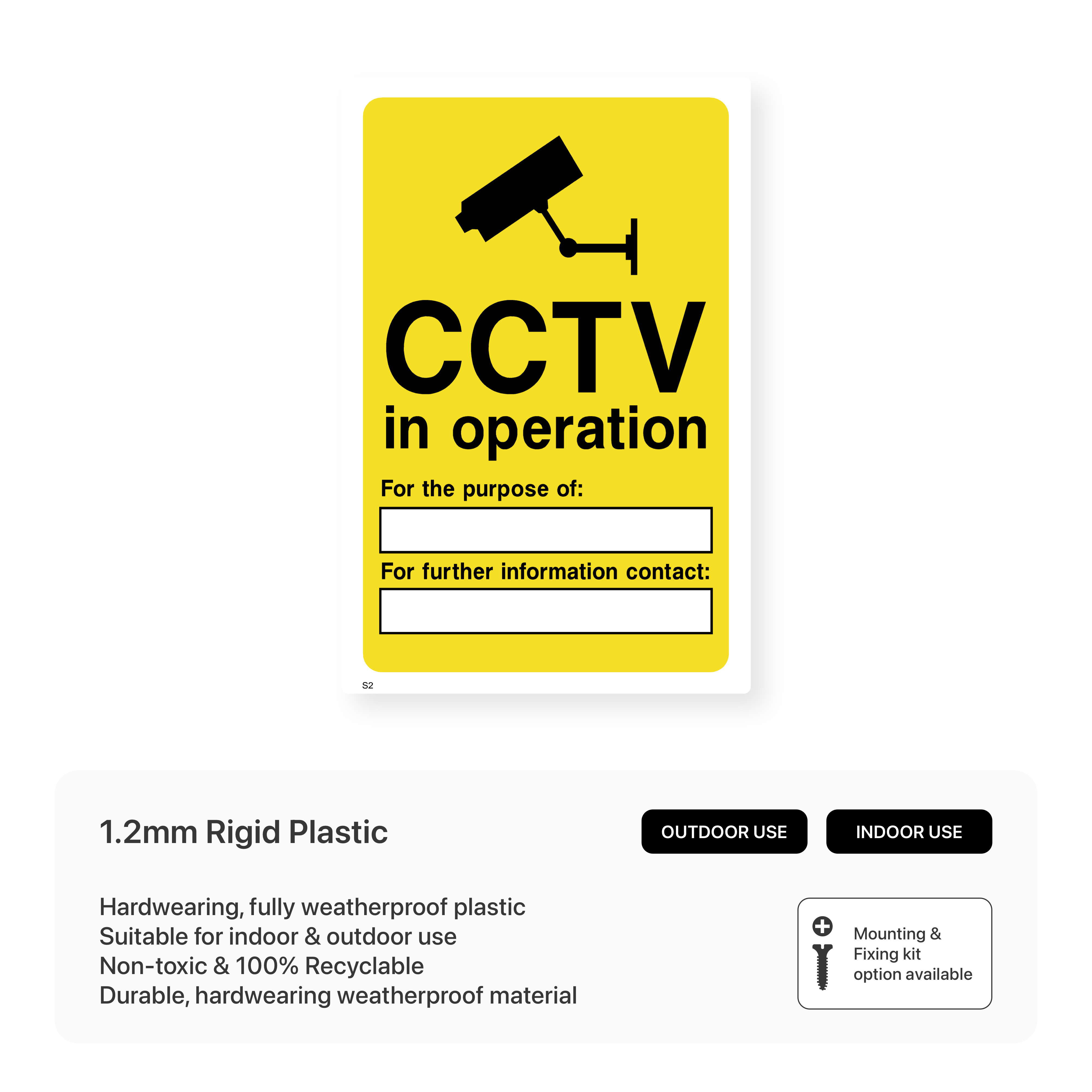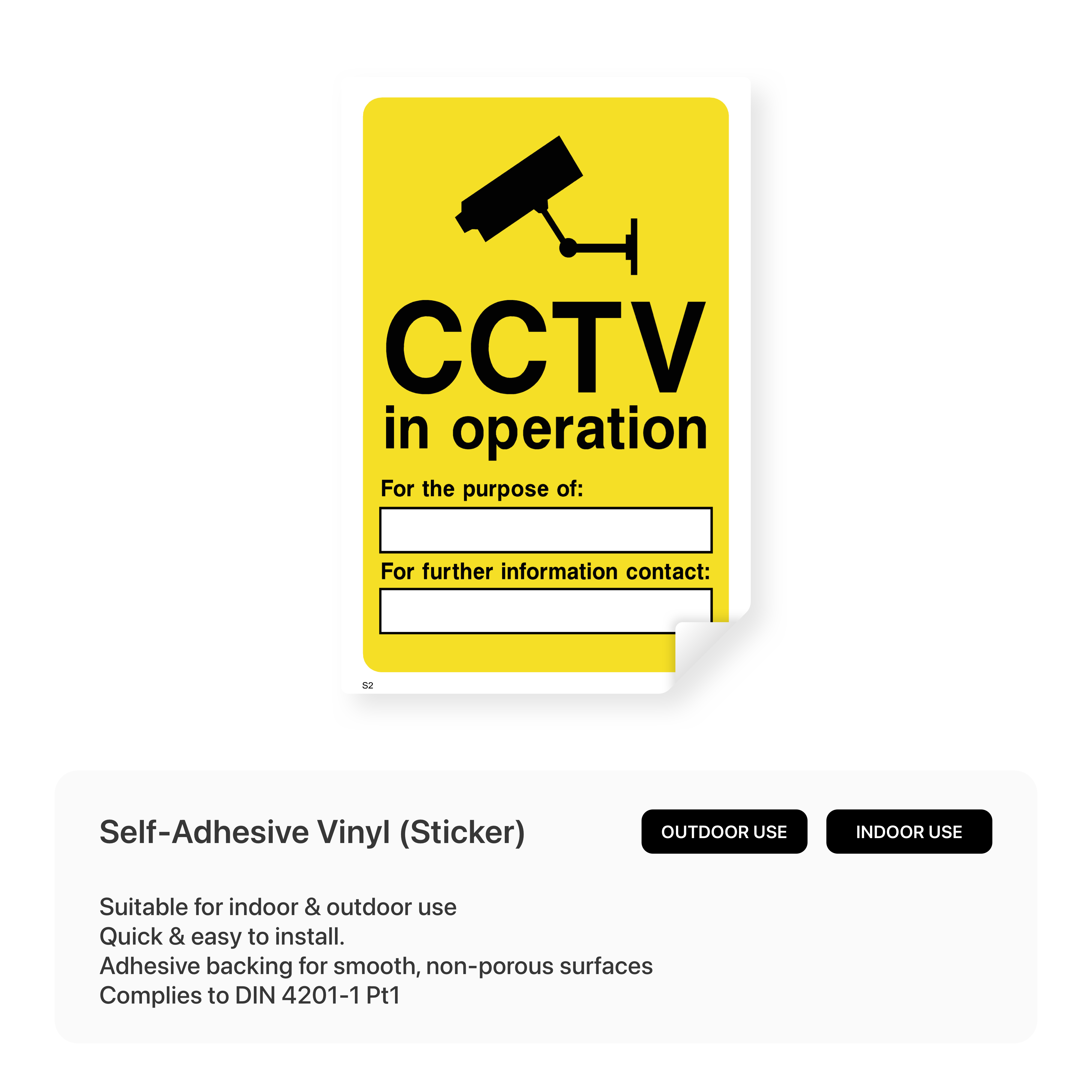 CCTV in operation - For the purpose of: Inform about the active use of CCTV surveillance. For the purpose of: State the specific purpose of the surveillance (e.g., crime prevention, security). For further information contact: Provide contact details for inquiries or concerns.