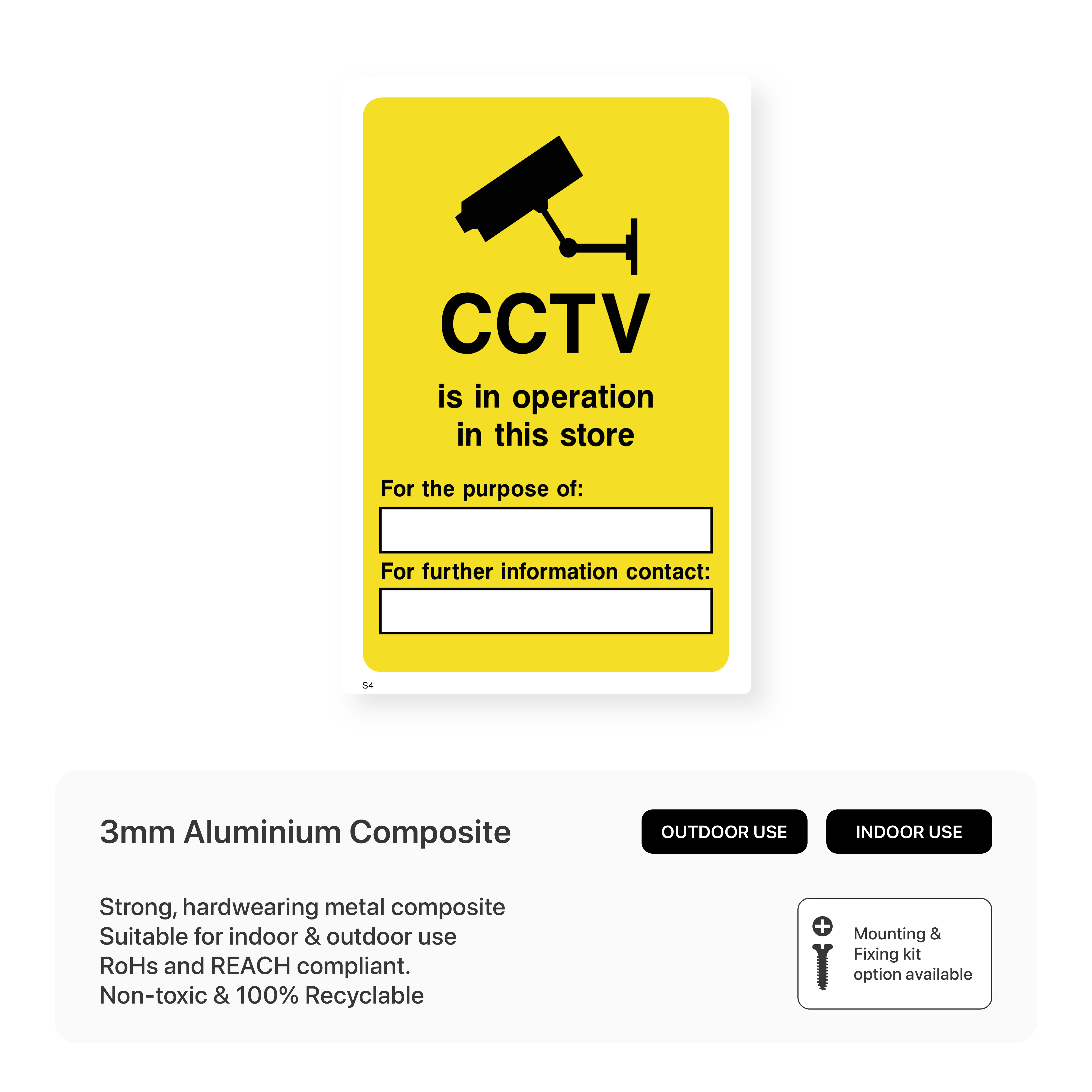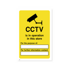 CCTV - is in operation in this store. Inform customers and staff about the presence of CCTV surveillance in your store. For the purpose of: Clearly state the purpose of surveillance (e.g., loss prevention, security). For further information contact: Provide contact details.