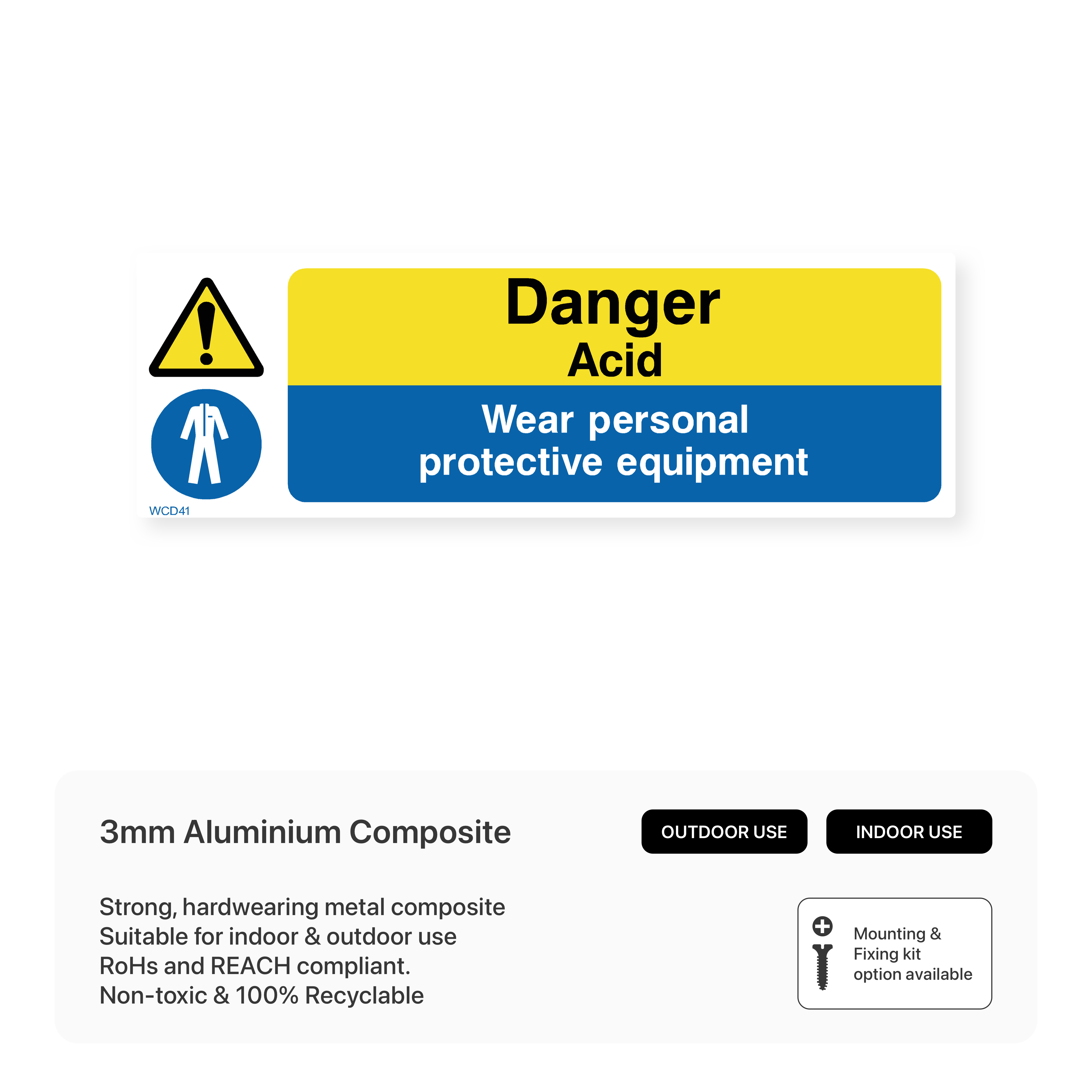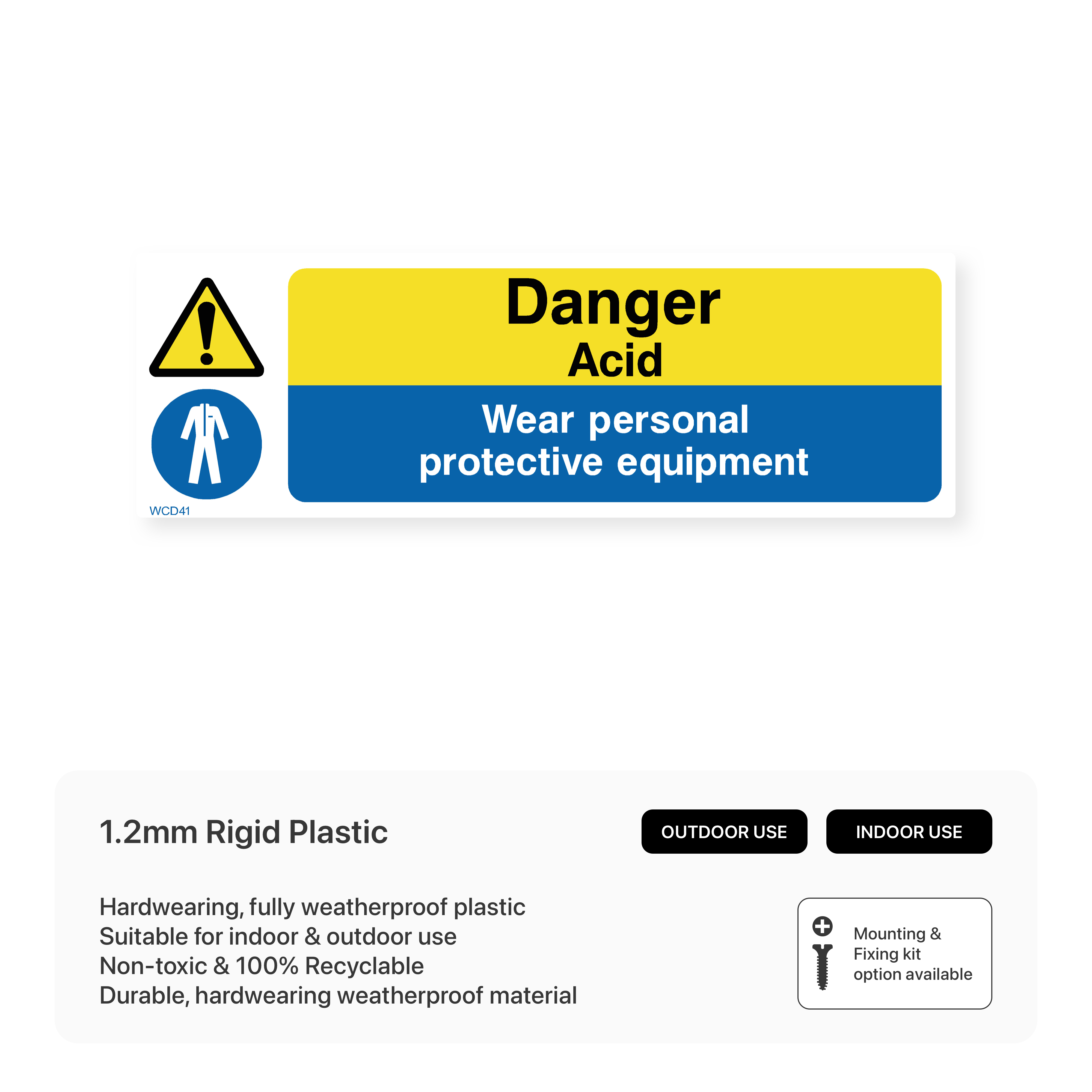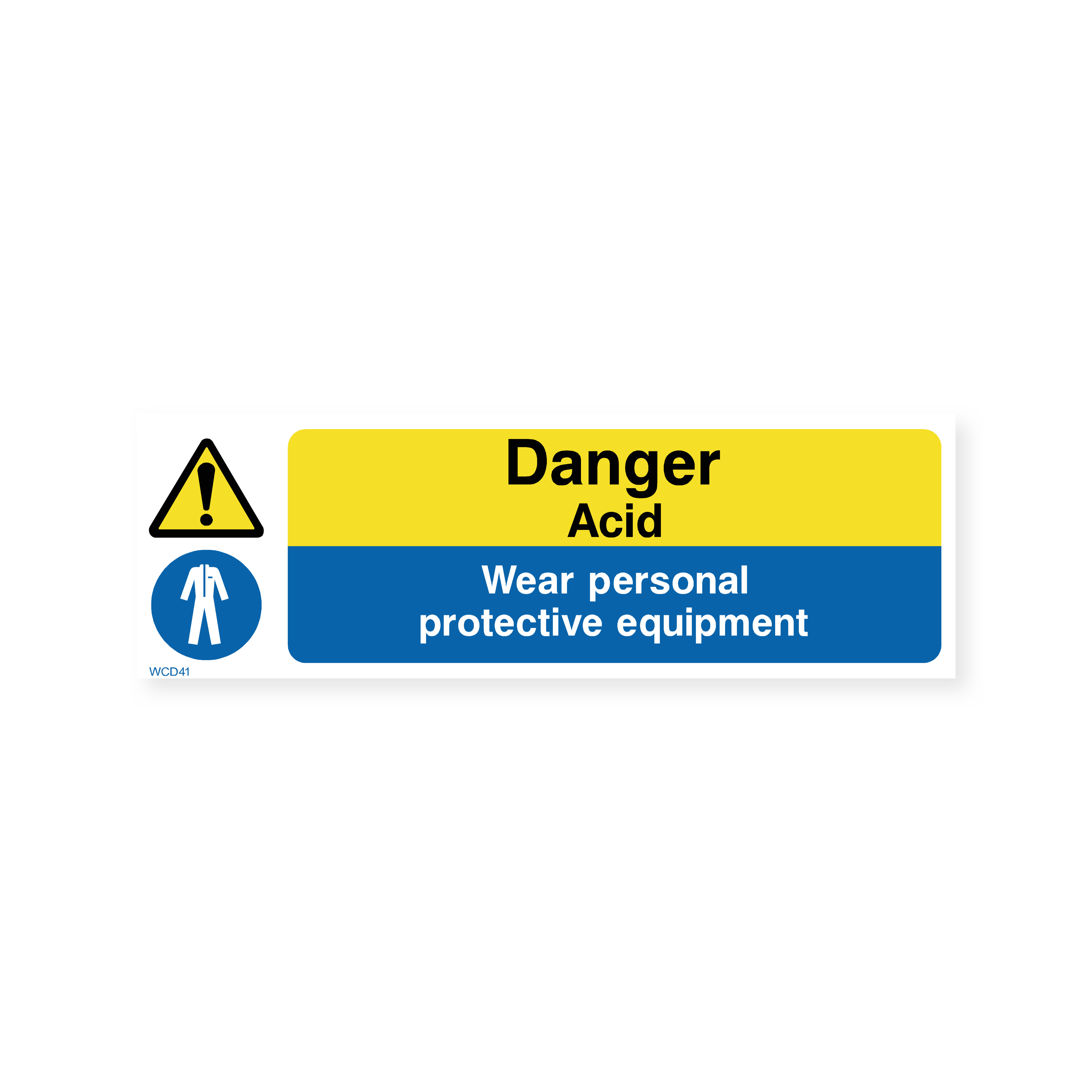 This sign combines the warning of acid hazards with the reminder to wear personal protective equipment. It ensures that employees are aware of the risks and take necessary precautions when working with acids.