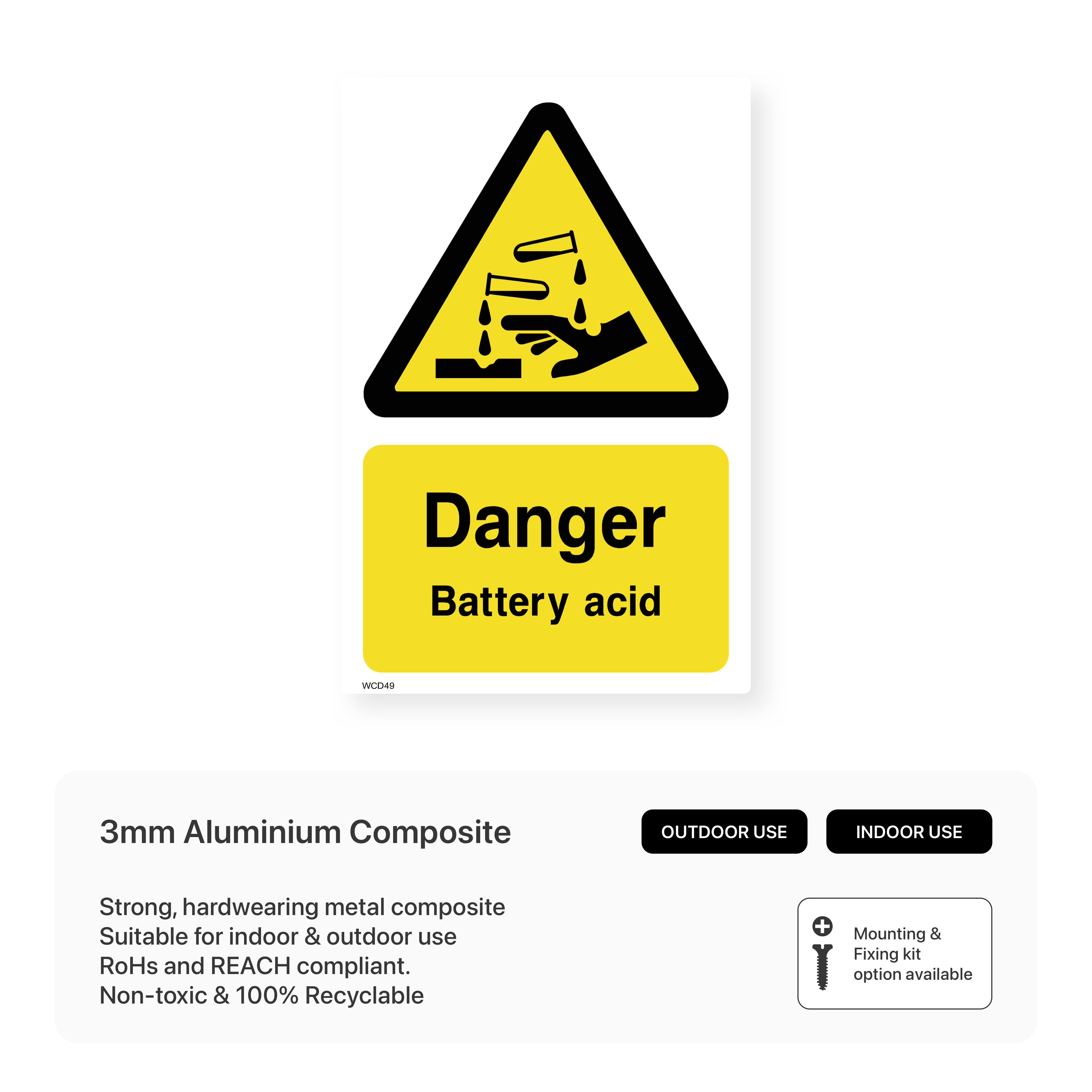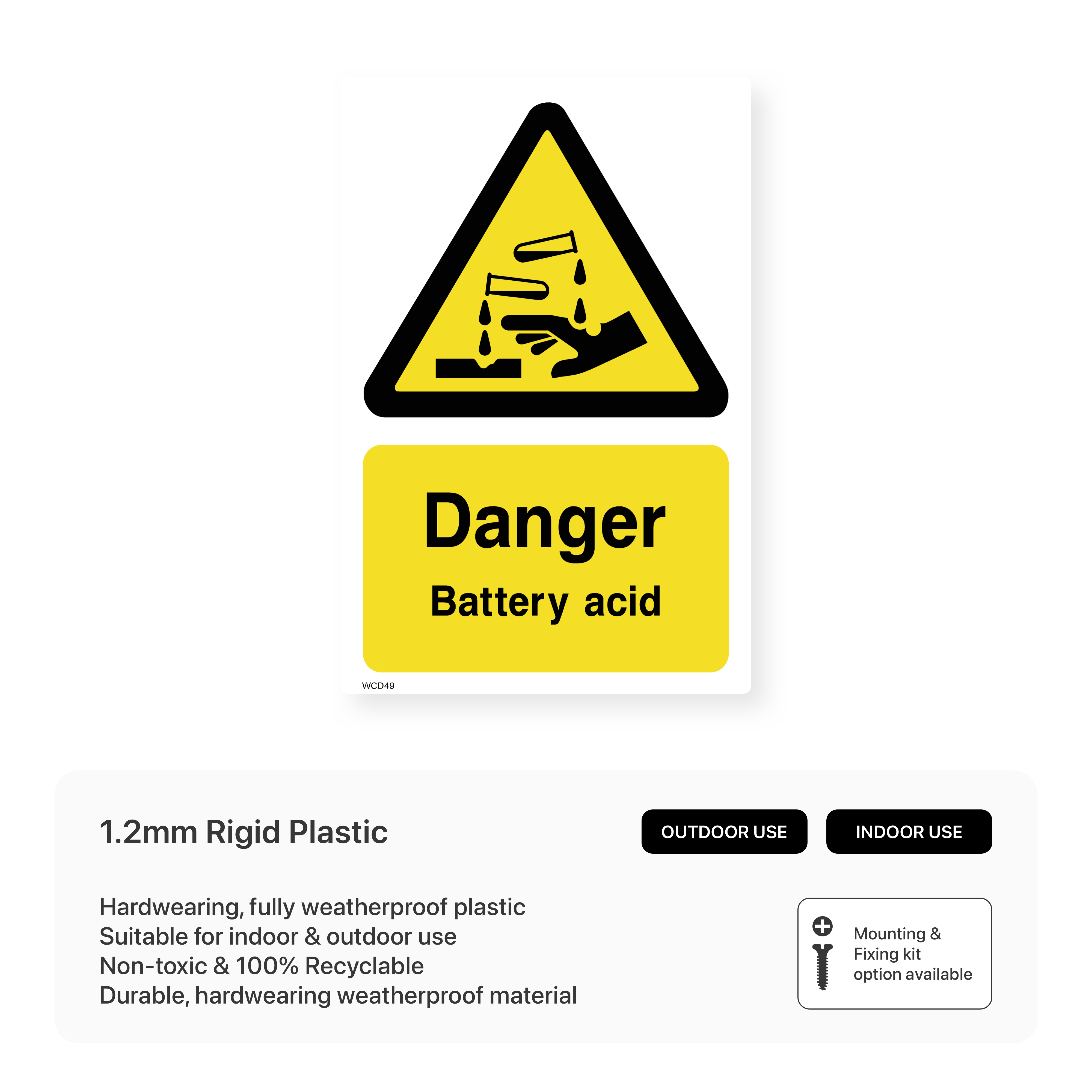 Warn of the potential dangers of battery acid with this clear and visible portrait sign. Help to prevent accidents and injuries in workplaces where batteries are handled or stored. Available in various sizes and materials.