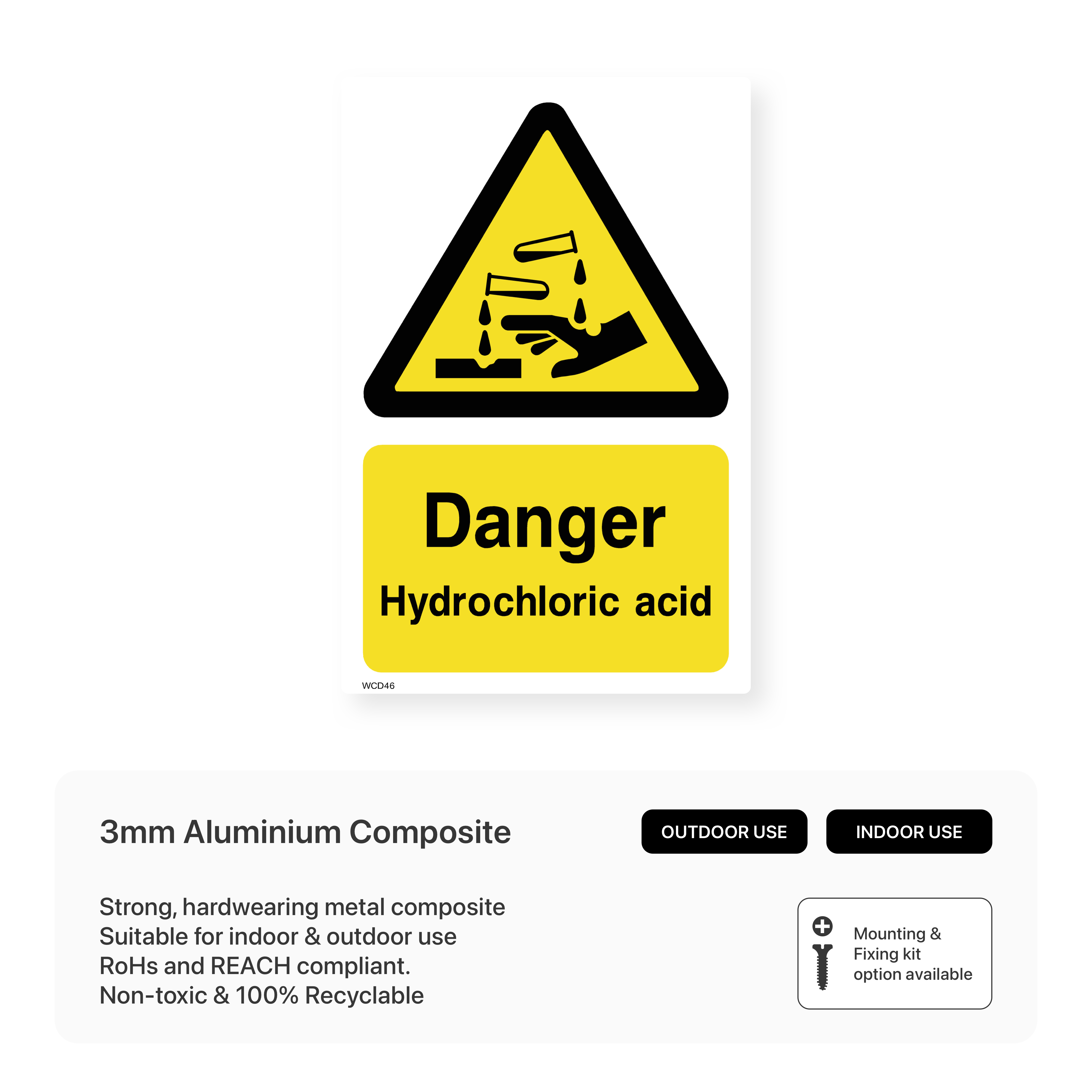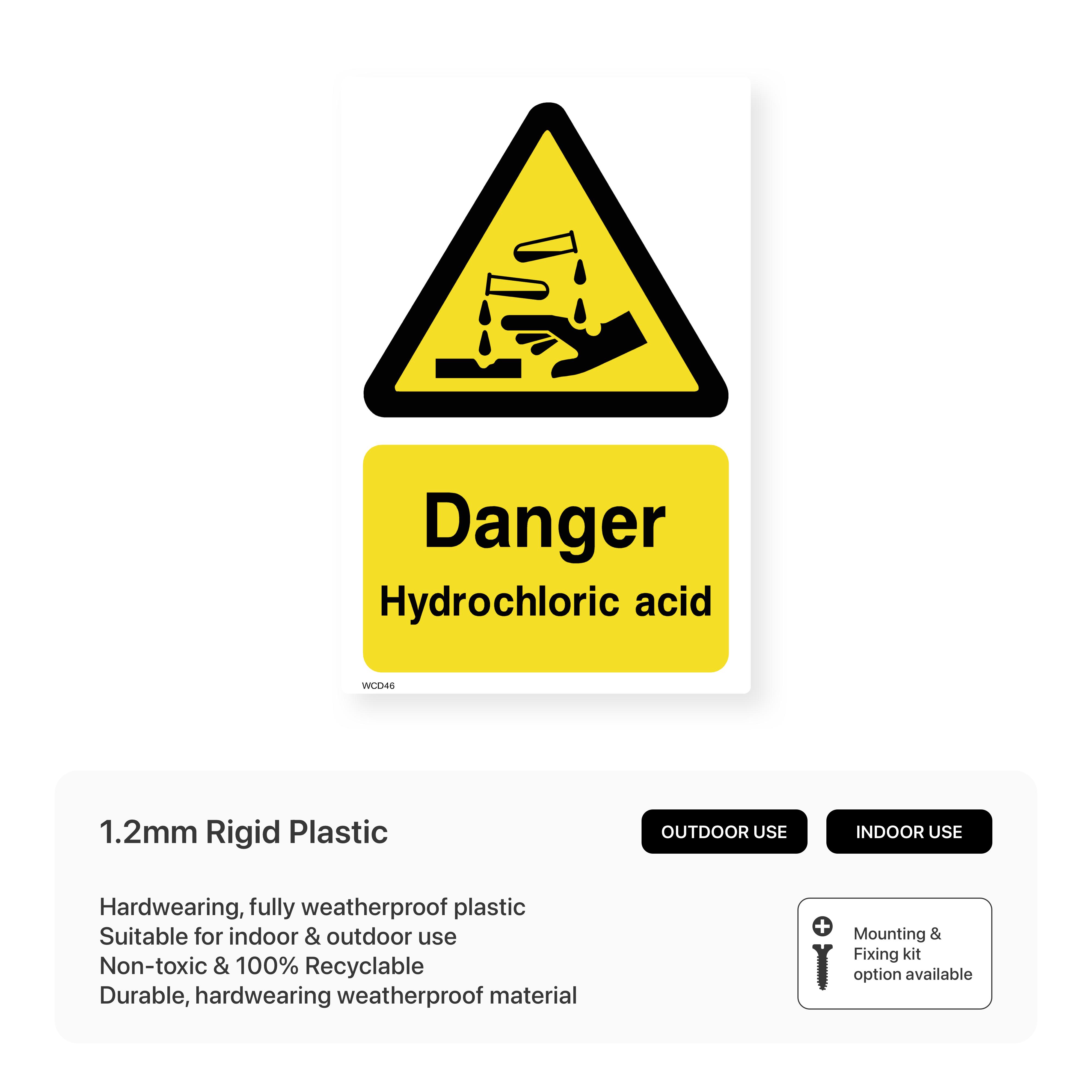 Clearly warn of the dangers of hydrochloric acid with this sign. This highly visible warning helps to prevent accidents and injuries in workplaces where hydrochloric acid is present.