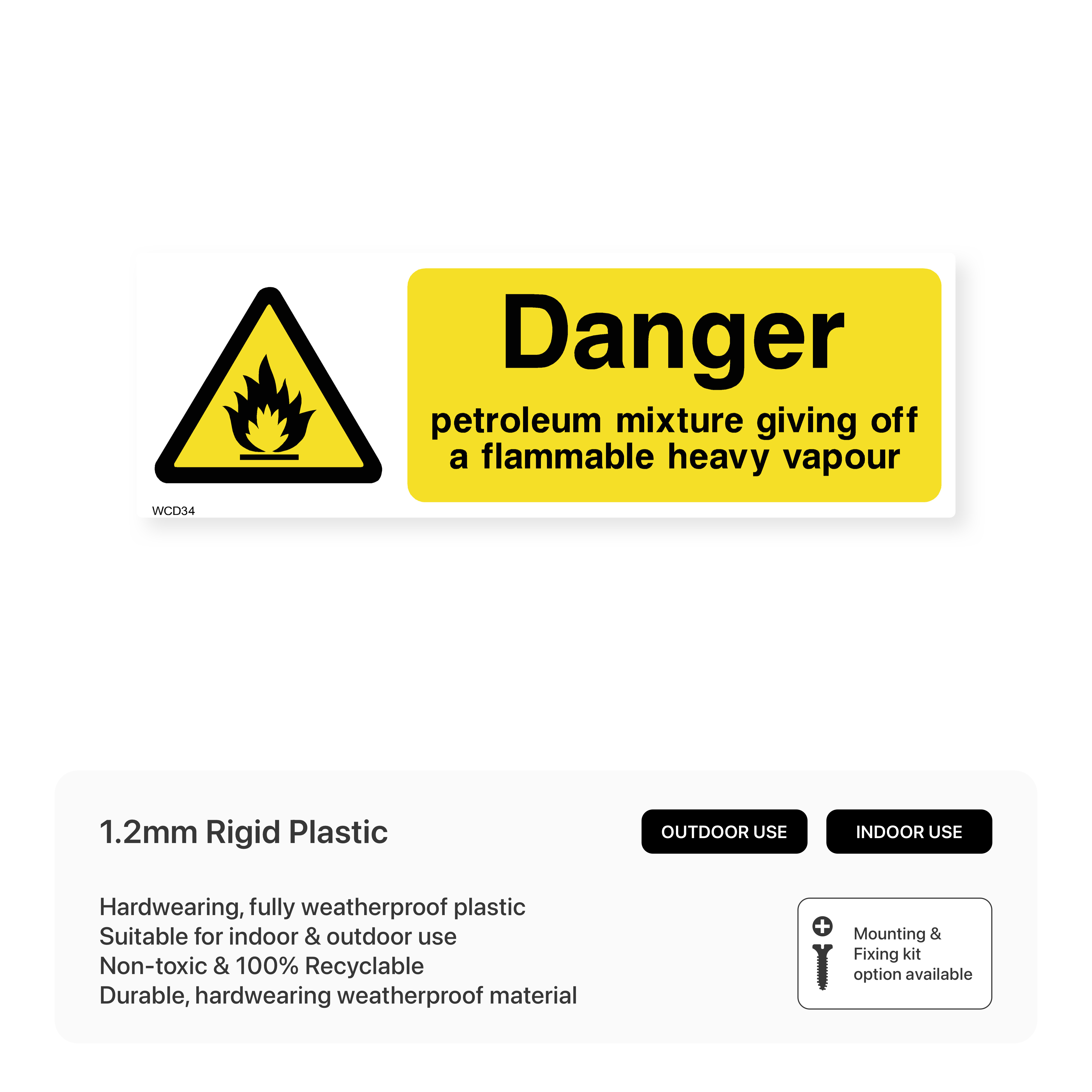 This sign warns of the specific dangers associated with petroleum mixtures that emit flammable vapours. It helps to prevent accidents and injuries in workplaces where these substances are present.