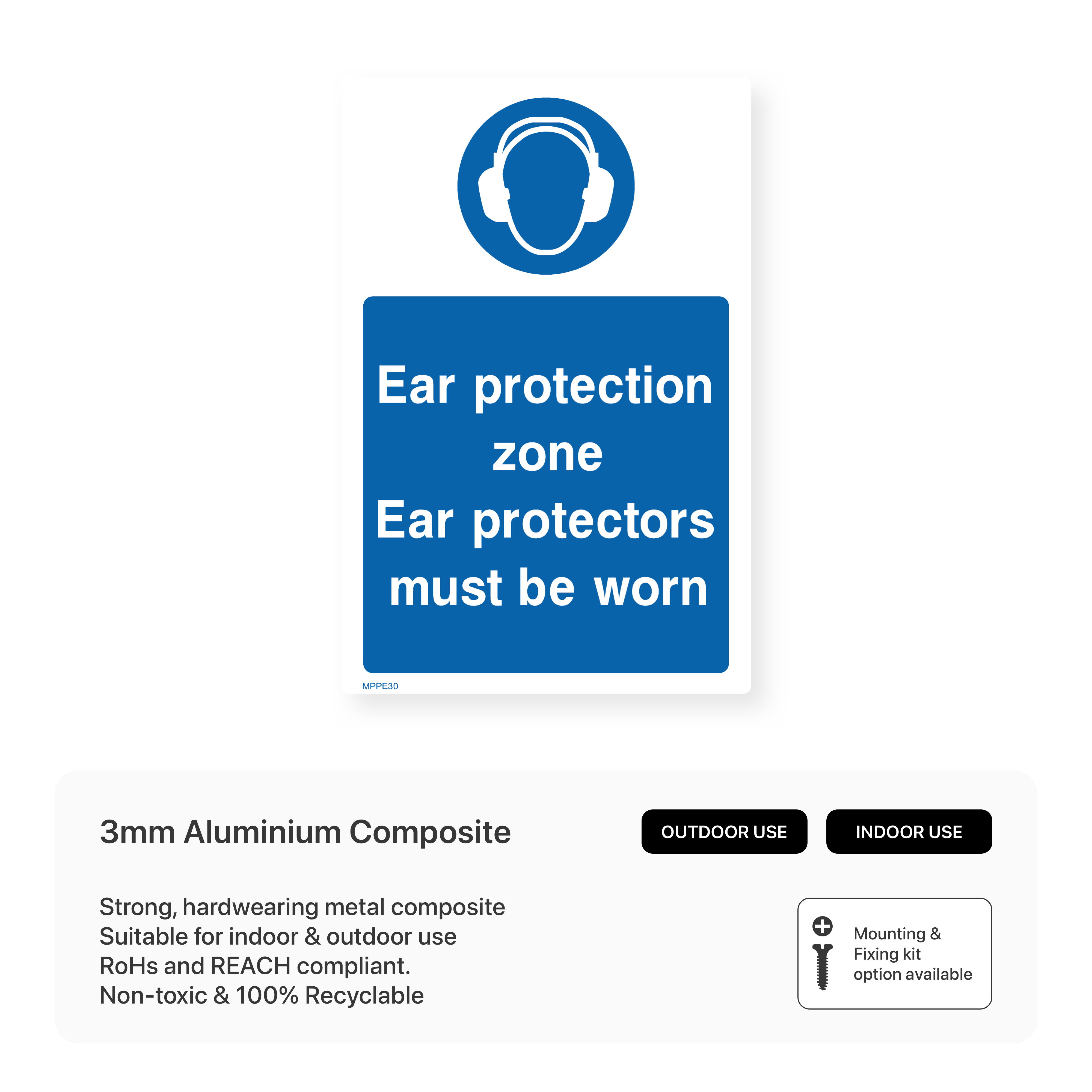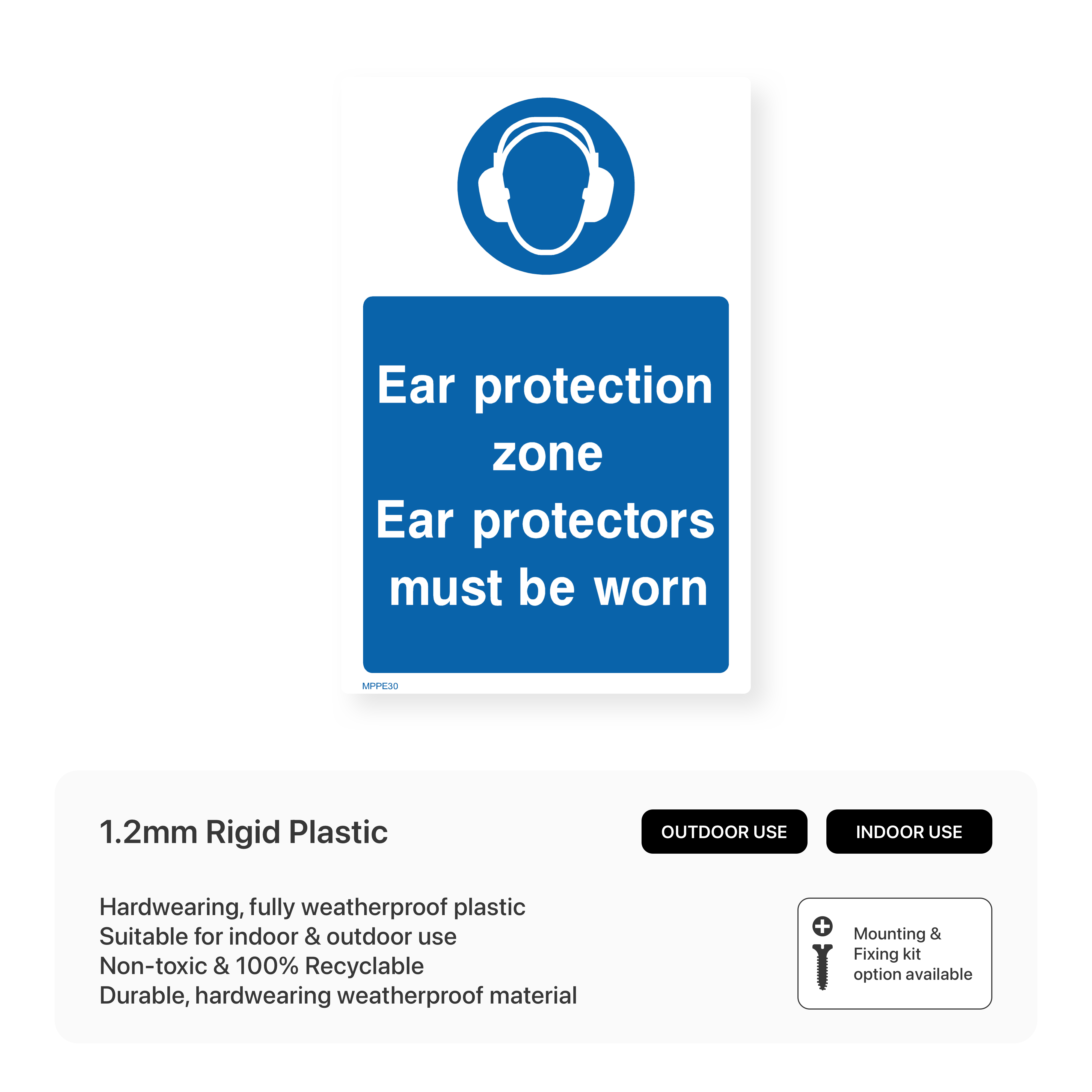 Clearly mark areas where ear protection is mandatory with our "Ear Protection Zone" portrait sign. This sign effectively communicates the importance of hearing protection in designated areas, reducing the risk of hearing damage. Ensure a safe workplace and protect your employees' hearing with our durable and compliant safety signage.