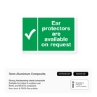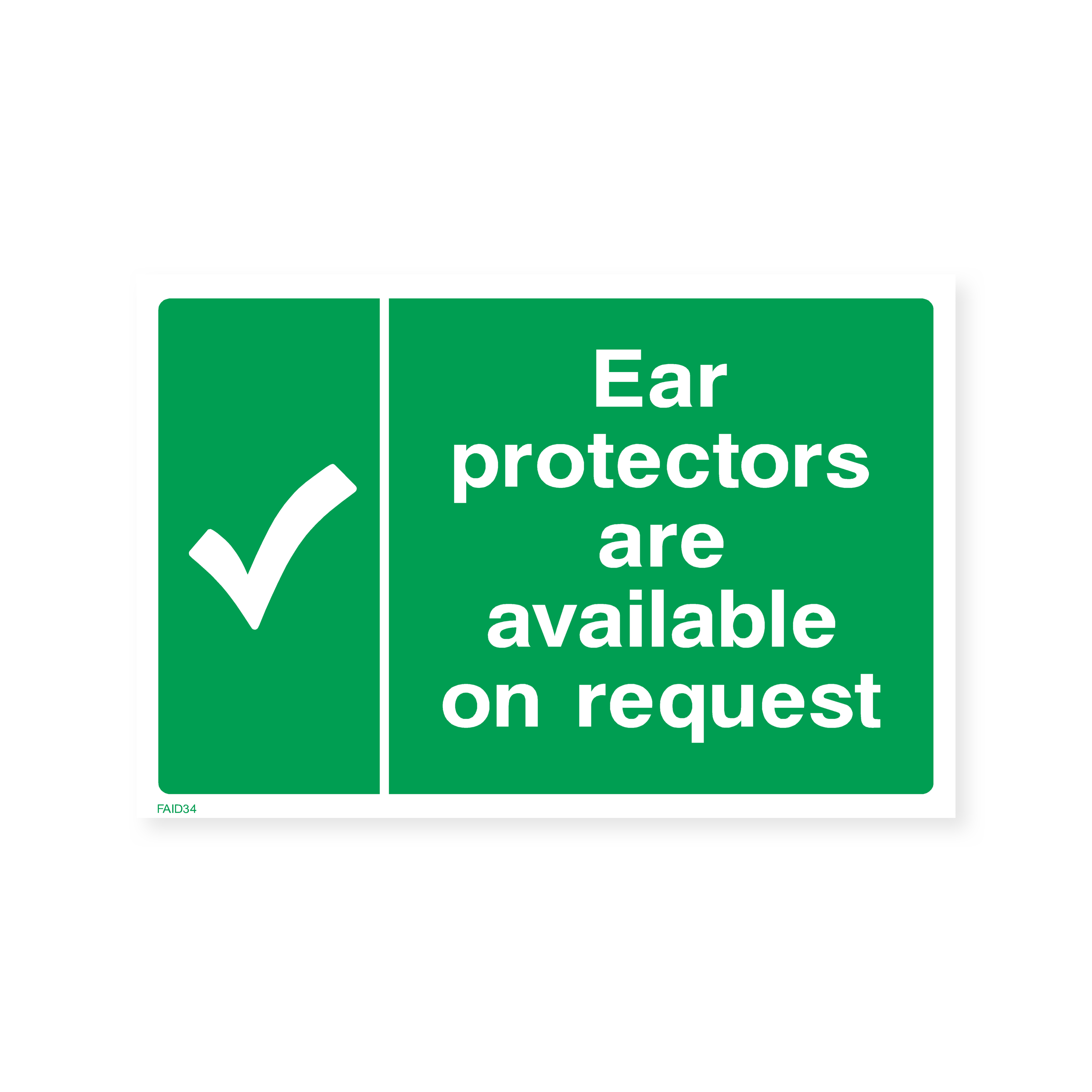 Inform individuals about the availability of ear protection with our "Ear protectors are available on request" sign. This sign encourages the use of ear protection in noisy environments and ensures that individuals know where to obtain it.