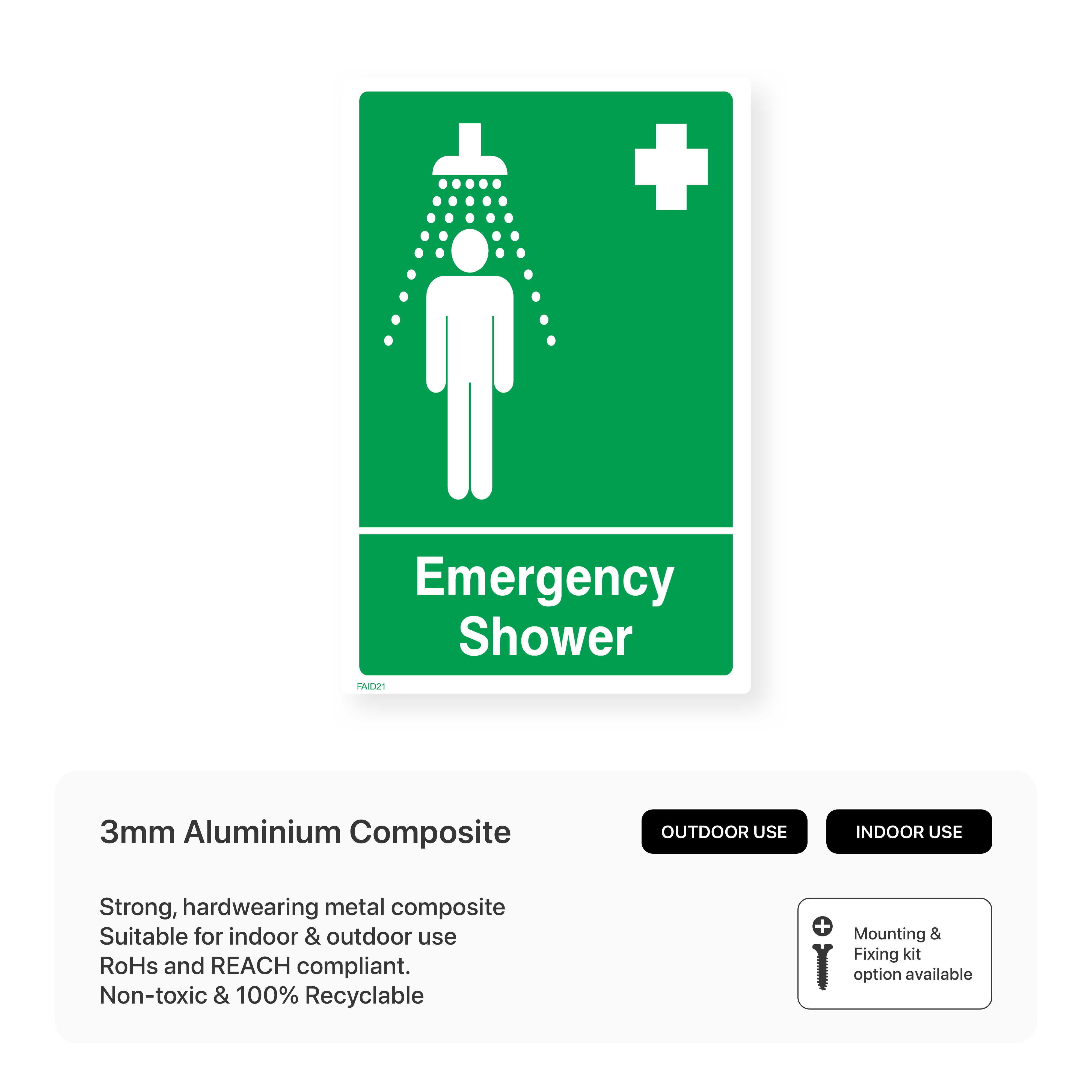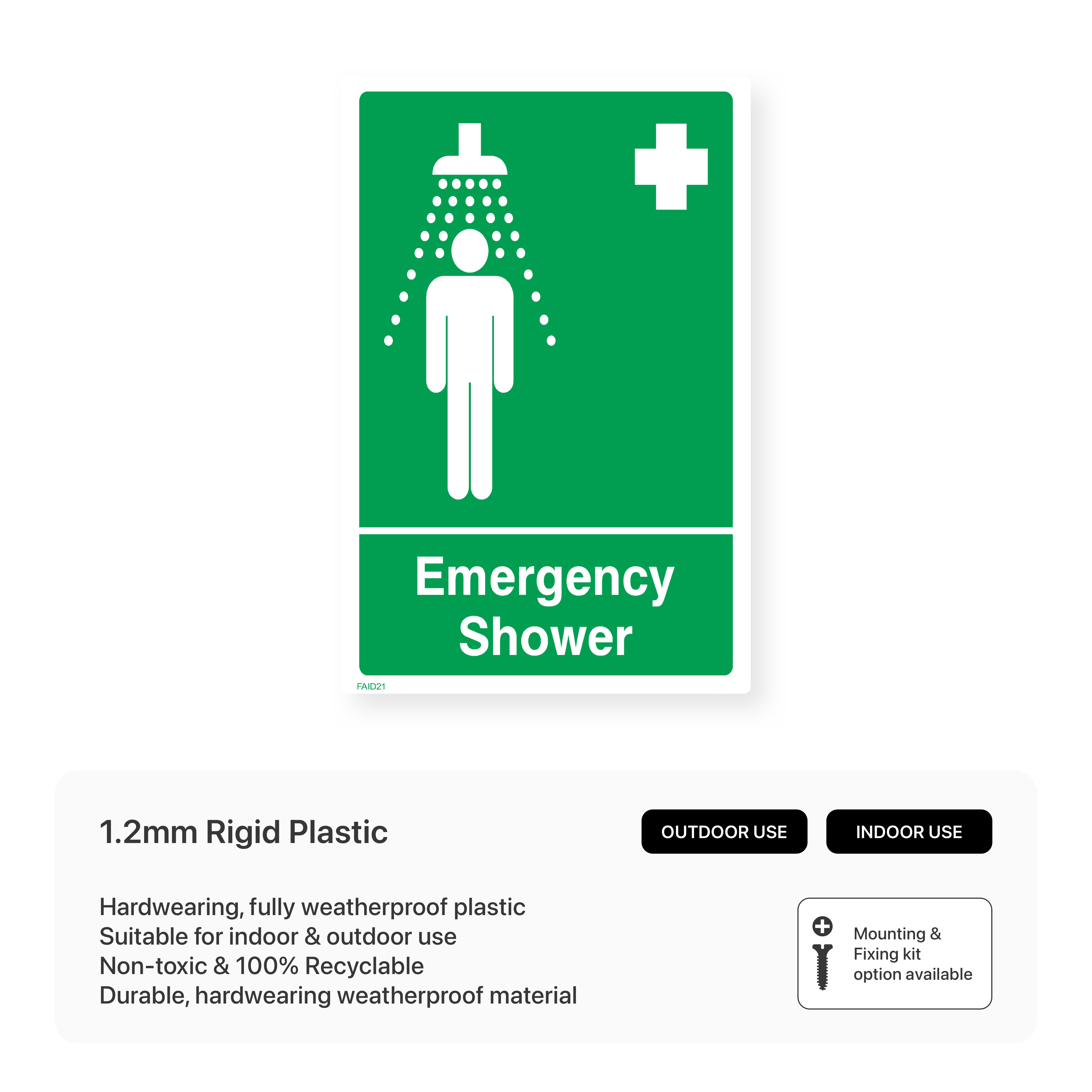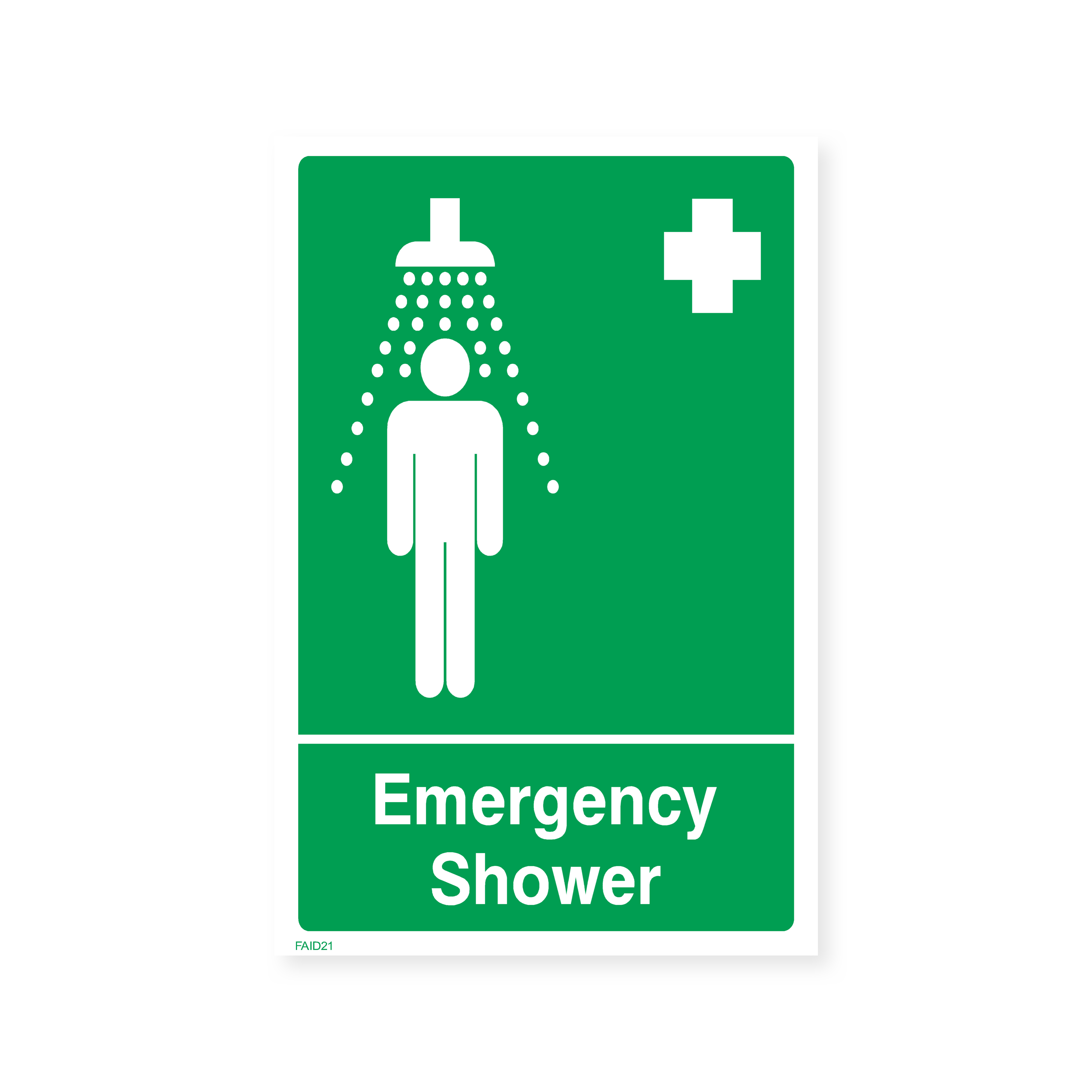 Ensure immediate access to emergency showers with our "Emergency Shower" sign. This sign clearly marks the location of the nearest emergency shower, allowing for quick response in case of chemical spills or exposure.