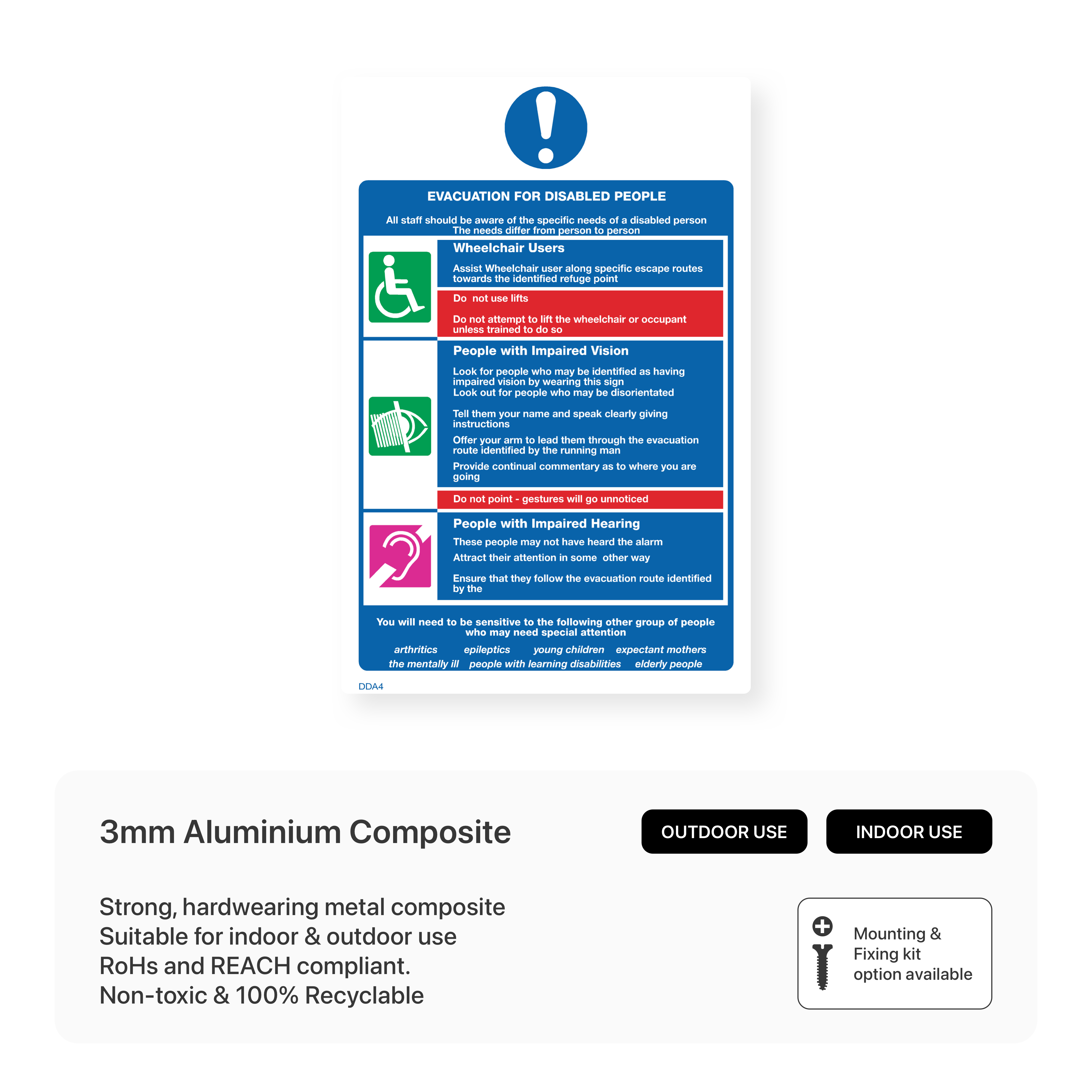 Provide clear guidance during emergencies with our "Evacuation for disabled people" sign. This sign directs individuals with disabilities to designated evacuation routes and procedures, ensuring their safe and efficient evacuation.