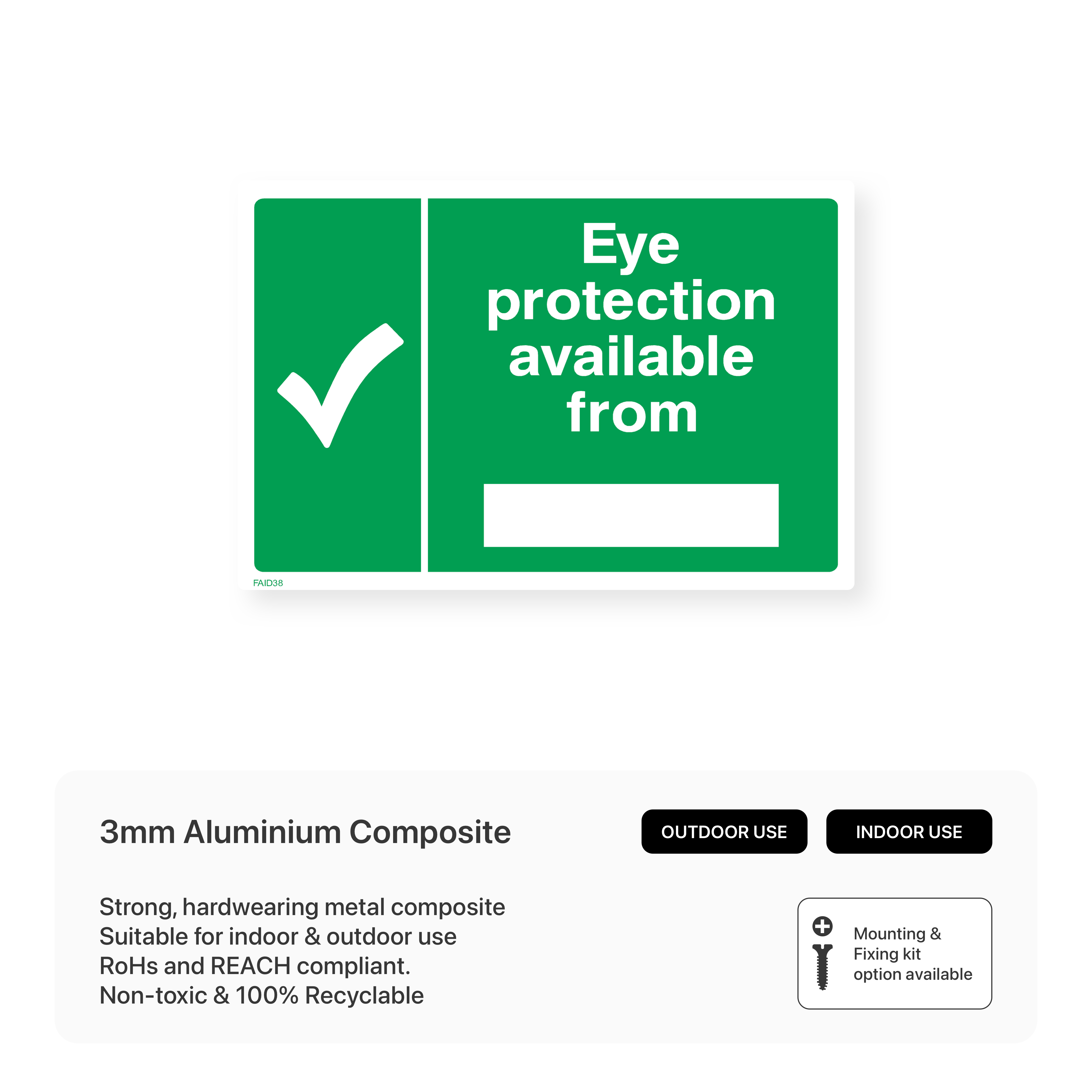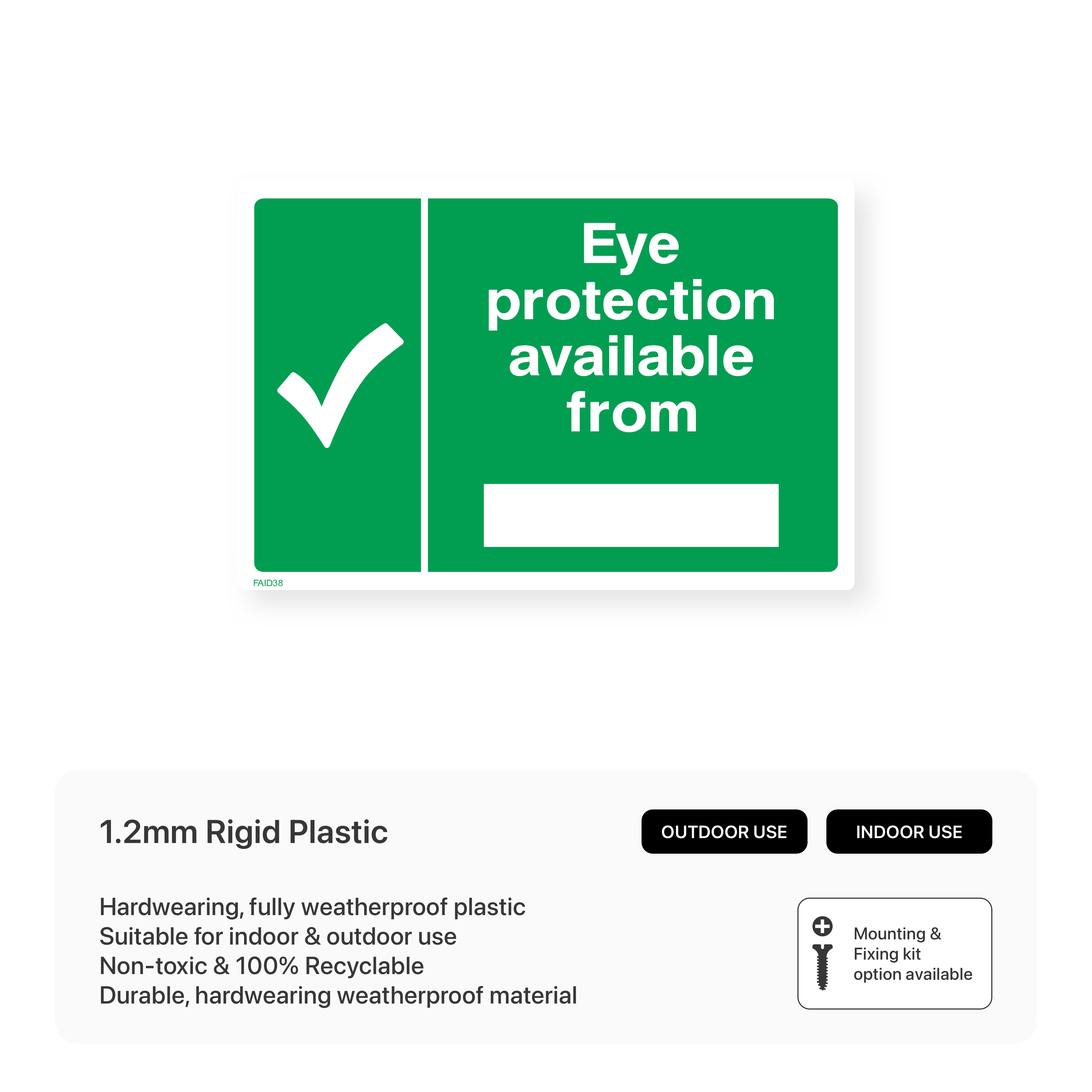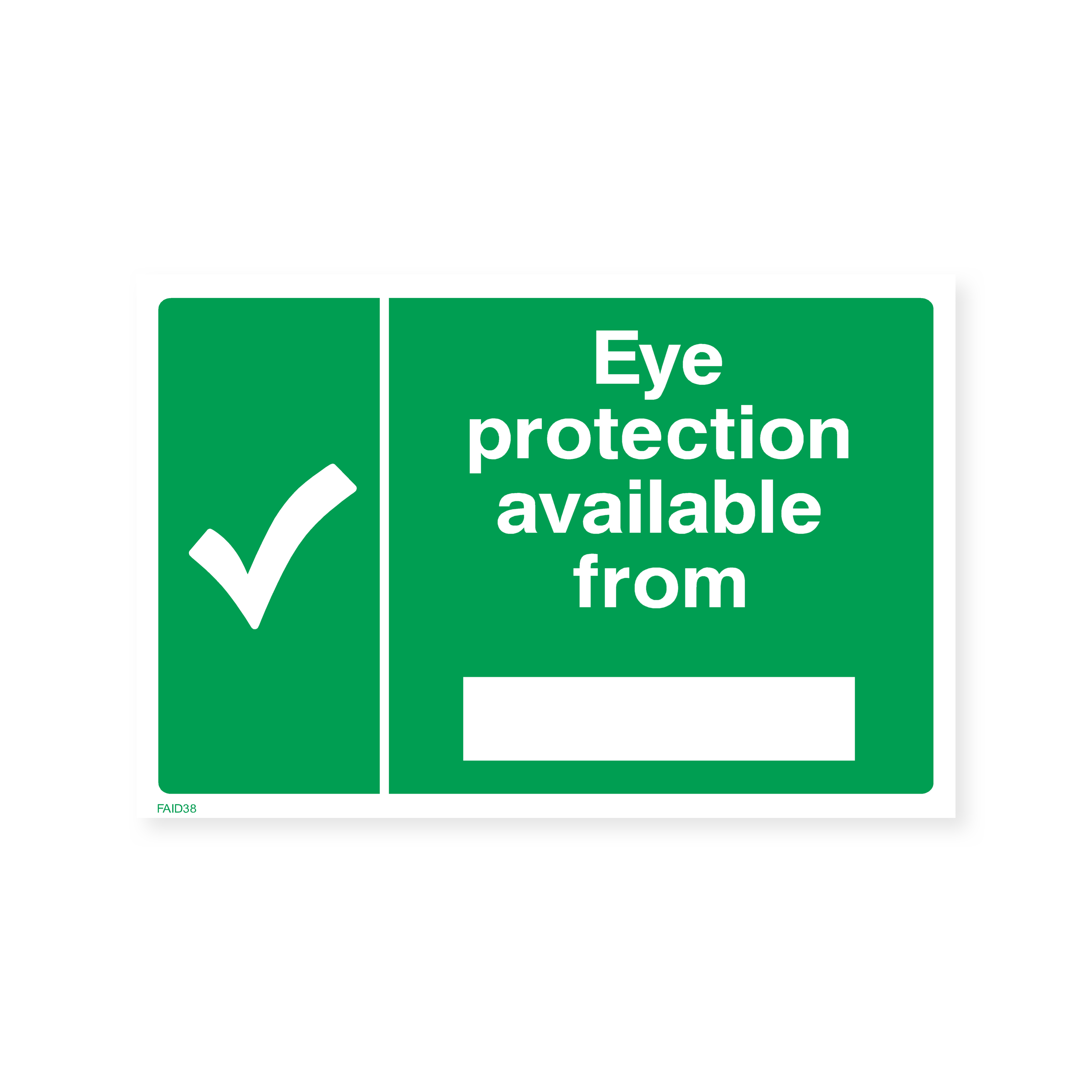 Clearly mark the location where eye protection can be obtained with our "Eye protection available from" sign. This sign ensures that individuals can easily find and access eye protection when needed, promoting eye safety in the workplace.