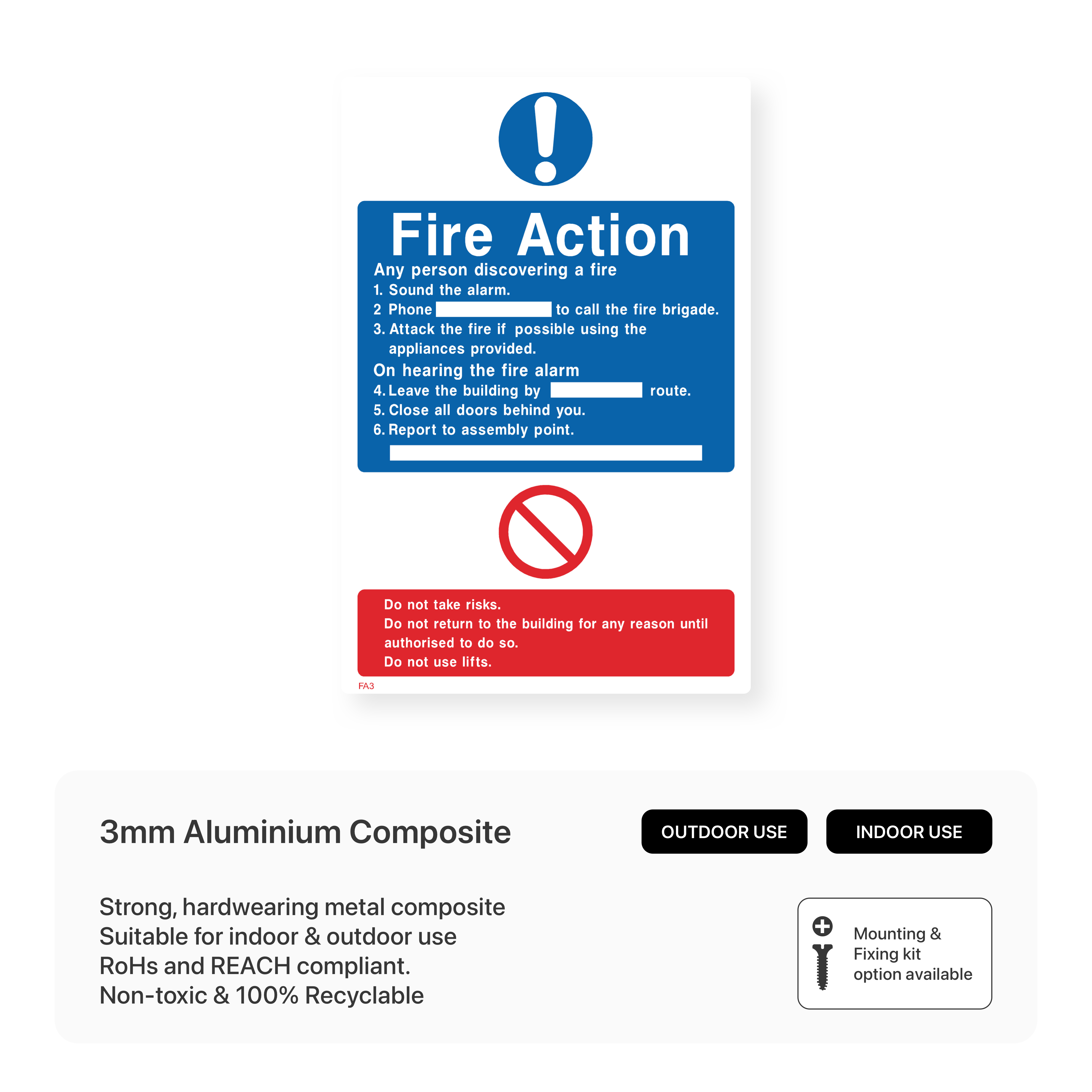 Promote immediate action during fire emergencies with our "Fire Action - Any person discovering a fire sound the alarm" sign. This sign empowers individuals to take responsibility and raise the alarm promptly upon discovering a fire, ensuring a swift response and increased safety.