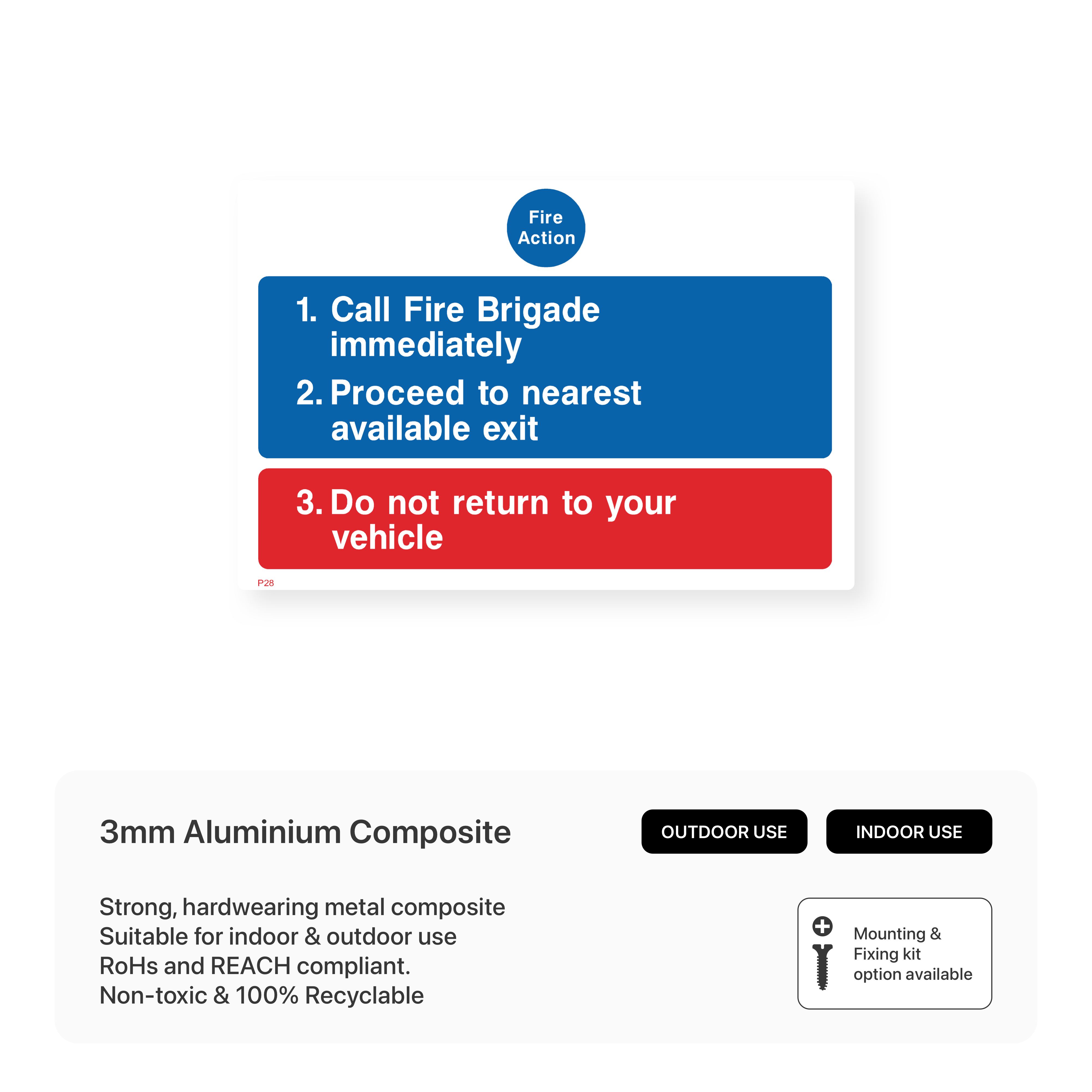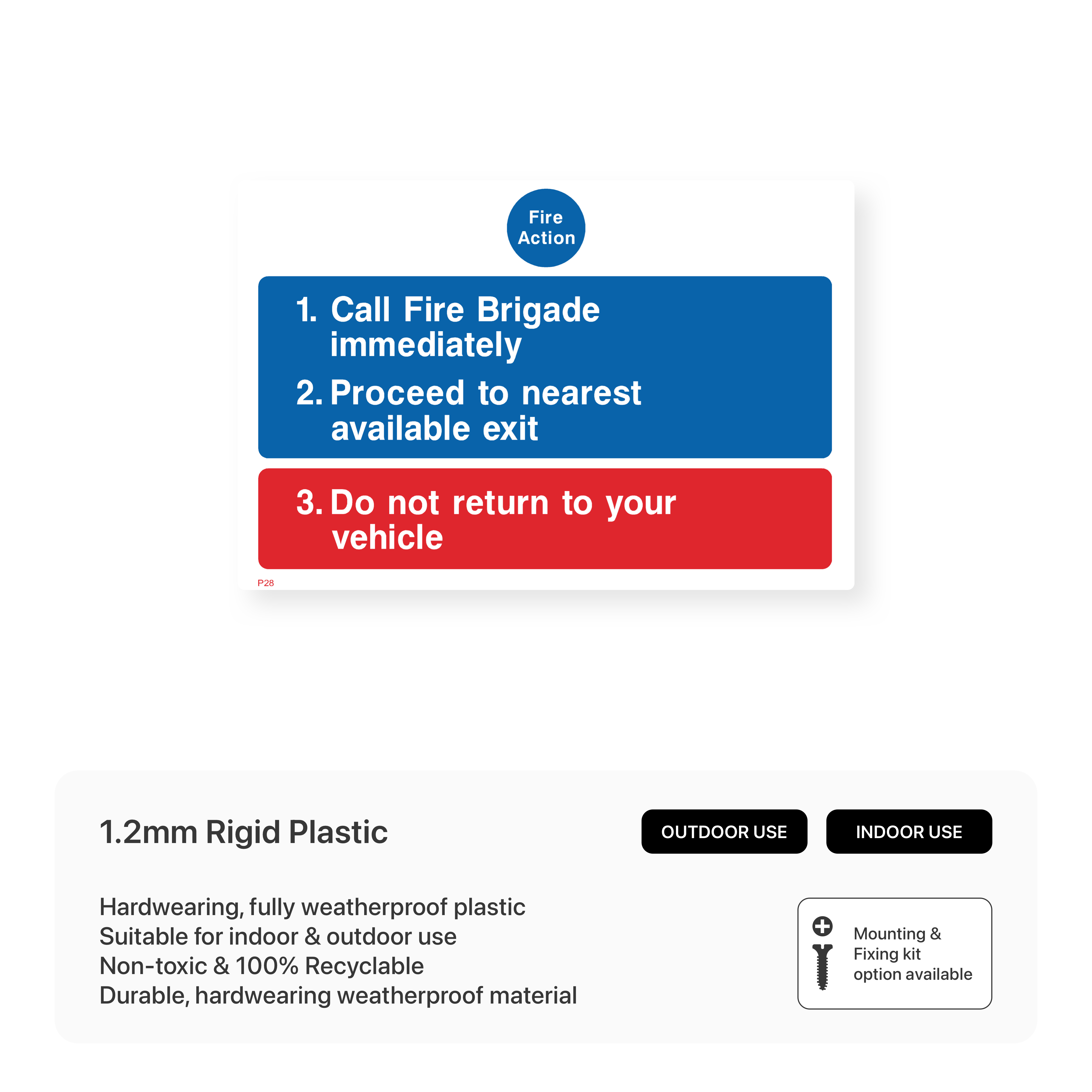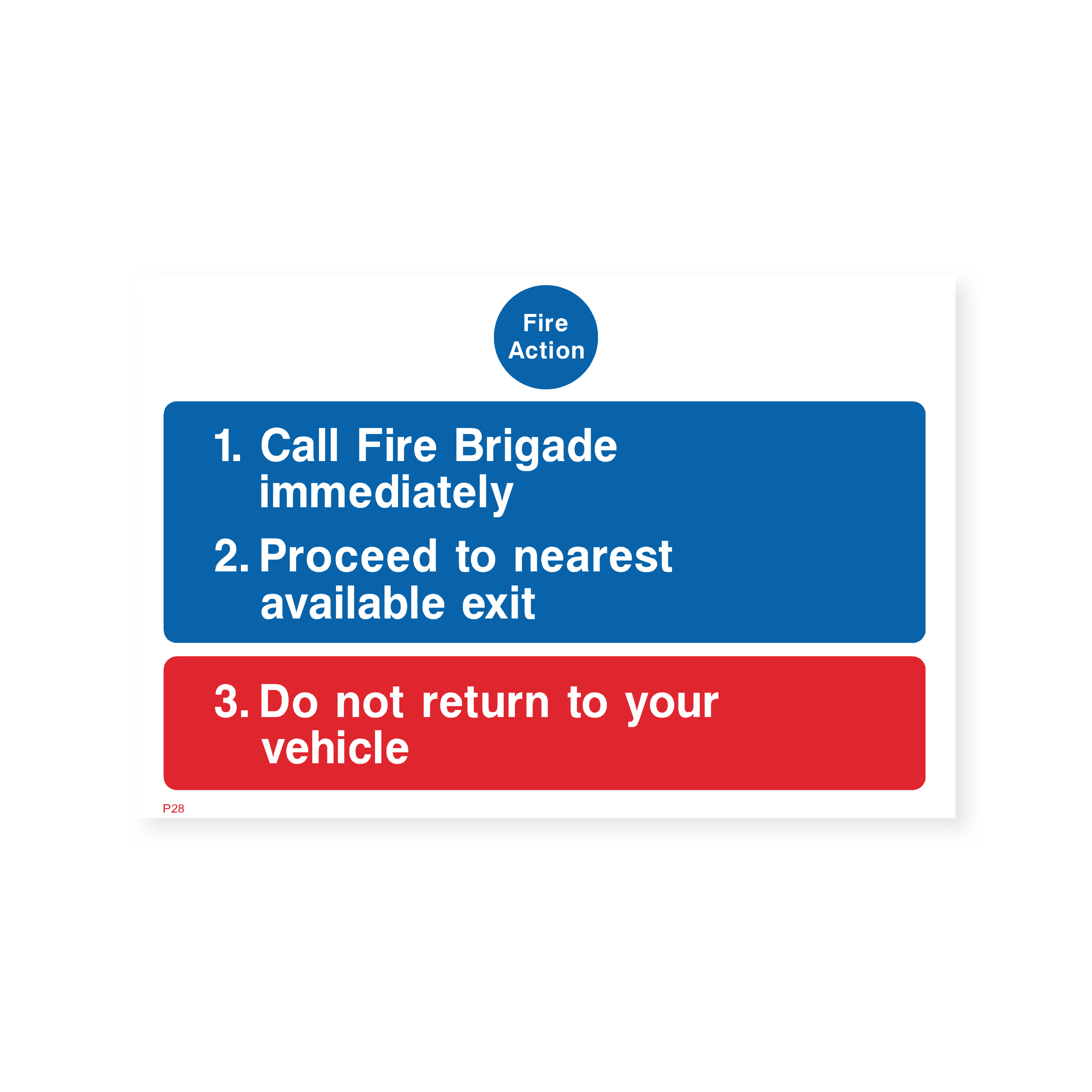 Provide clear fire safety instructions with our "Fire Action" sign. This sign outlines the necessary steps to take in case of a fire, including calling the fire brigade and evacuating the premises. Ensure the safety of your car park users with this essential sign. Choose from various sizes and materials to suit your specific needs.