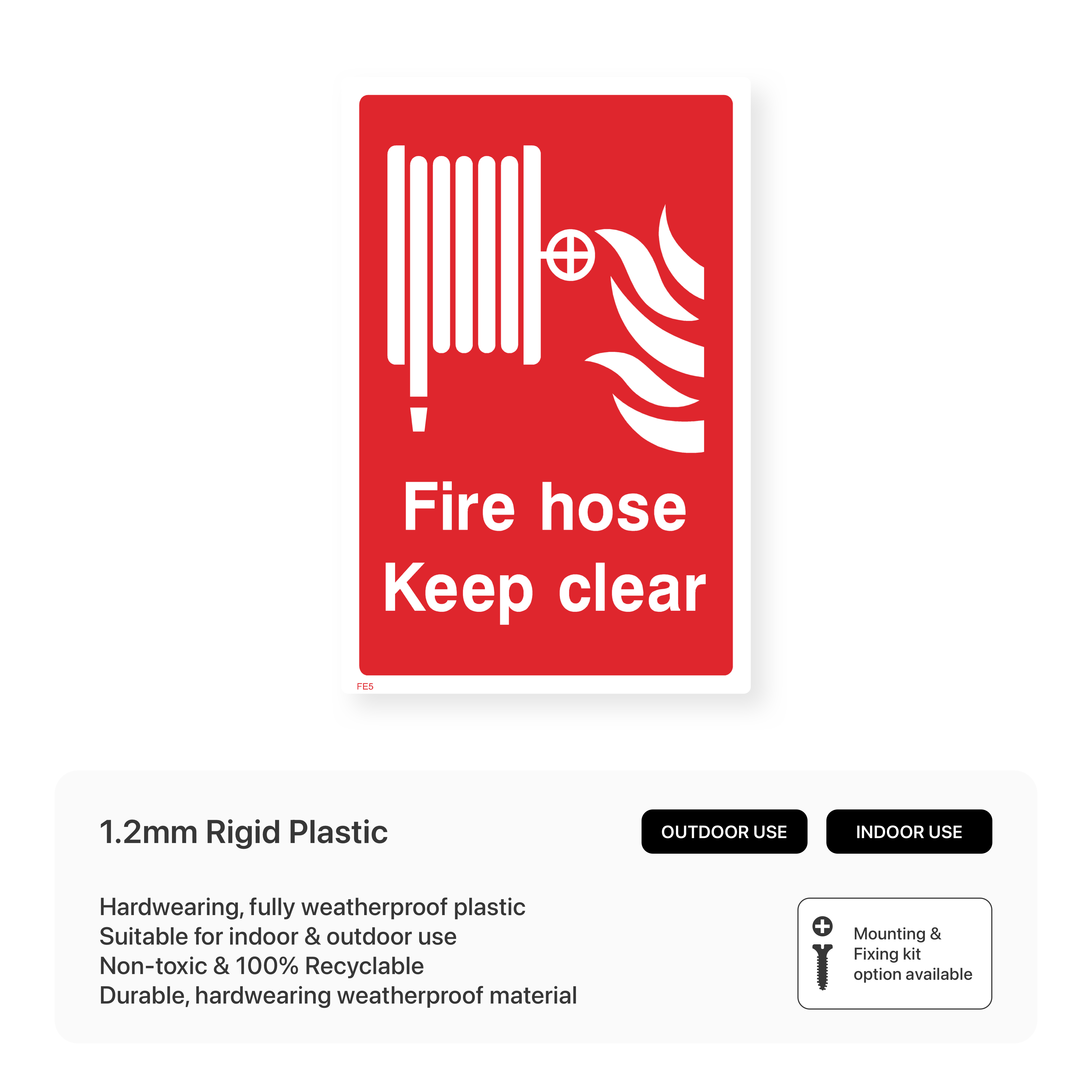 Maintain clear access to fire hoses with our "Fire hose - Keep clear" sign. This sign reminds people not to obstruct access to the fire hose, ensuring it's readily available in case of an emergency.