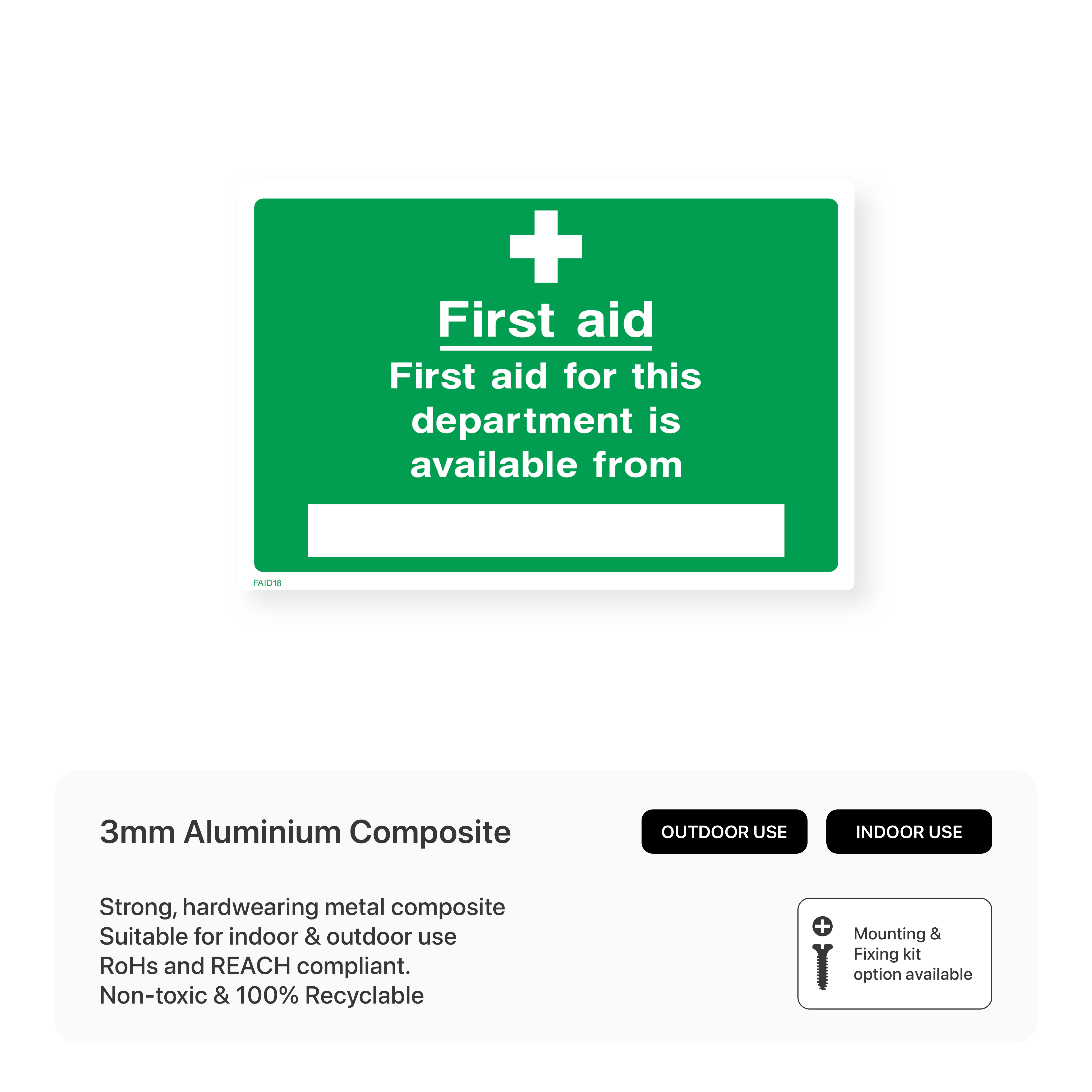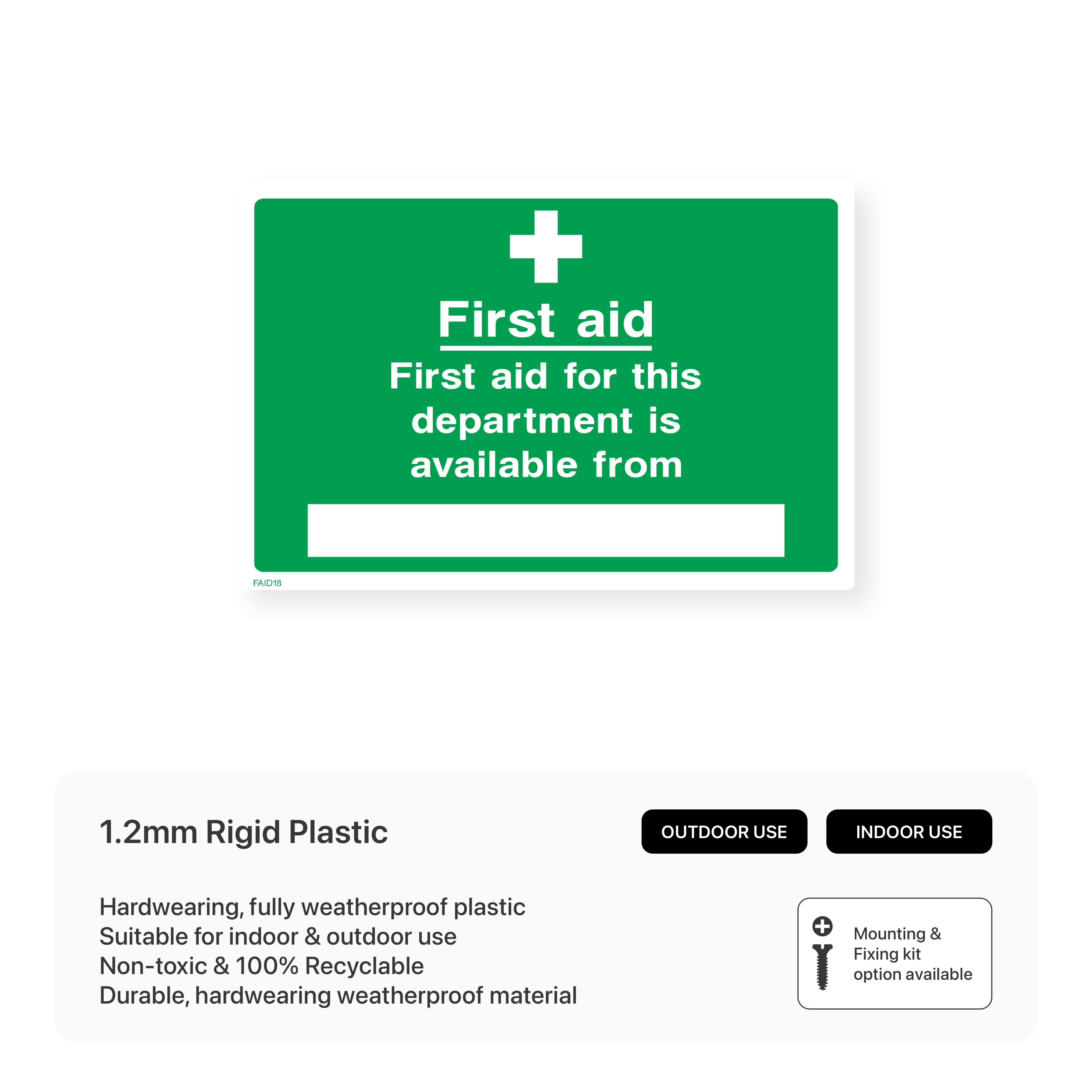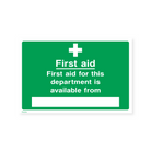 Inform individuals about the availability of first aid services with our "First aid - First aid department is available from" sign. This sign specifies the location or department where first aid can be obtained, ensuring timely medical assistance.