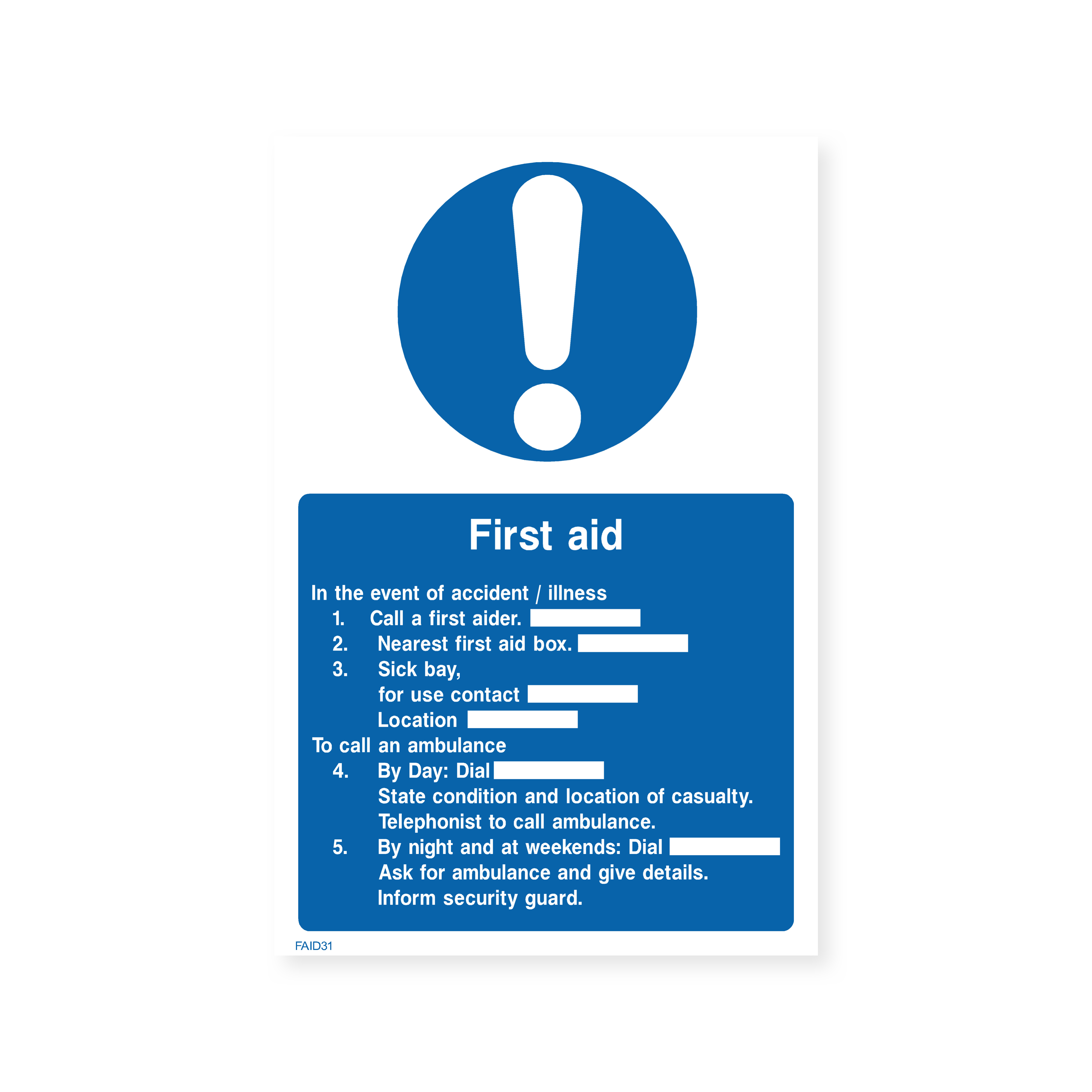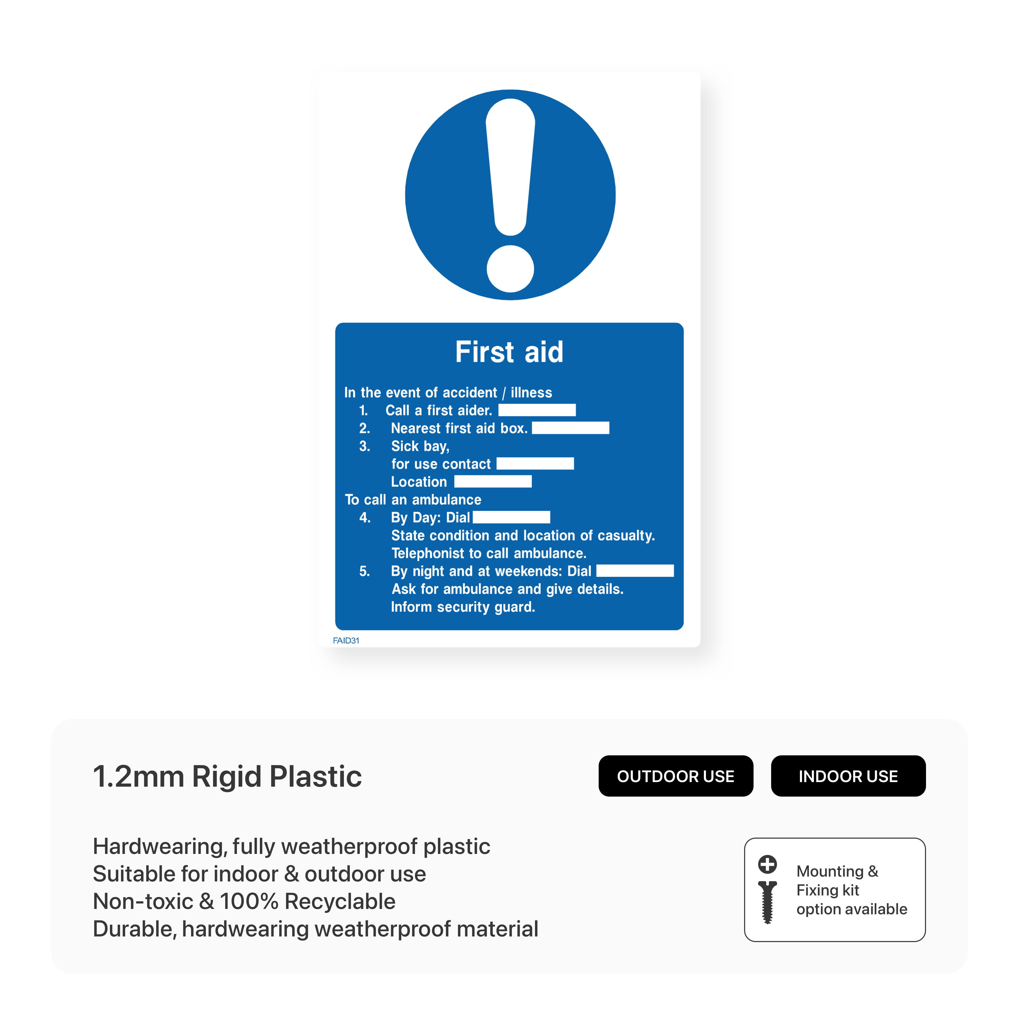 Provide clear instructions for seeking first aid in case of accidents or illnesses with our "First aid - In the event of accident / illness" sign. This sign informs individuals about the procedures to follow, ensuring prompt medical attention and minimizing risks.