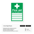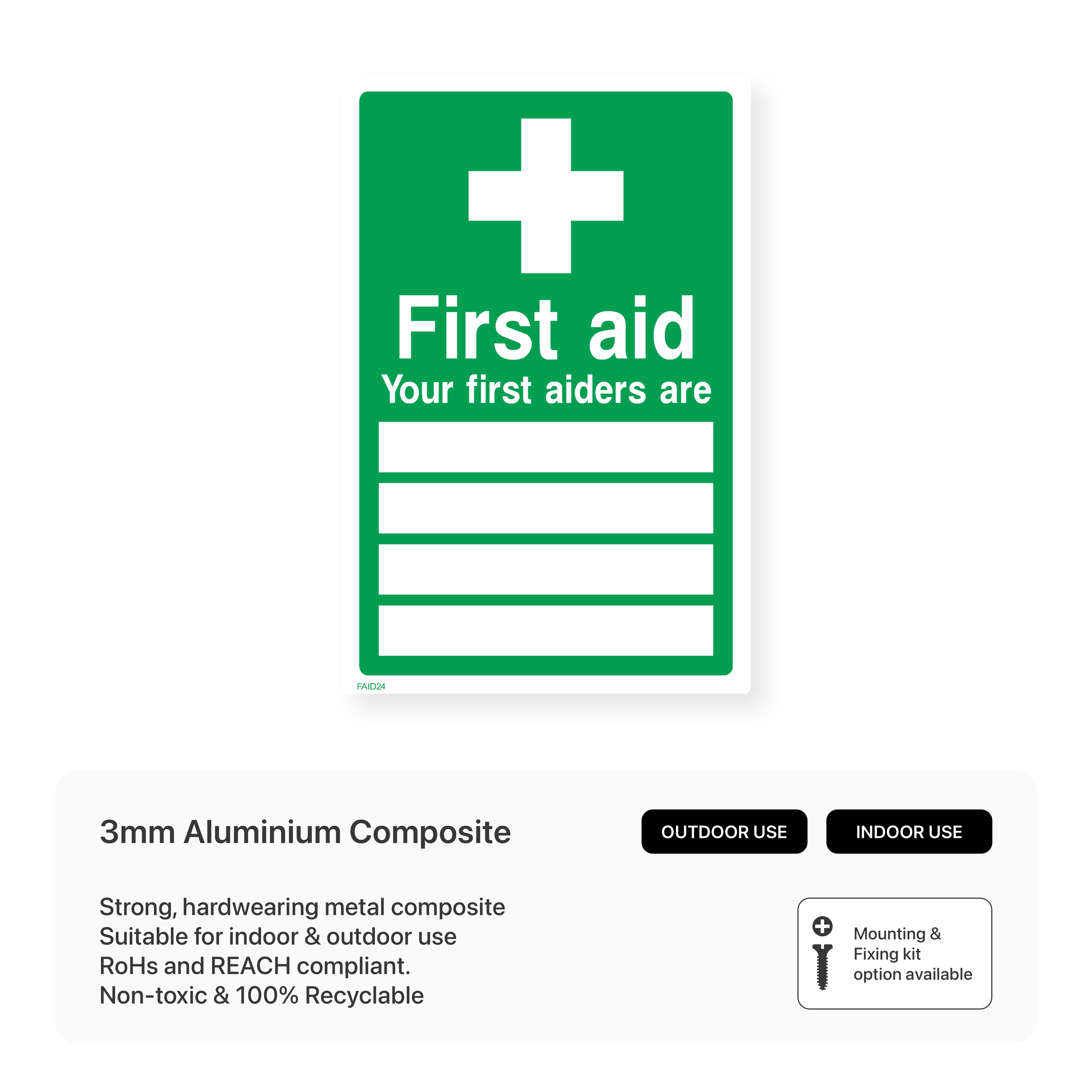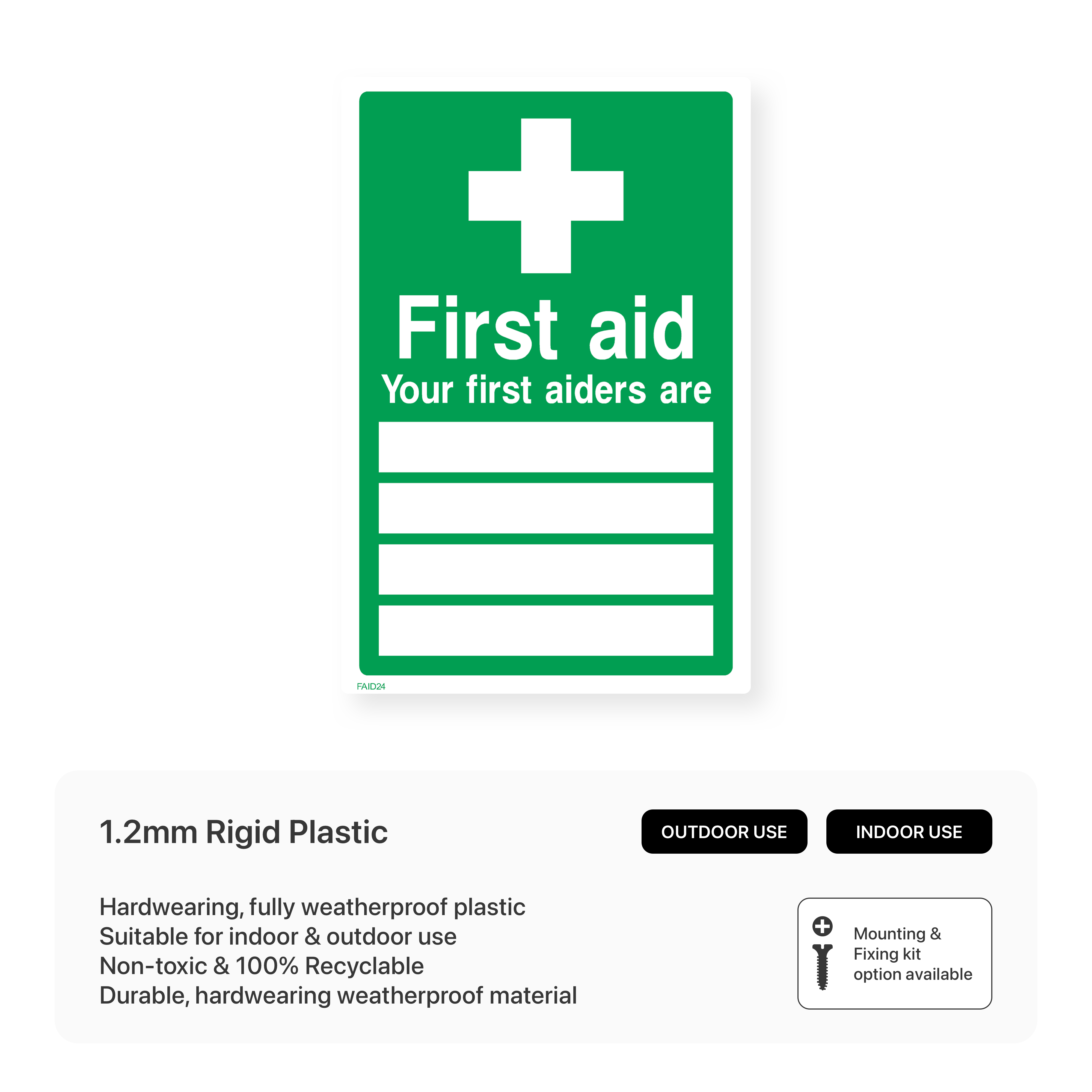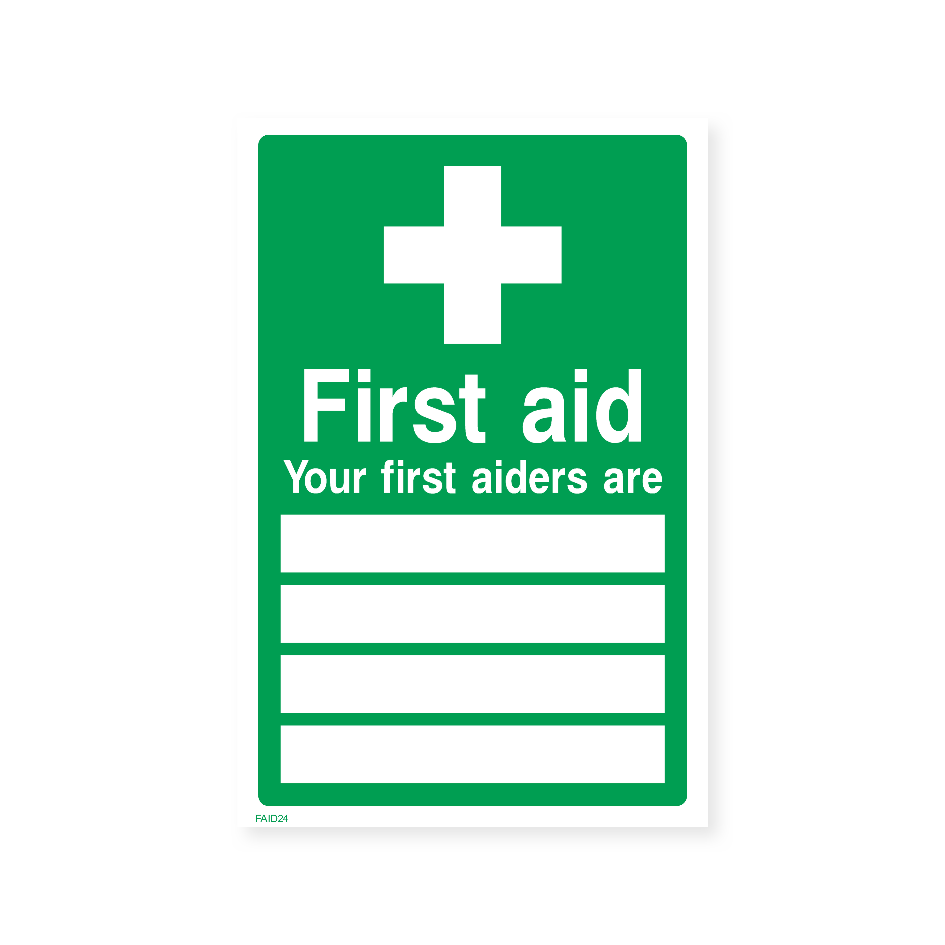 Inform individuals about the designated first aiders with our "First aid - Your first aiders are" sign. This sign lists the names or titles of the designated first aiders, ensuring that individuals know who to contact in case of an emergency.